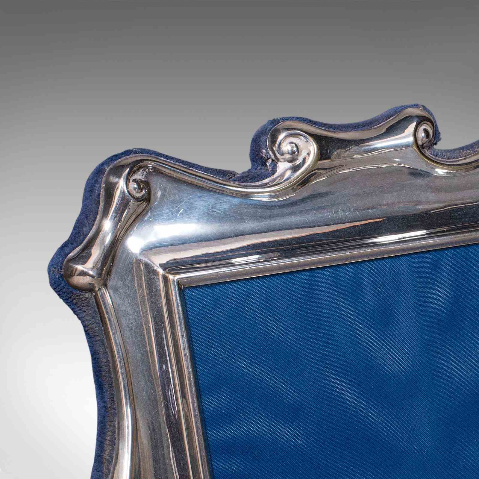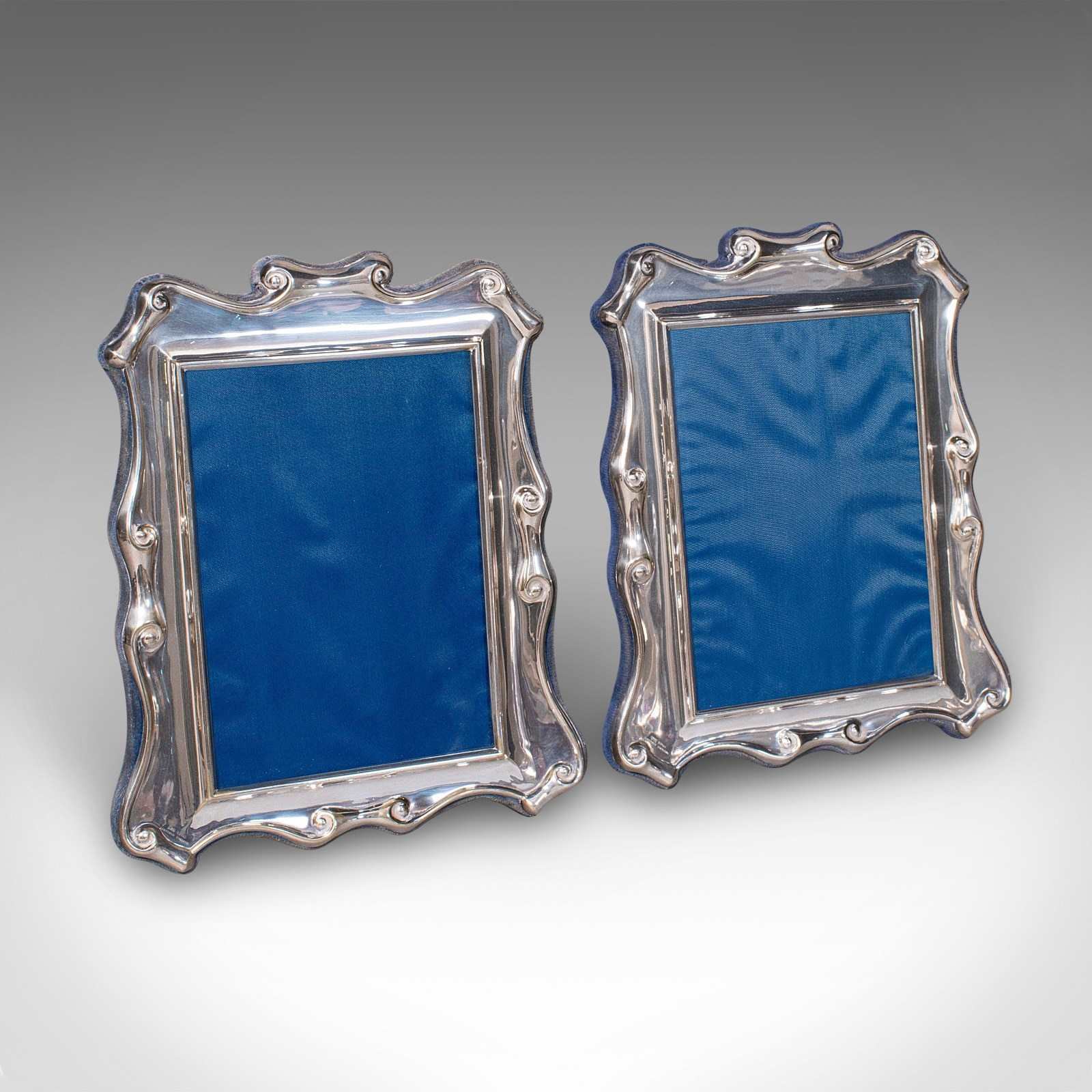 This is a pair of vintage picture frames. An English, silver plated 5x7 ratio photo display, dating to the Art Deco period, circa 1930. Charming pair of frames with a quality appearance and useful profile.