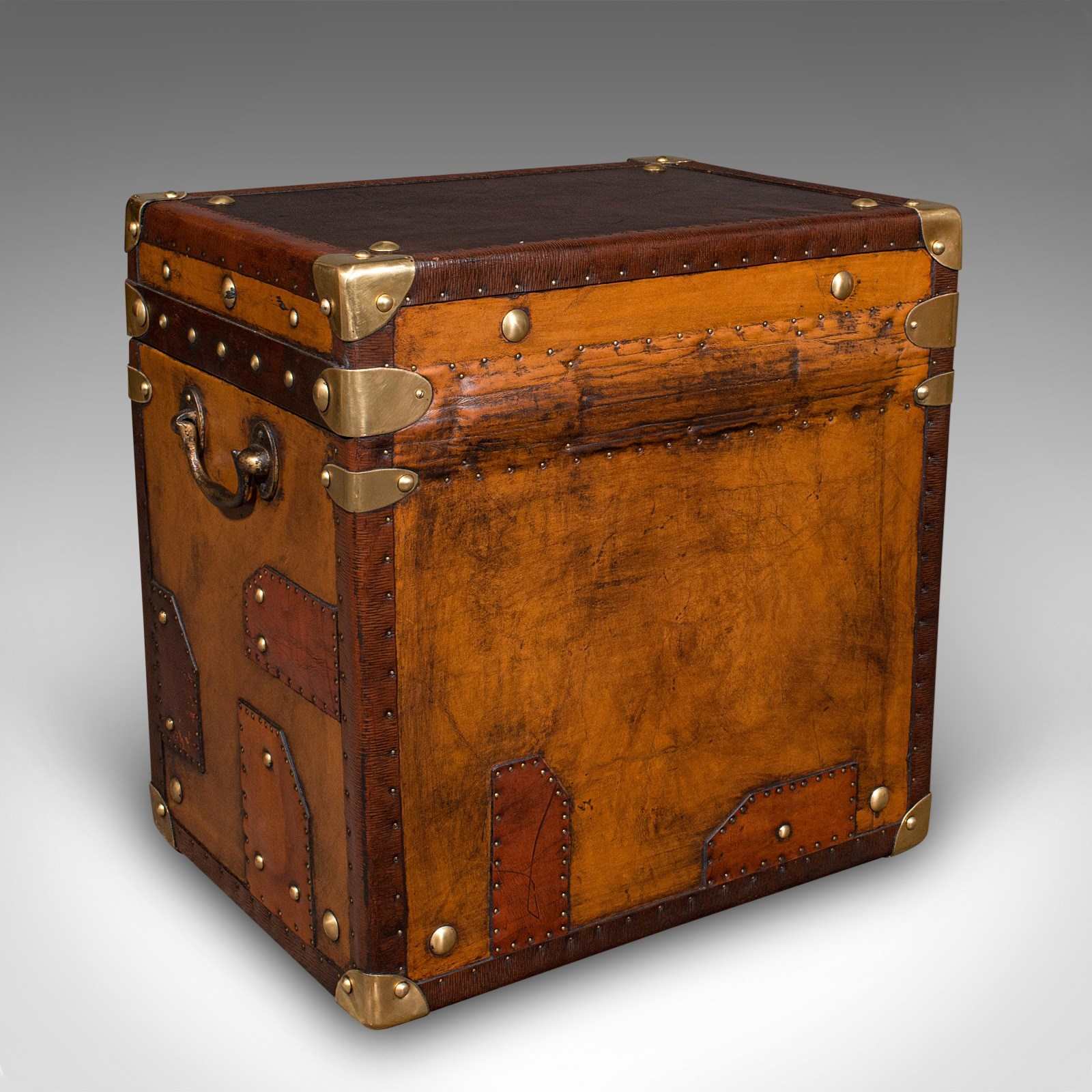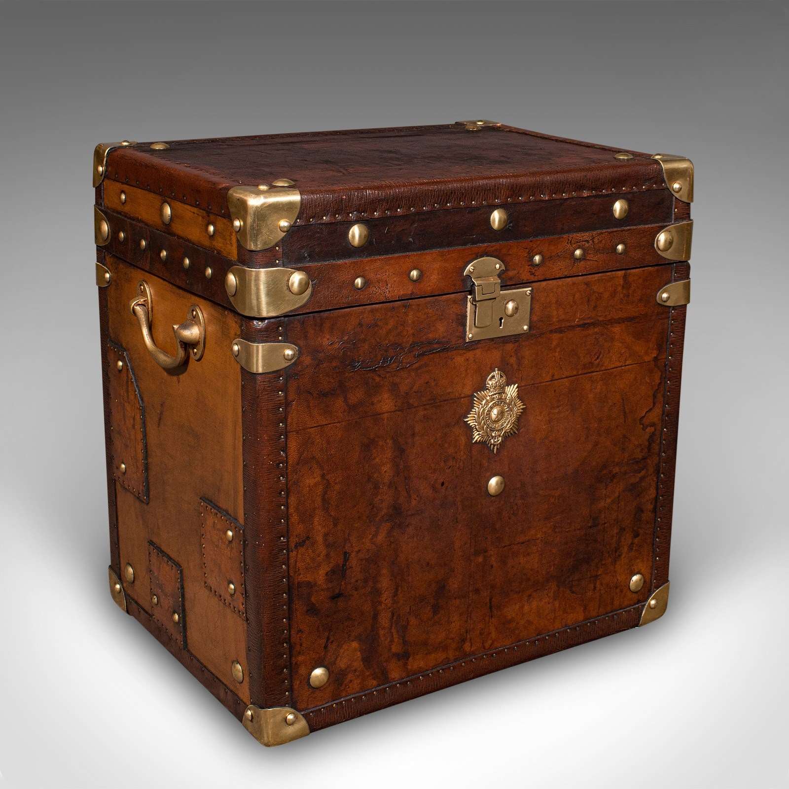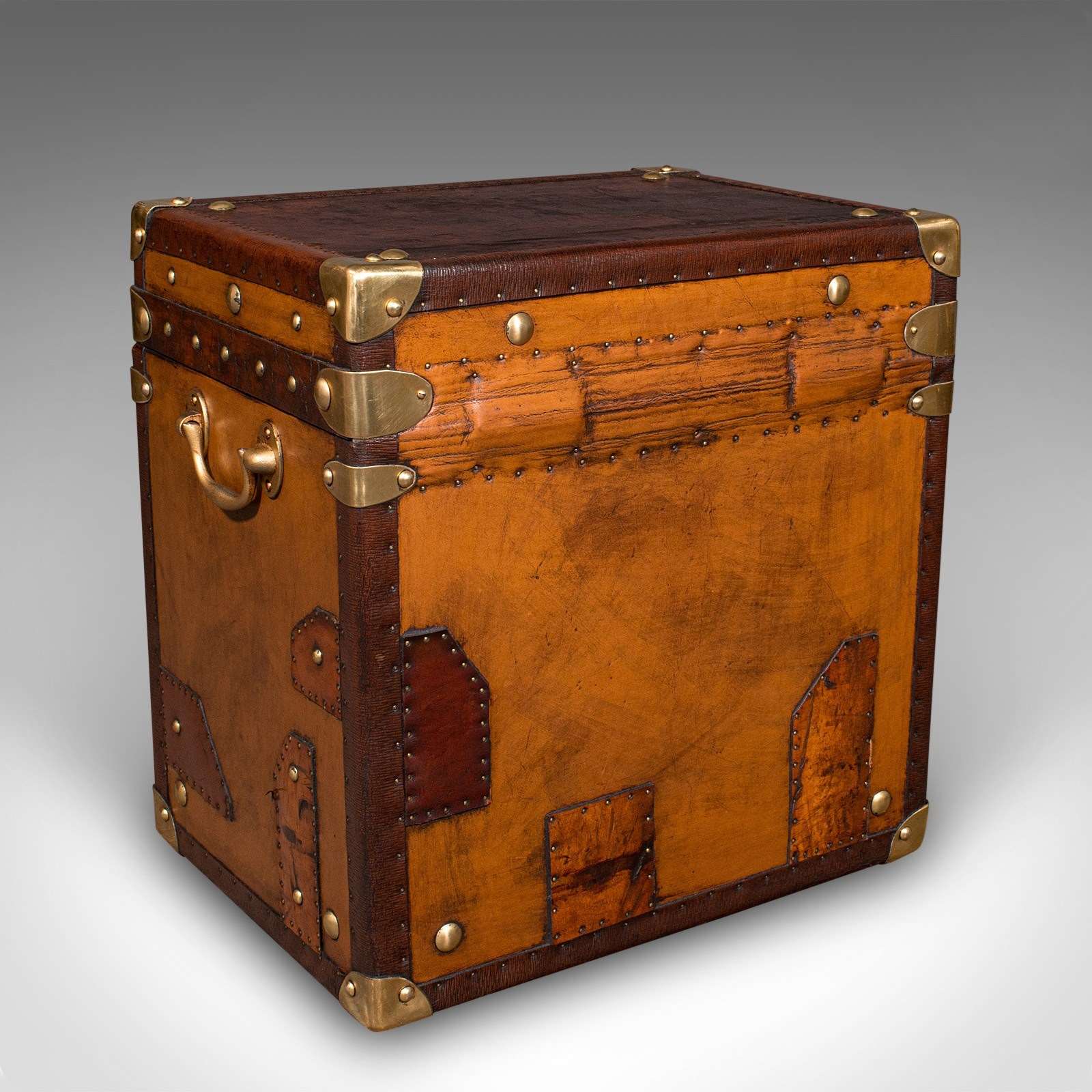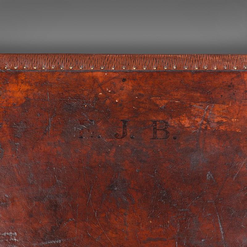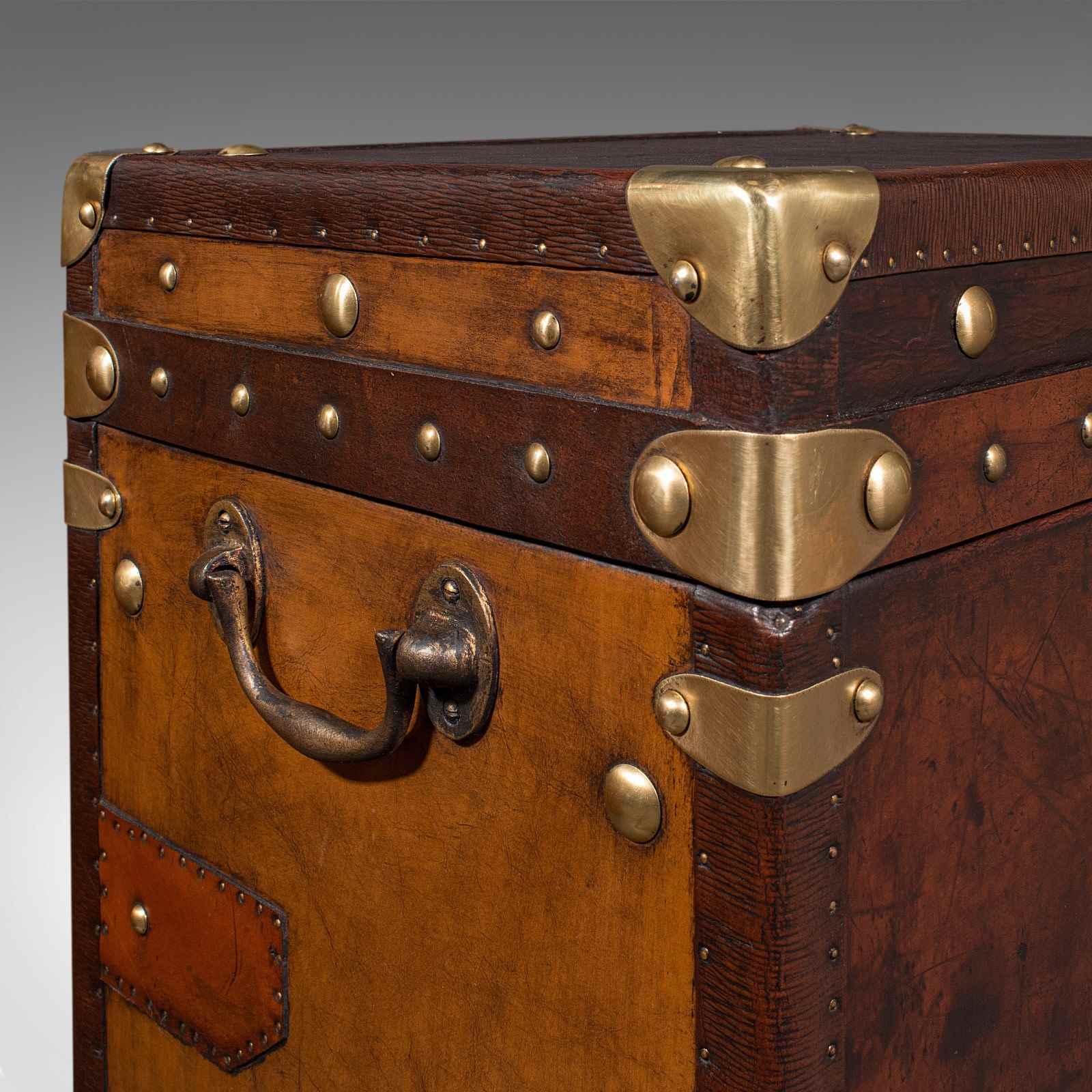 - Bound to corners with brass cappings over leather straps