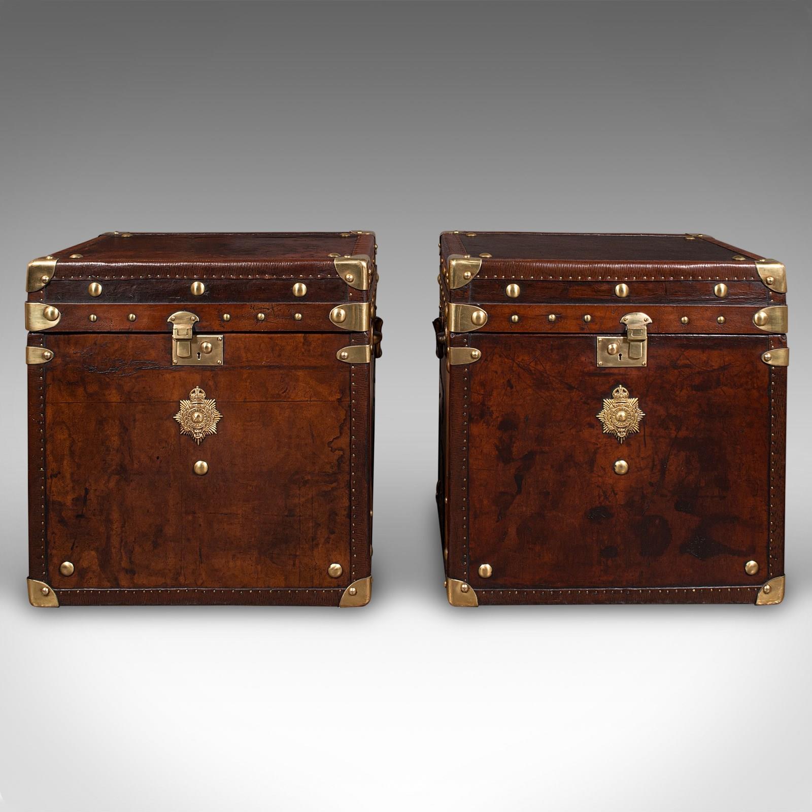 This is a wonderful pair of vintage officer's campaign luggage cases, the clean appearance and proportion presenting a fine opportunity to use them as distinctive bedside nightstands. Delivered polished and ready to enjoy.