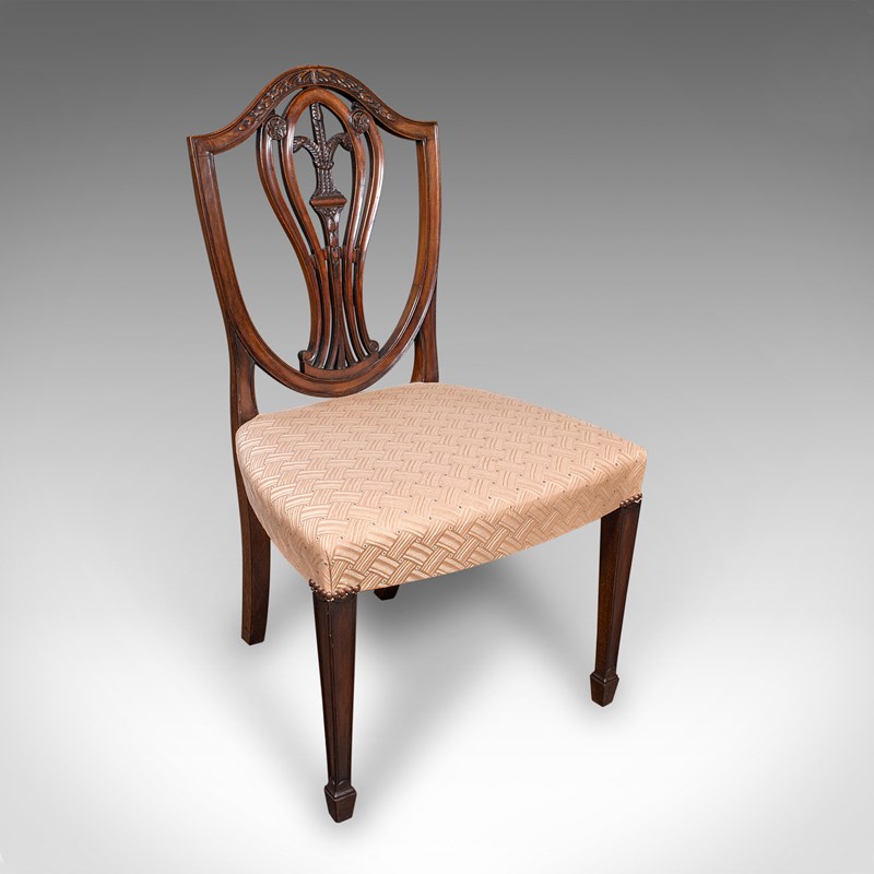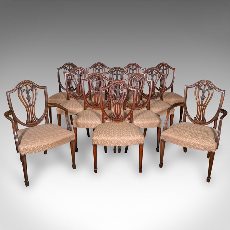A magnificent set of 12 Hepplewhite style dining chairs, offering superb craftsmanship and timeless elegance. Rich in detail and colour, this Edwardian suite would grace the finest dining room or country house, representing an exceptional example of early 20th century revival furniture. Solid joints and construction, delivered waxed, polished and ready for the home.