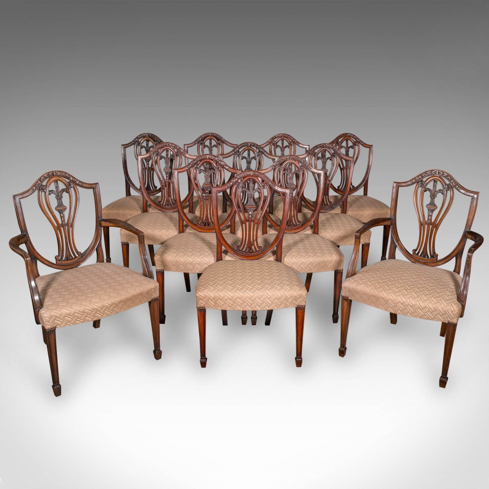 Set Of 12 Antique Dining Chairs, English, Carver, Seat, Hepplewhite, Edwardian