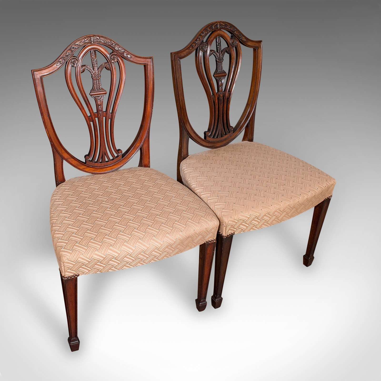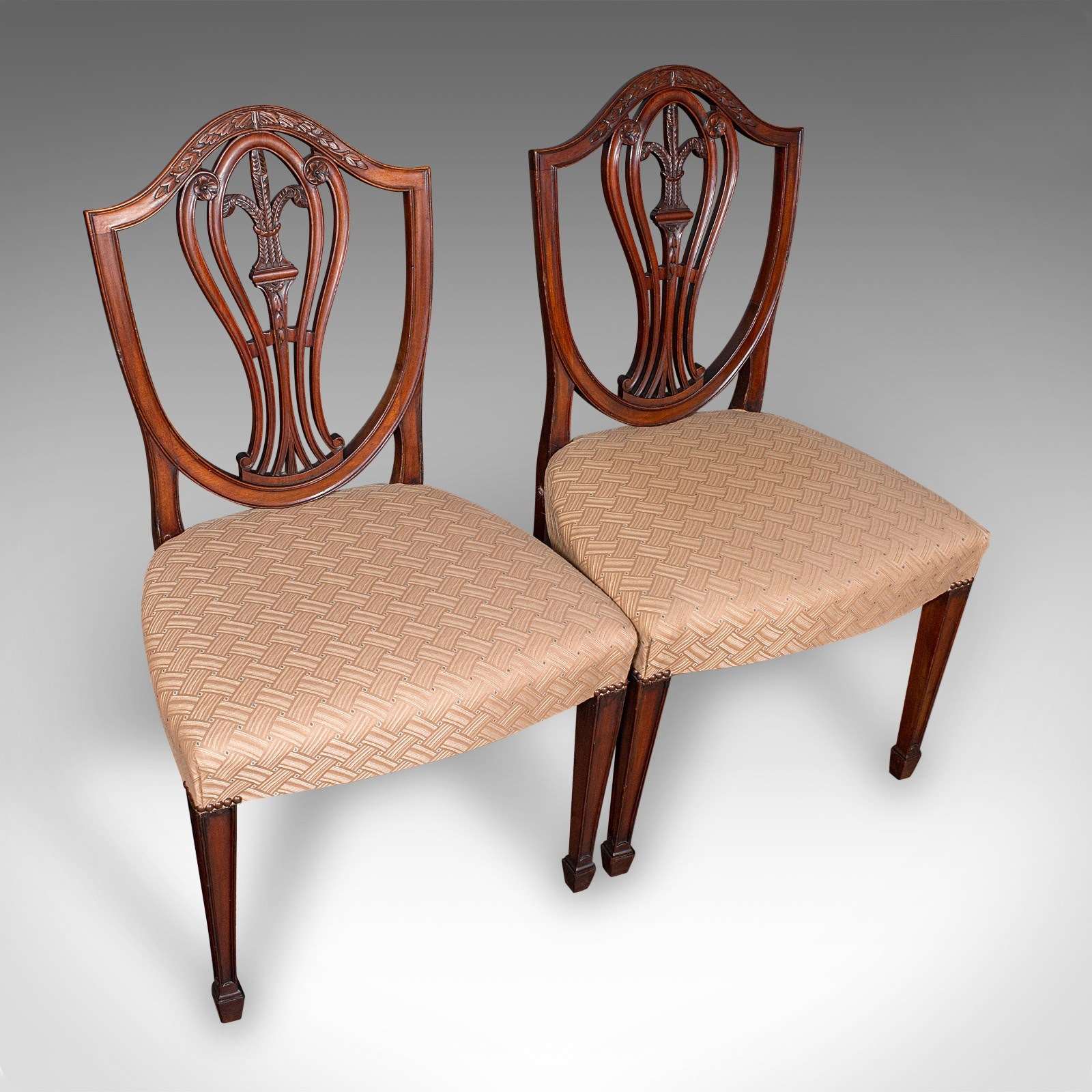 Distinctive Hepplewhite backrests feature a wheatsheaf motif set within a spade-shaped splat