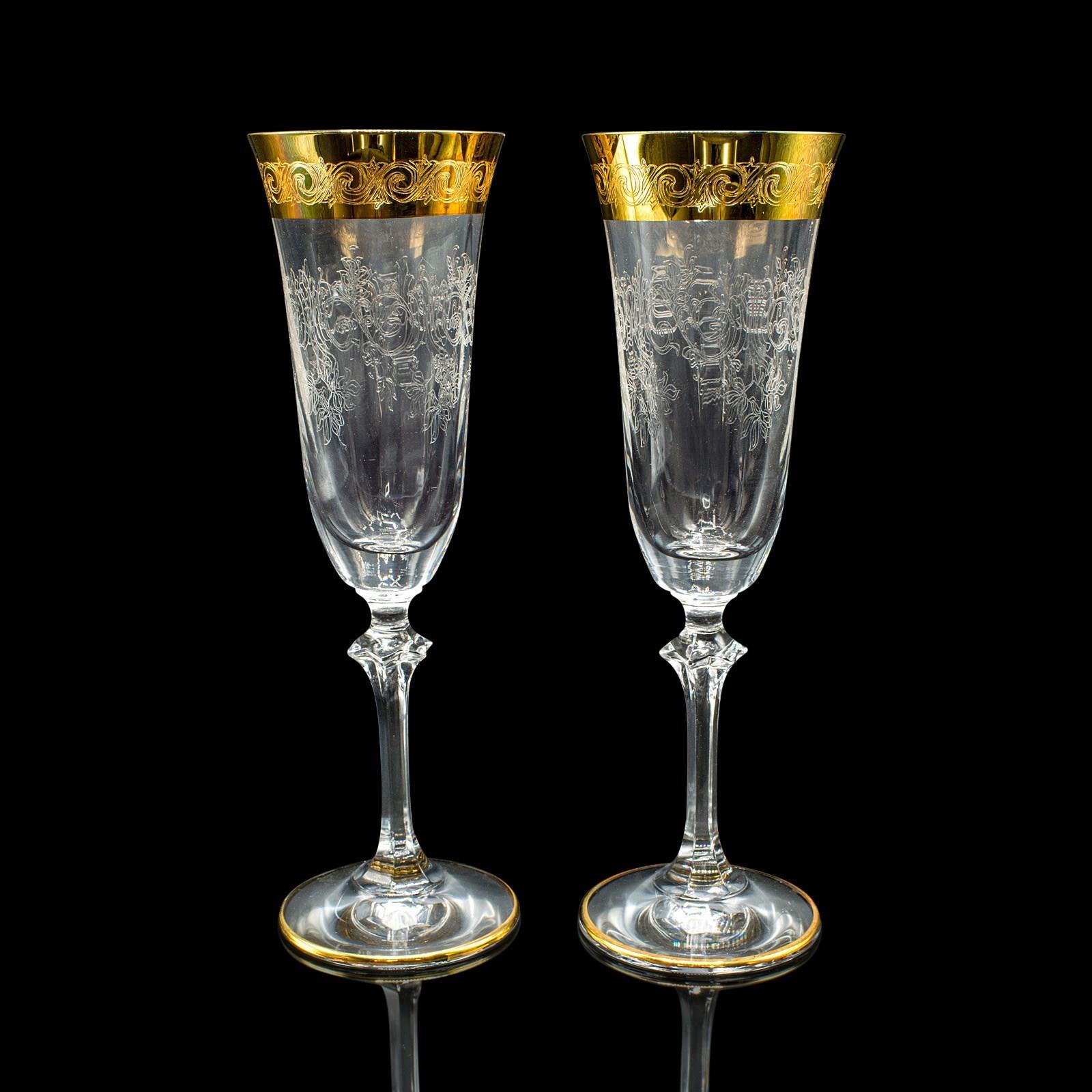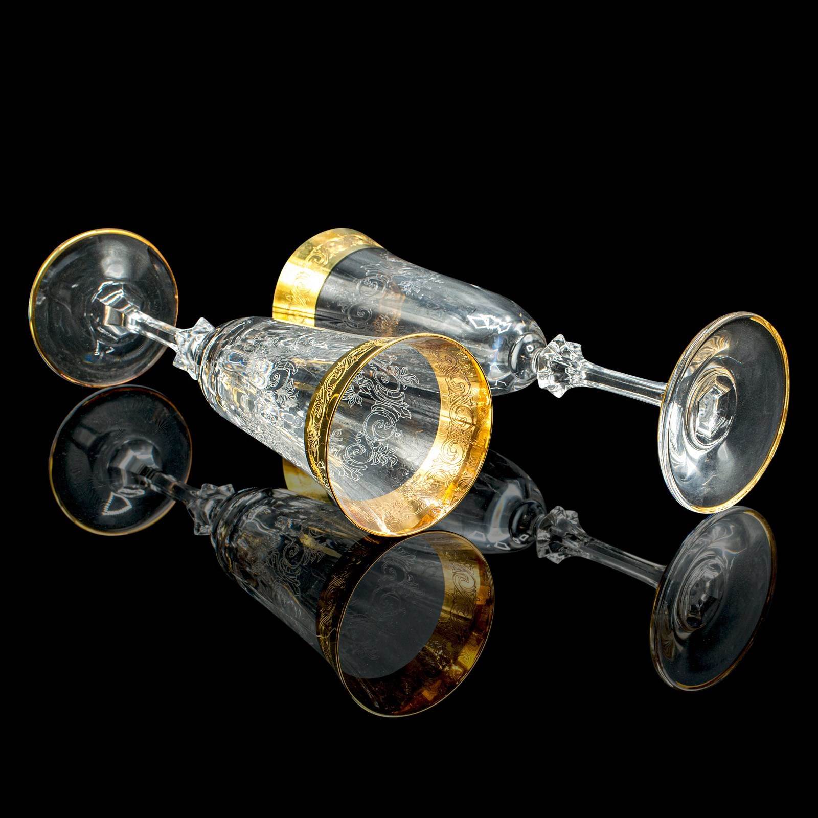 This is a striking set of 12 vintage champagne flutes. A Continental, gold leaf coated wine glass suite, dating to the late 20th century, circa 1980. Wonderfully decorative with gilded accents and etched motif, perfect for celebratory occasions or refined display.