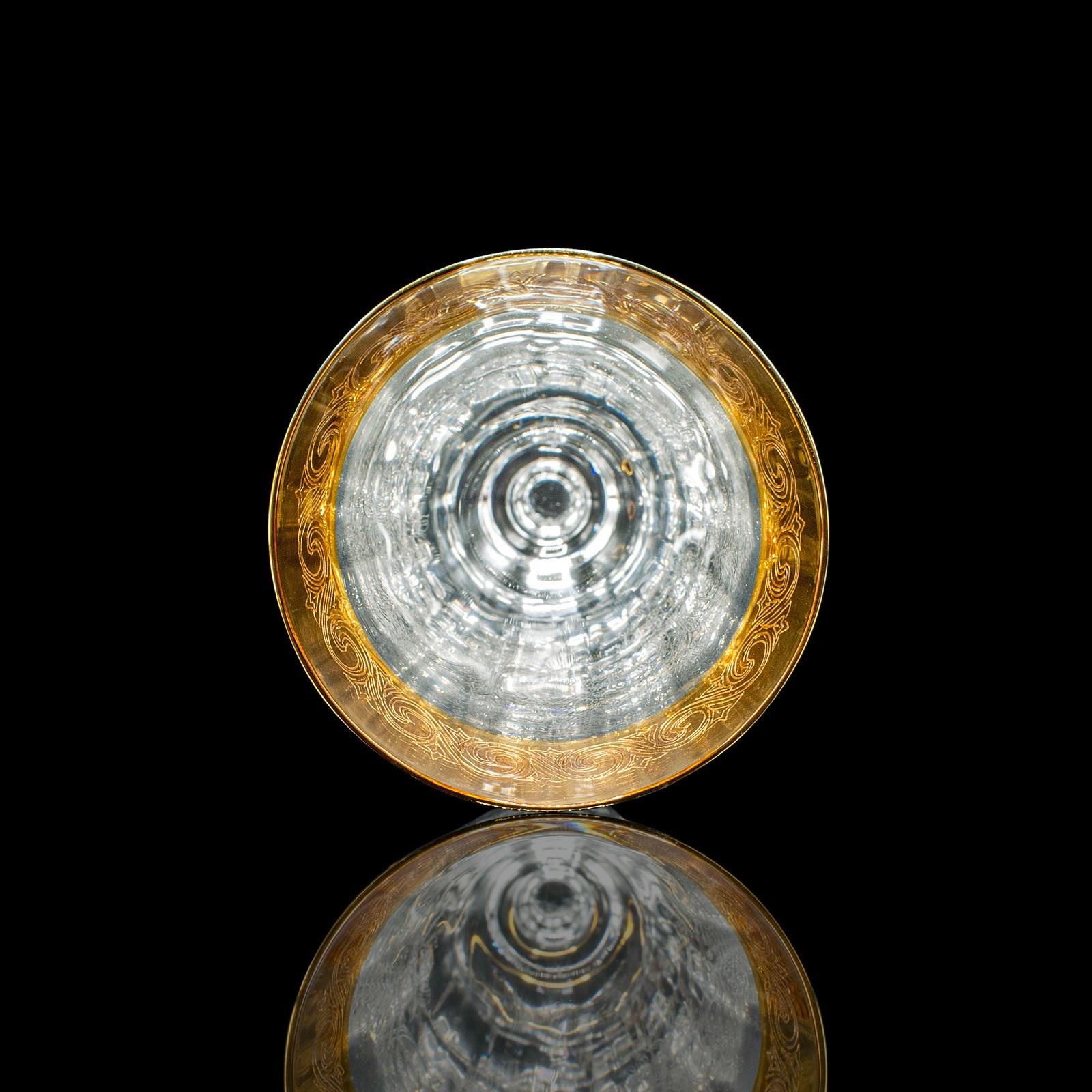 Clear glass enhanced with a bold, gold leaf rim offering bright golden tones