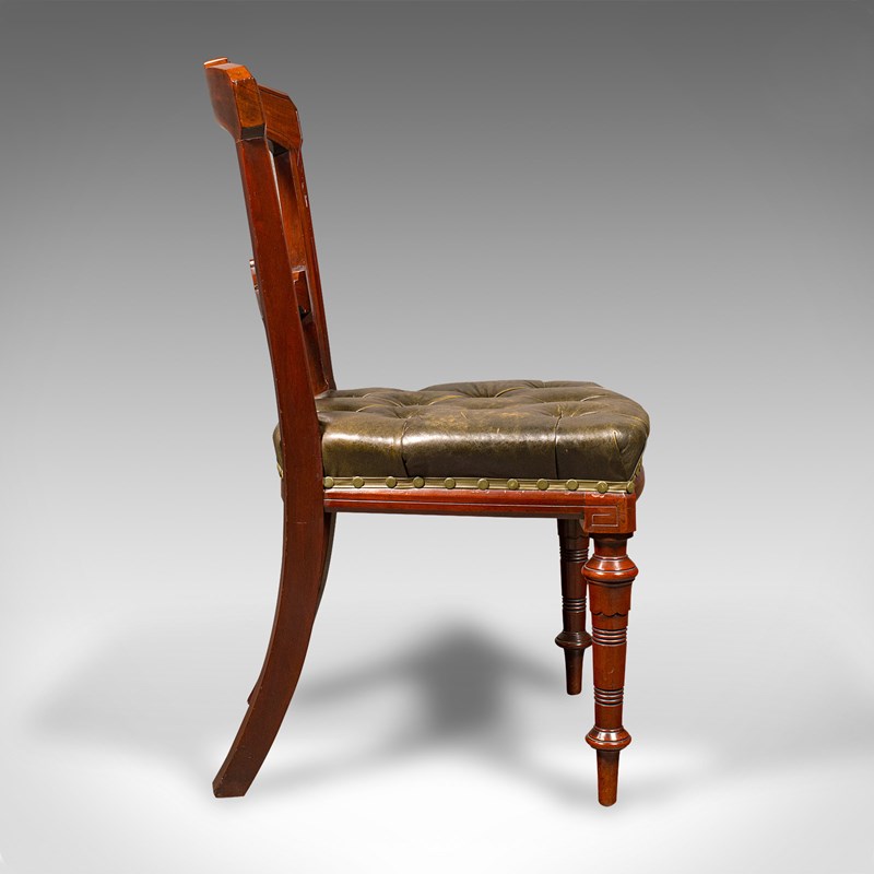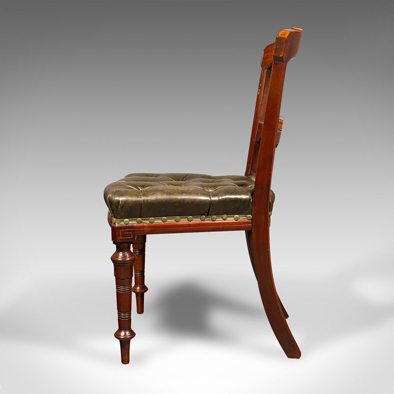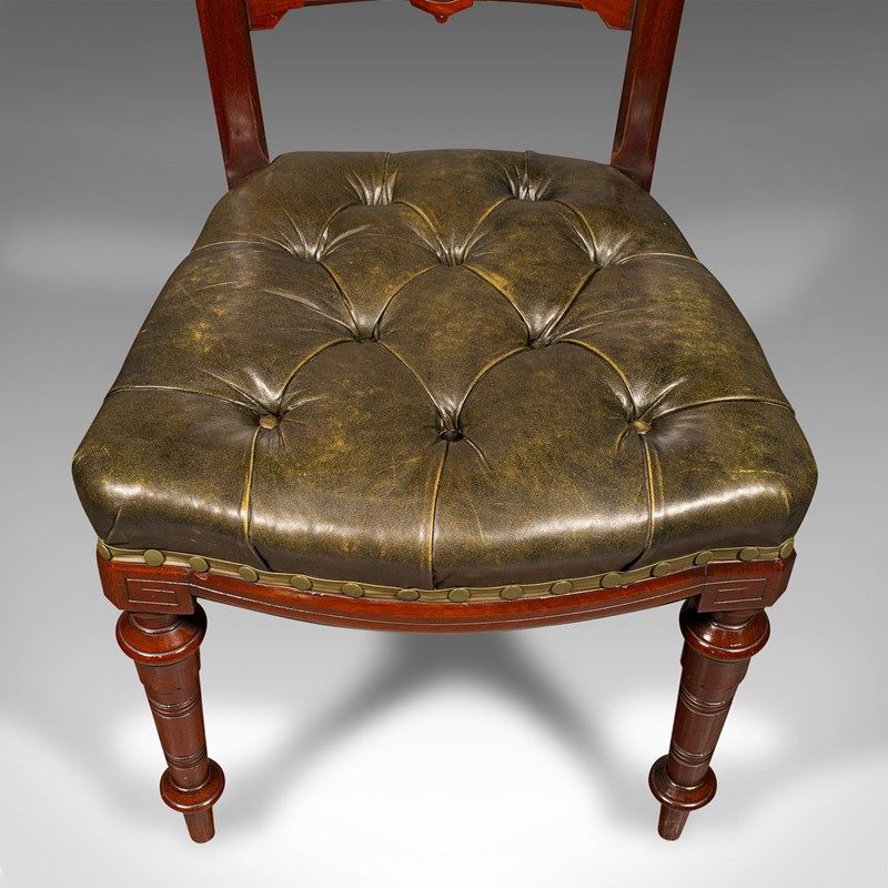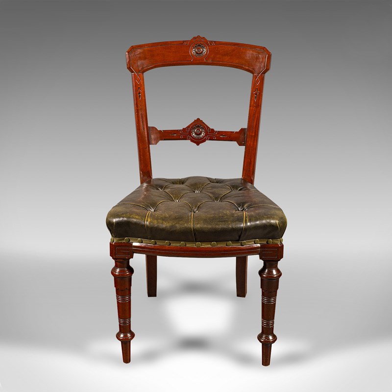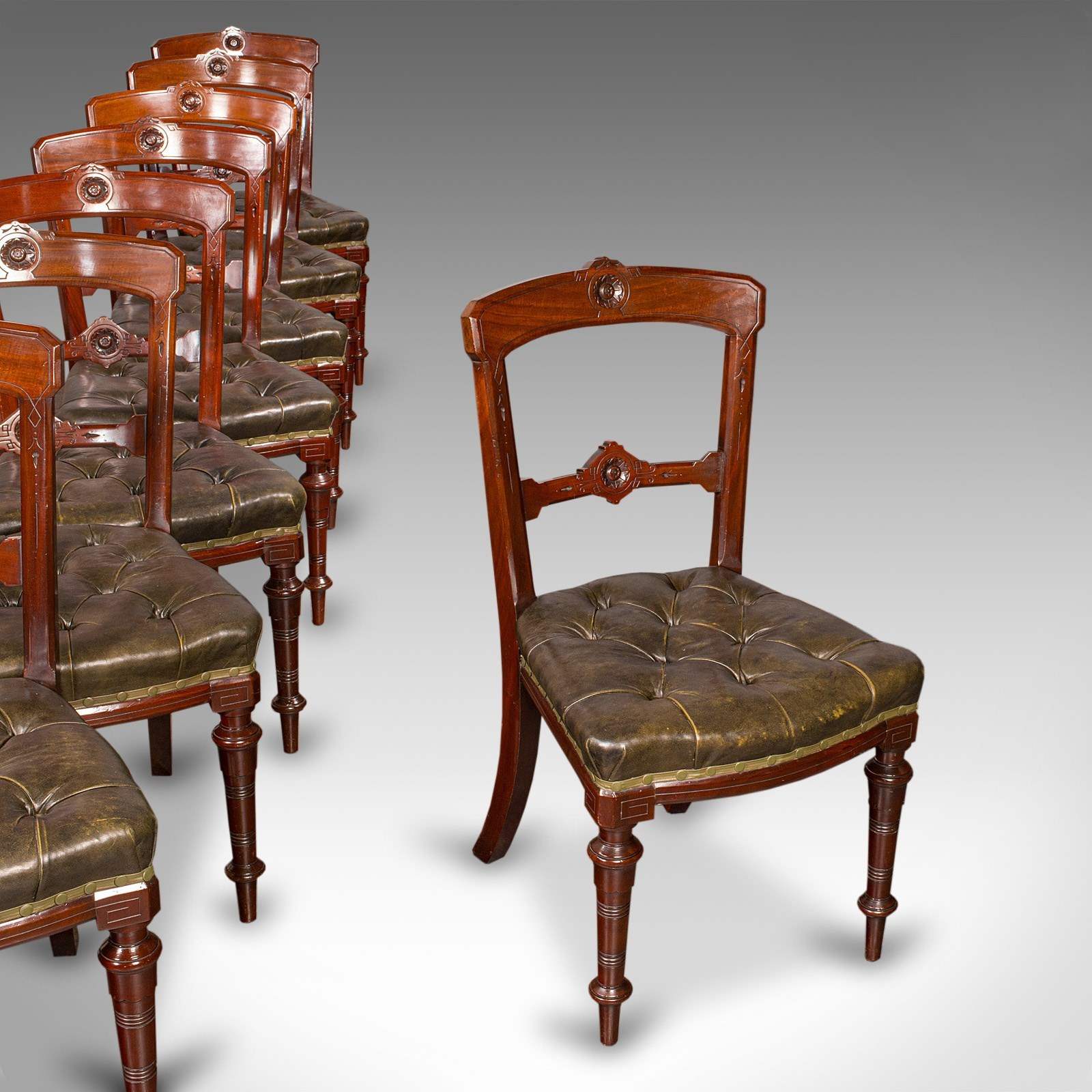 This is a suite of 8 Antique Dining Chairs. An English, walnut and leather covered seat, dating to the Victorian period, circa 1870.