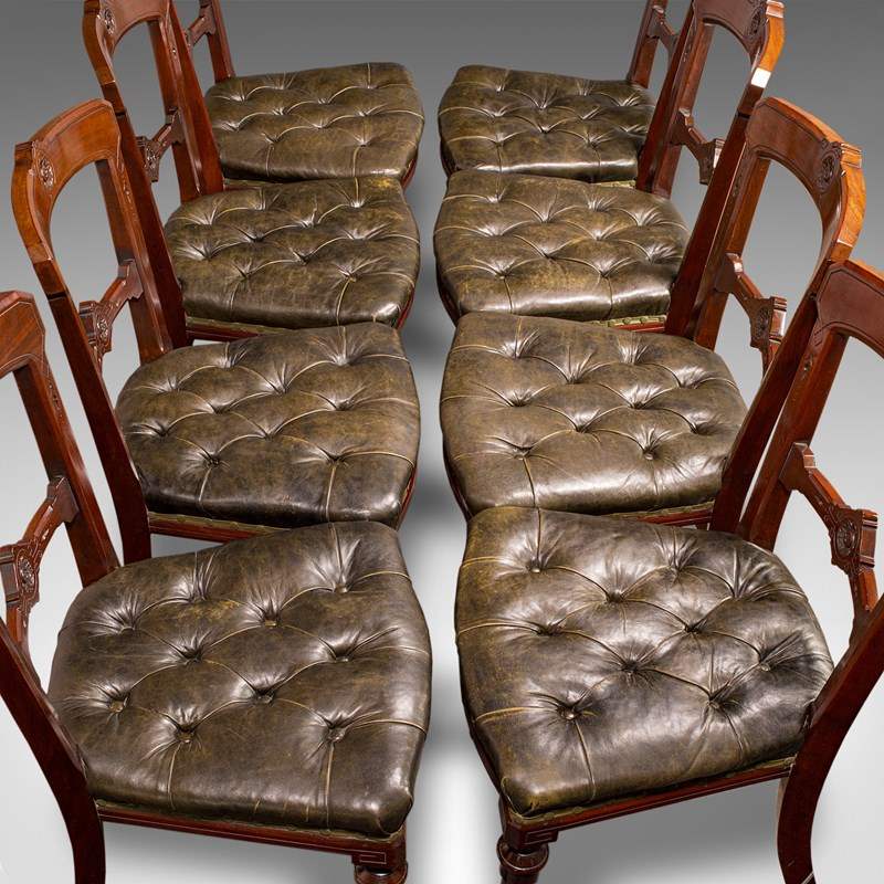 This is a delightful set of 8 antique dining chairs, with a wonderful buttoned leather cushion and striking walnut frames. A treat for the larger dining room. Solid joints and construction, delivered ready for the home.