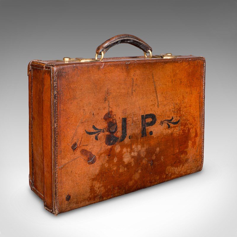 This is a small antique clerk's suitcase. An English, leather attaché case, dating to the late Victorian period, circa 1900.
