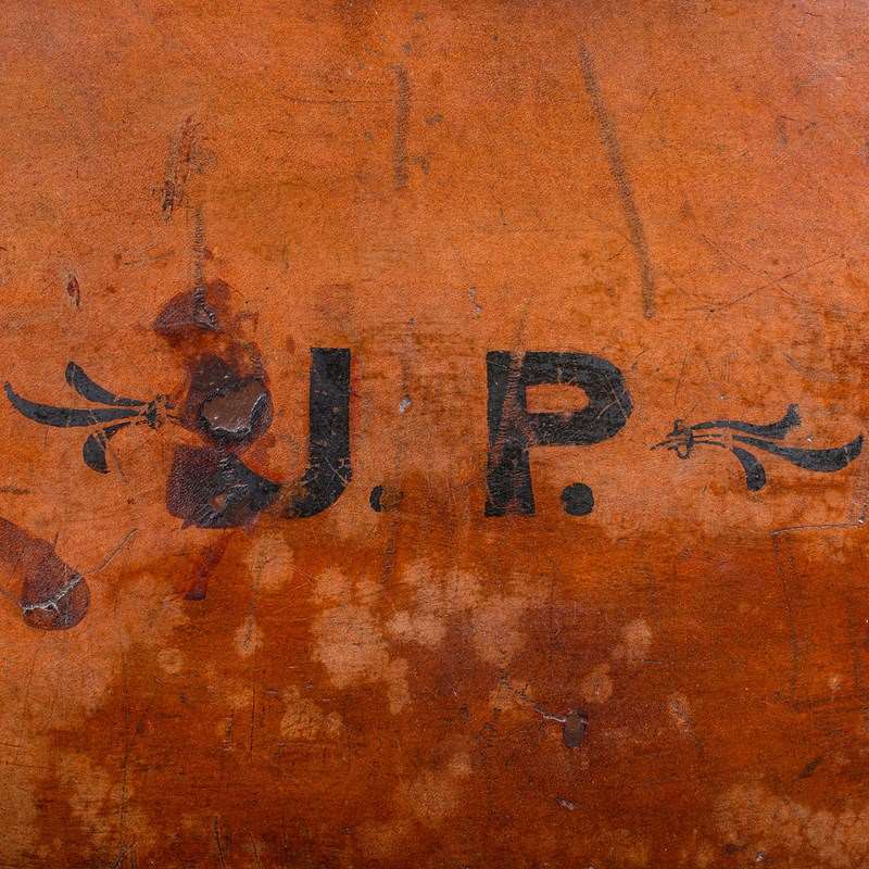 Dressed with brass rotating latch clasps to secure the contents — key absent