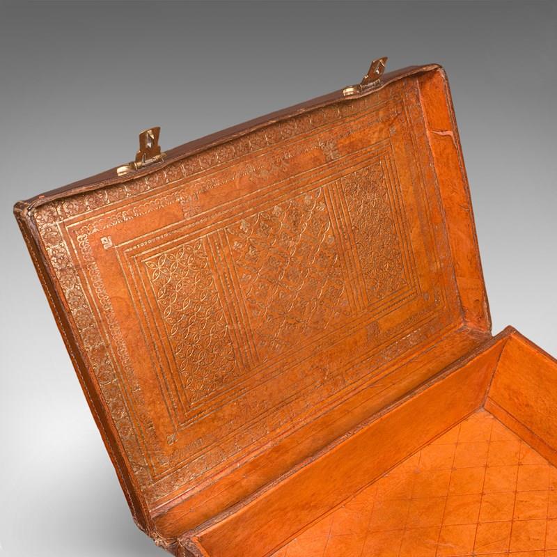 Lid interior hosts a gilt tooled and embossed lining with geometric pattern work