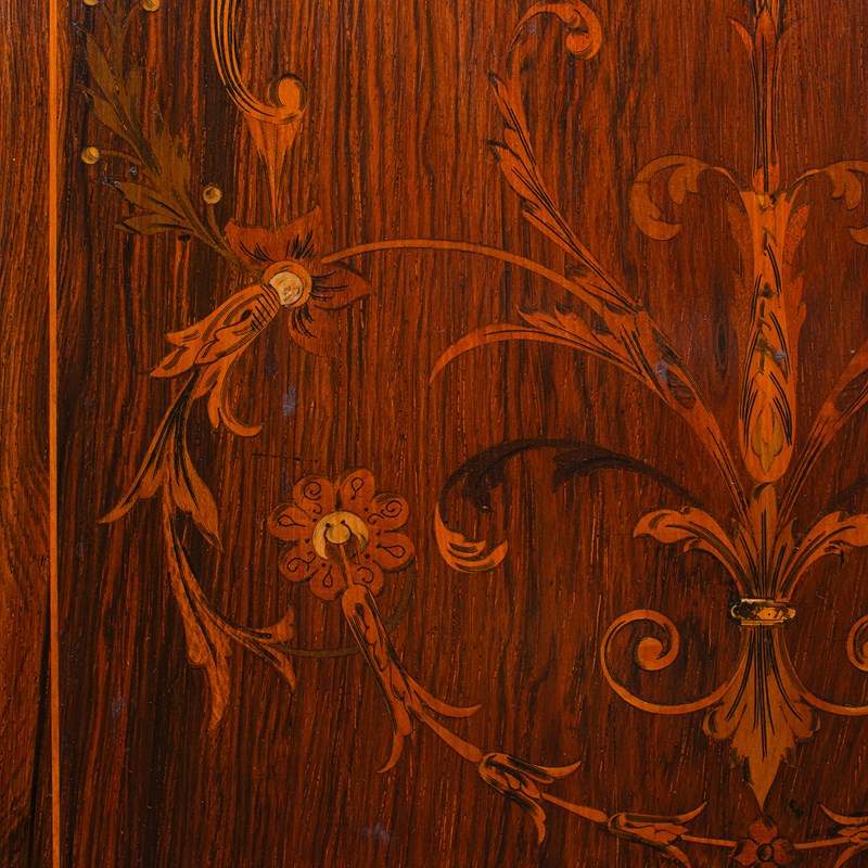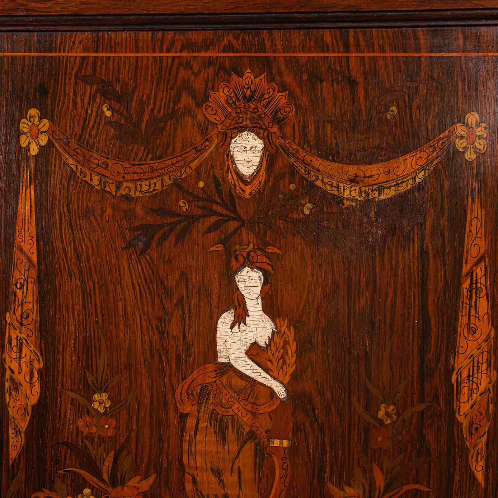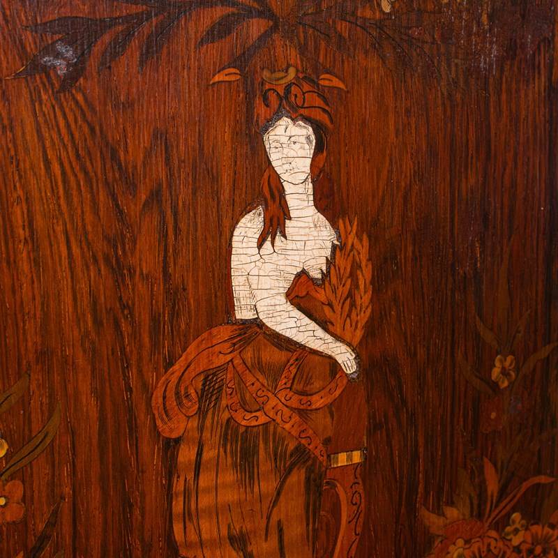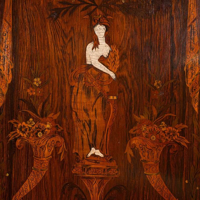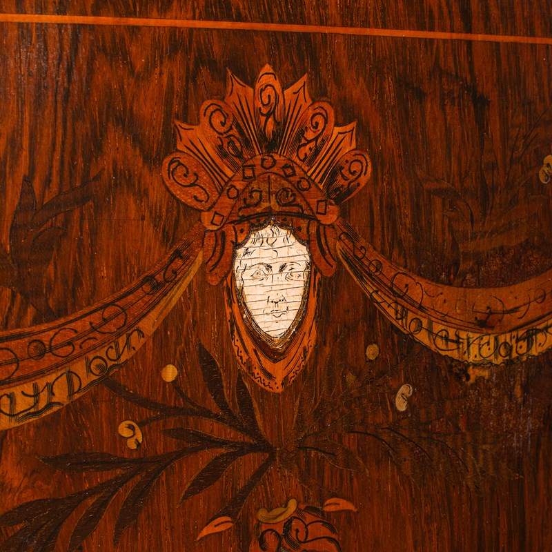 Door fascia hosts exceptional inlay, with figural and foliate motif, hand-finished with refined detailing