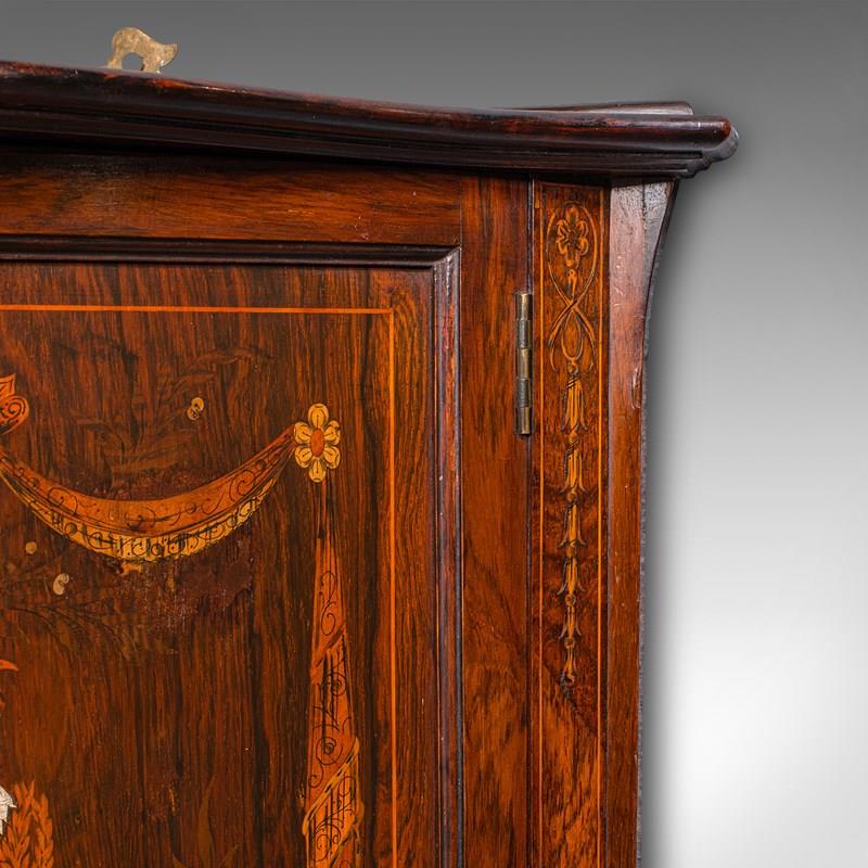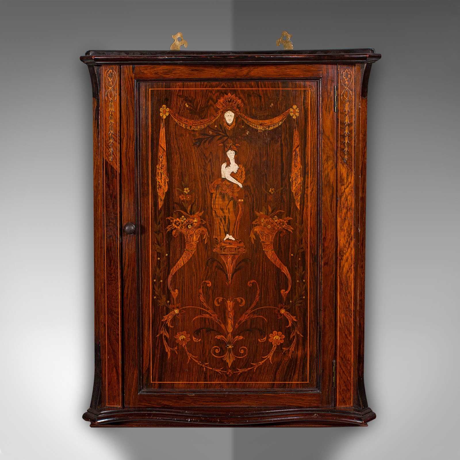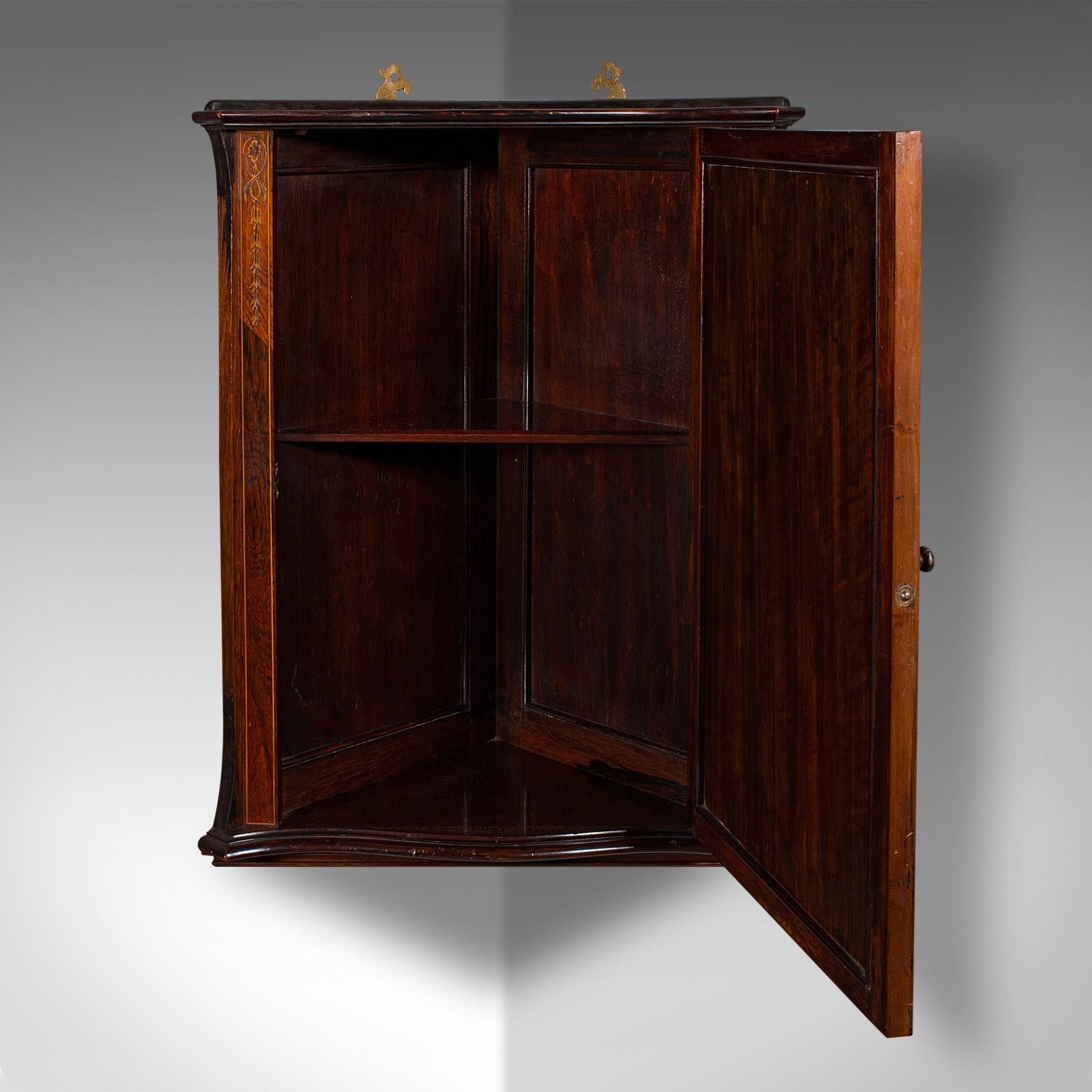 This is a small antique corner cabinet. An English, rosewood hanging display cupboard in Georgian revival taste, dating to the Edwardian period, circa 1910. A distinctive and decorative addition to the refined interior.