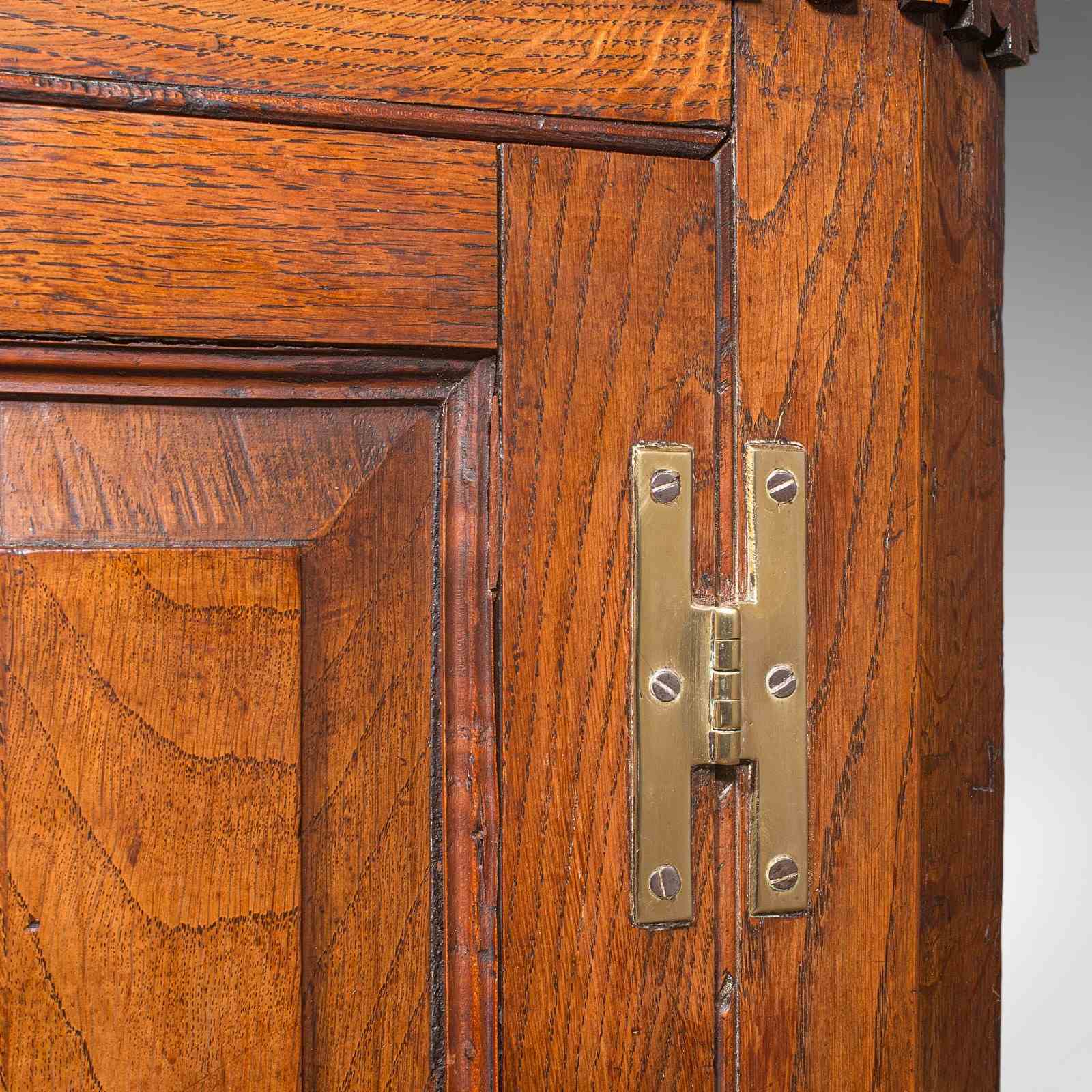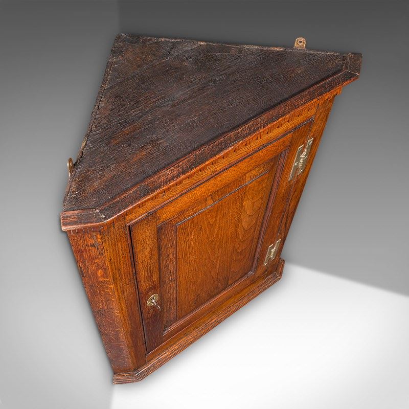 This small antique corner cabinet is a fine example of mid-18th century English craftsmanship, boasting delightful golden oak stocks and refined proportion. Solid joints and construction, delivered ready for the home.