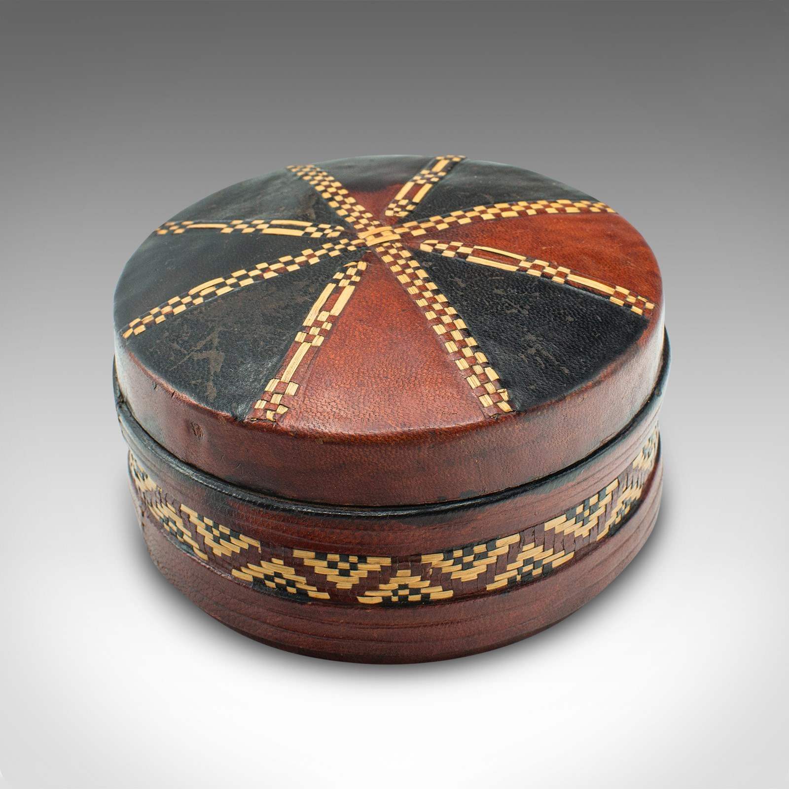 - Dressed with red and black leather, ordered into eight segments upon the lid