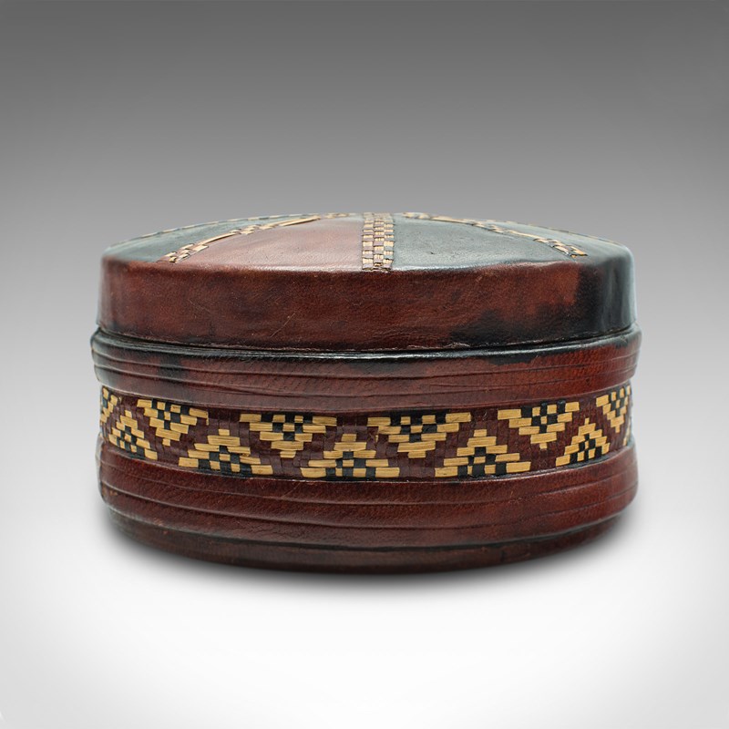 This is a small antique desk tin. An English, Moroccan leather dressed desktop stationery pot, dating to the Edwardian period, circa 1910.