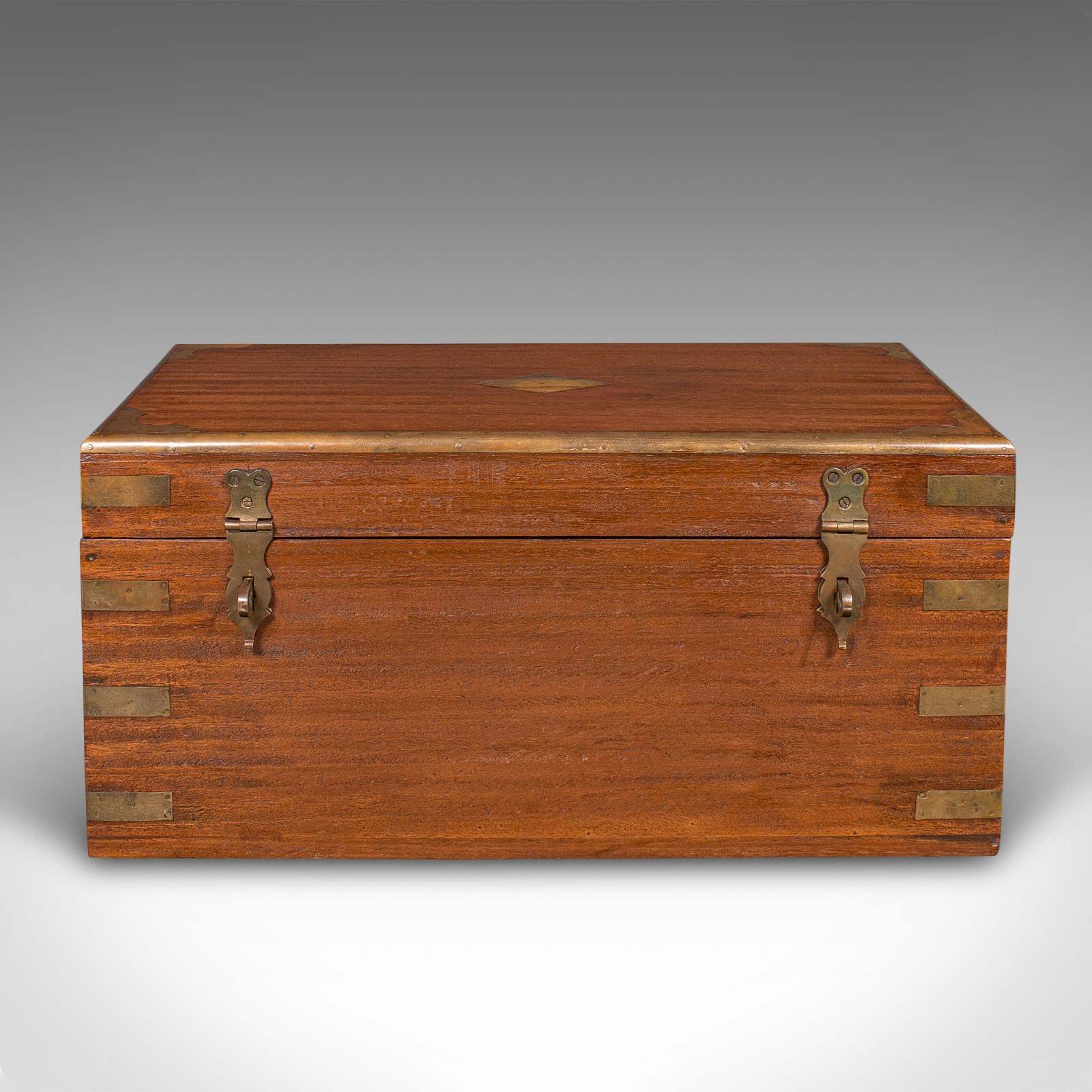 Robust brass strapping to the corners, presenting bright golden tones