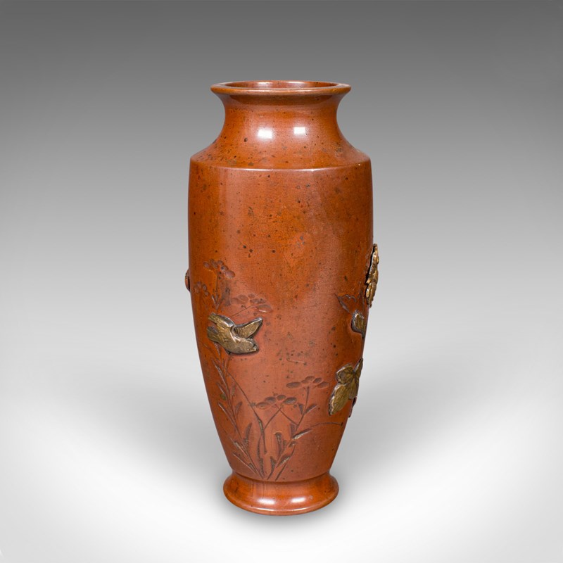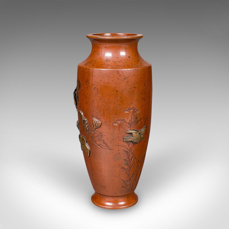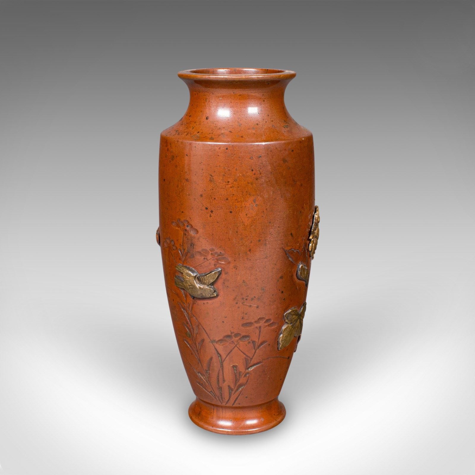 This antique Japanese bronze vase is a fine example of Meiji inspired artistry, offering a refined and charming addition to any collection or interior setting. Delivered ready to display,
