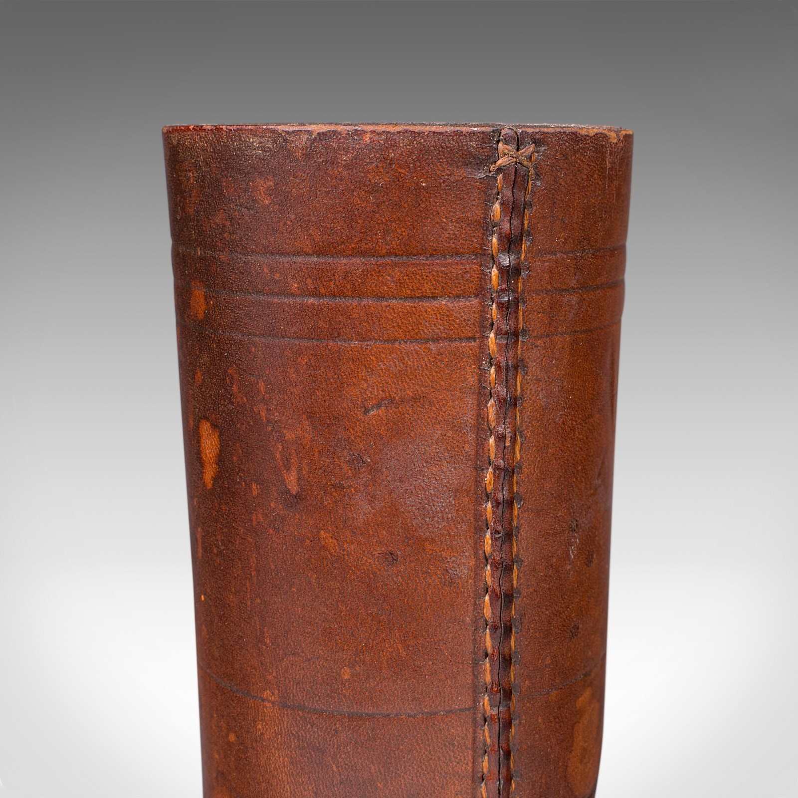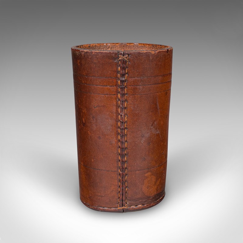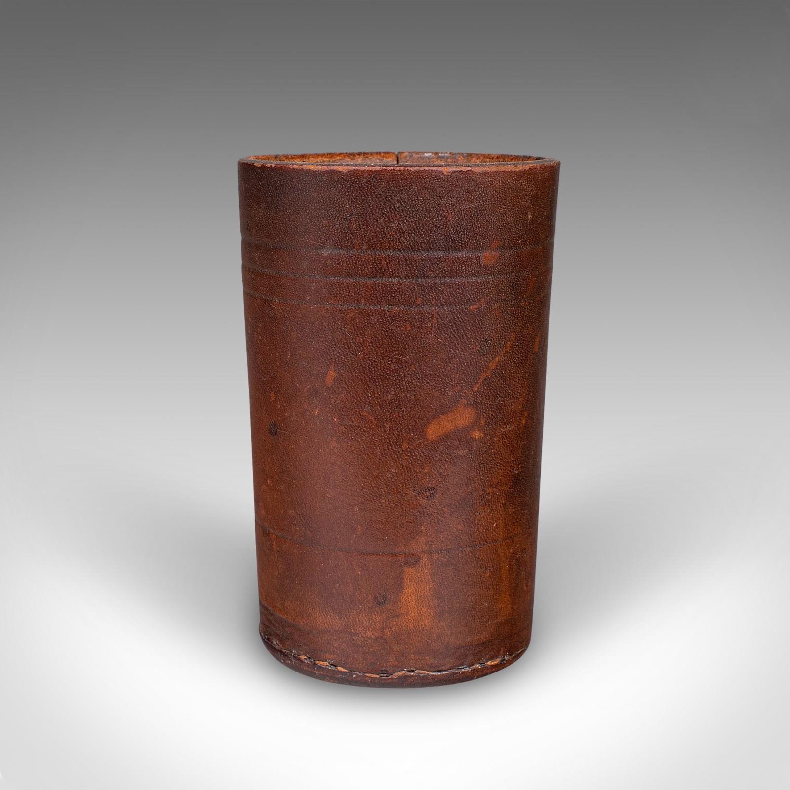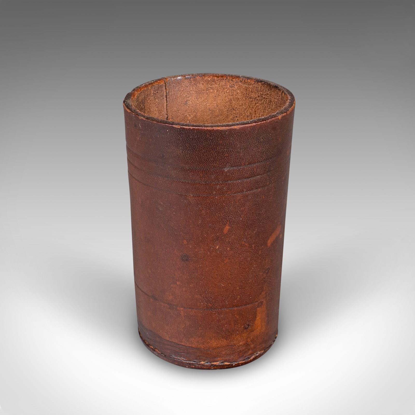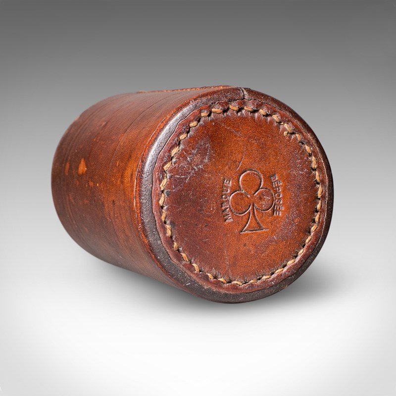 This is a small antique Jacquet dice pot. A French, leather craps or gaming tumbler, dating to the early 20th century, circa 1920. A tactile and characterful dice cup, offering refined charm for collectors of gaming antiques and leisure accessories.
