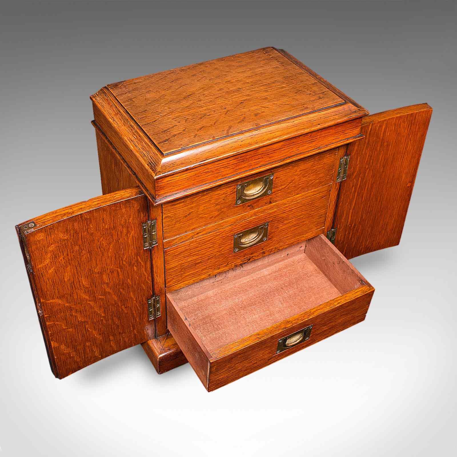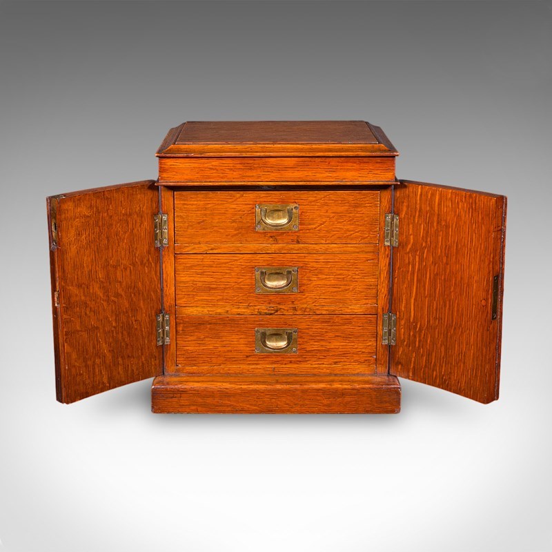 This is a small antique specimen case. An English, oak three drawer watchmaker's or collector’s cabinet, dating to the Victorian period, circa 1880. A beautifully presented cabinet with excellent colour, patina and practical storage for cherished collectibles.