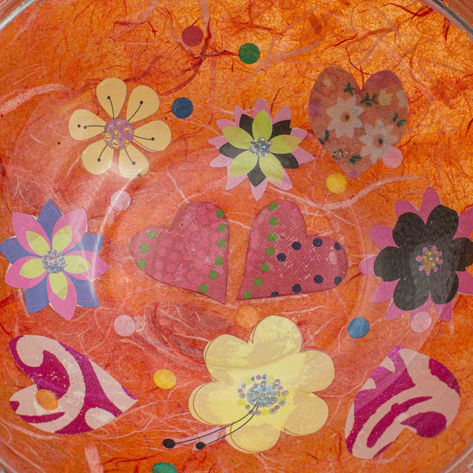 - Heart and flowerhead motif set beneath the clear glass for a gloss finish