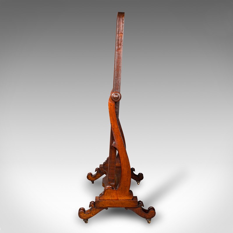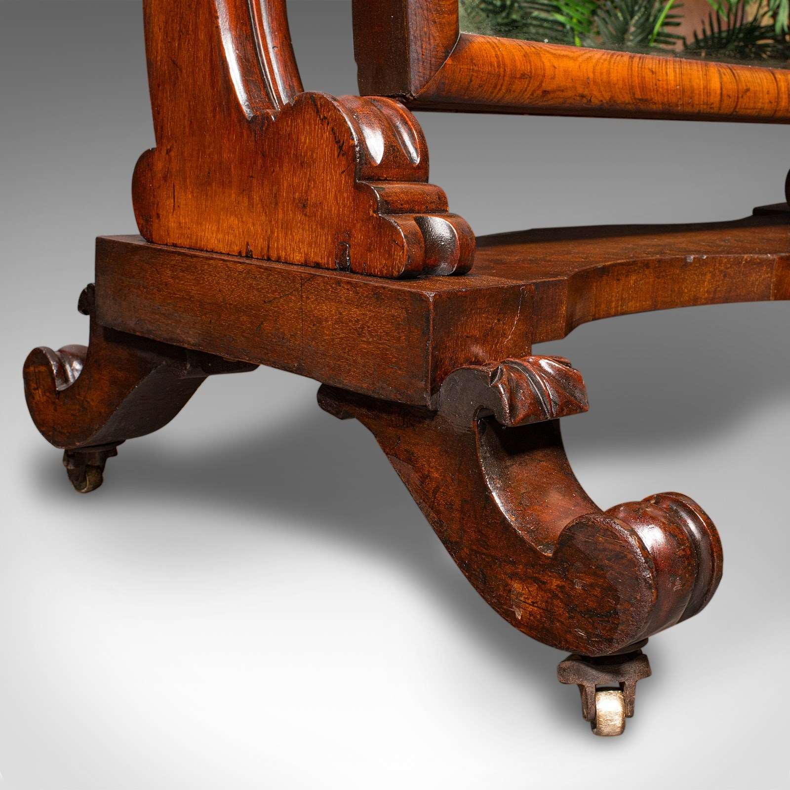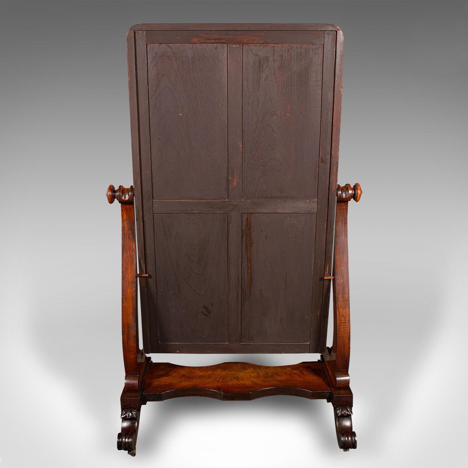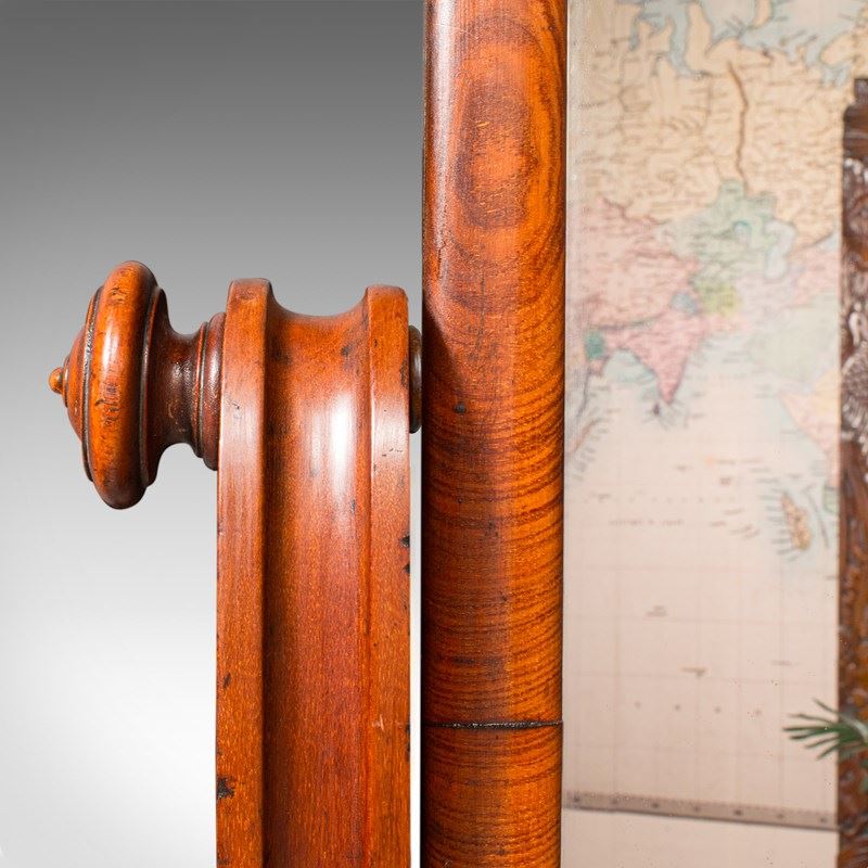 This is a distinguished English gentleman’s outfitter’s dressing mirror, dating to the early Victorian period, circa 1840. Crafted from exquisite flame mahogany, this superb Cheval mirror boasts superb proportion, refined craftsmanship, and smooth articulation.