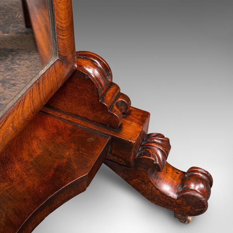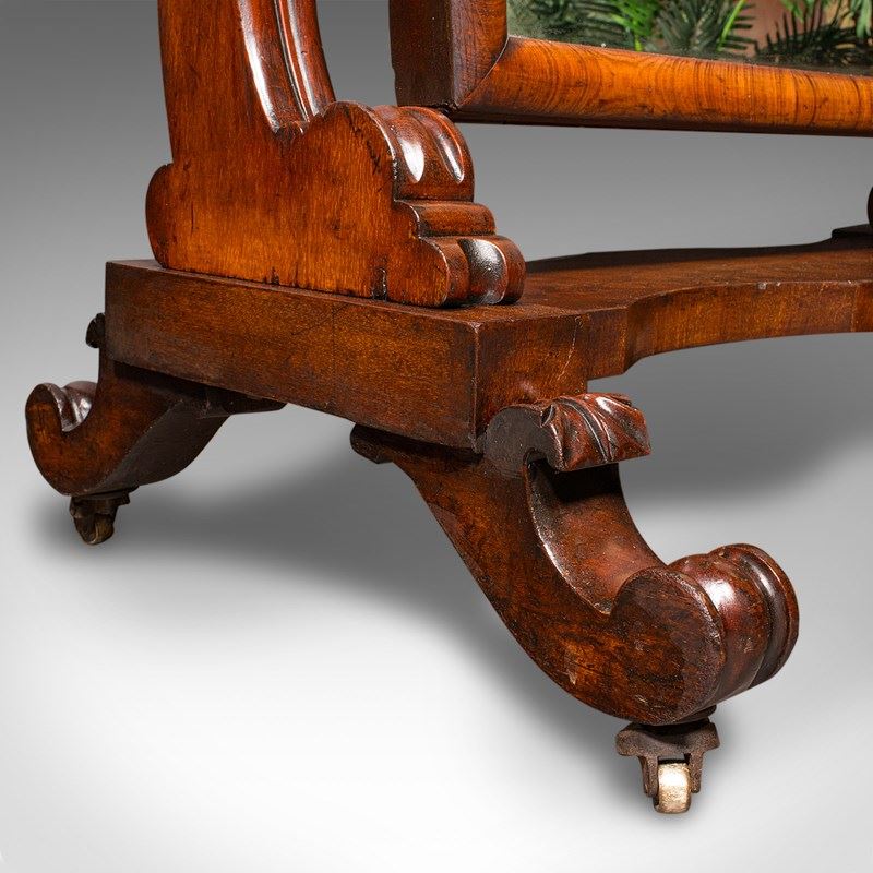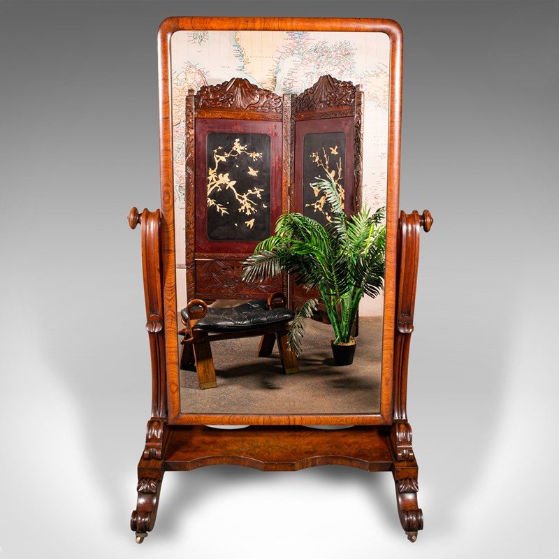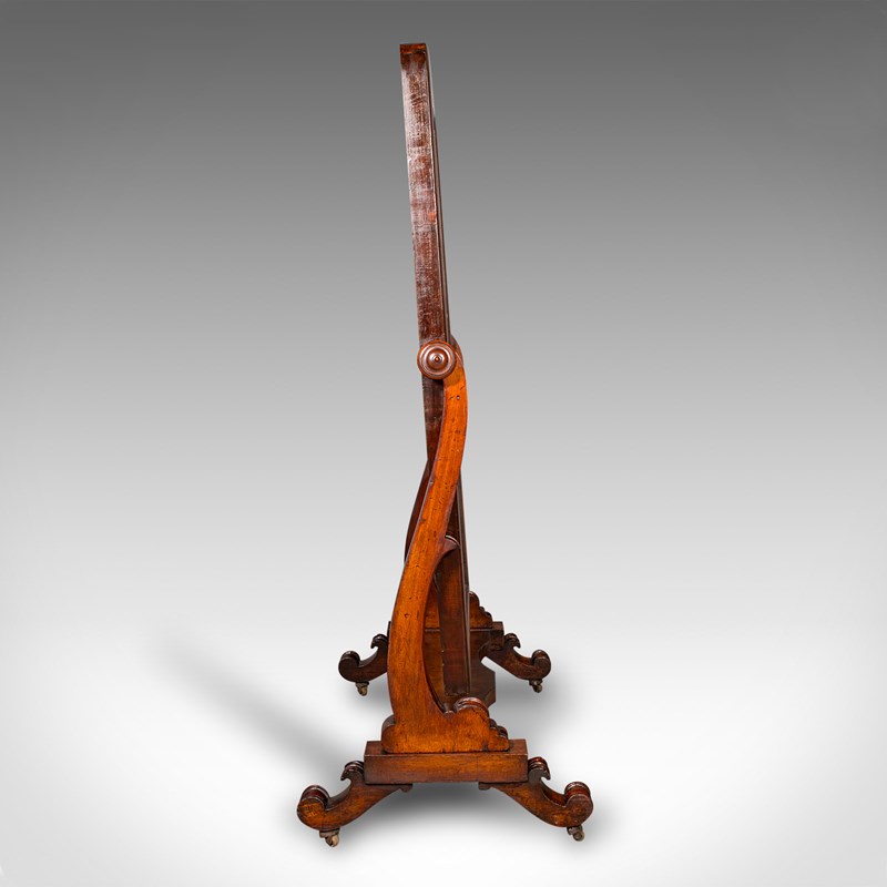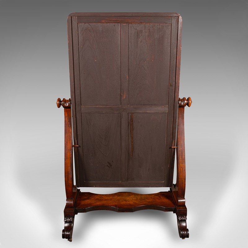 This is a distinguished English gentleman’s outfitter’s dressing mirror, dating to the early Victorian period, circa 1840. Crafted from exquisite flame mahogany, this superb Cheval mirror boasts superb proportion, refined craftsmanship, and smooth articulation.