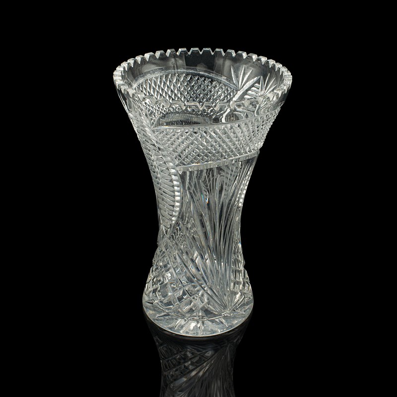 This is an attractive vintage crystal flower vase, finished with a skilfully cut pattern throughout. Delivered ready to enjoy.