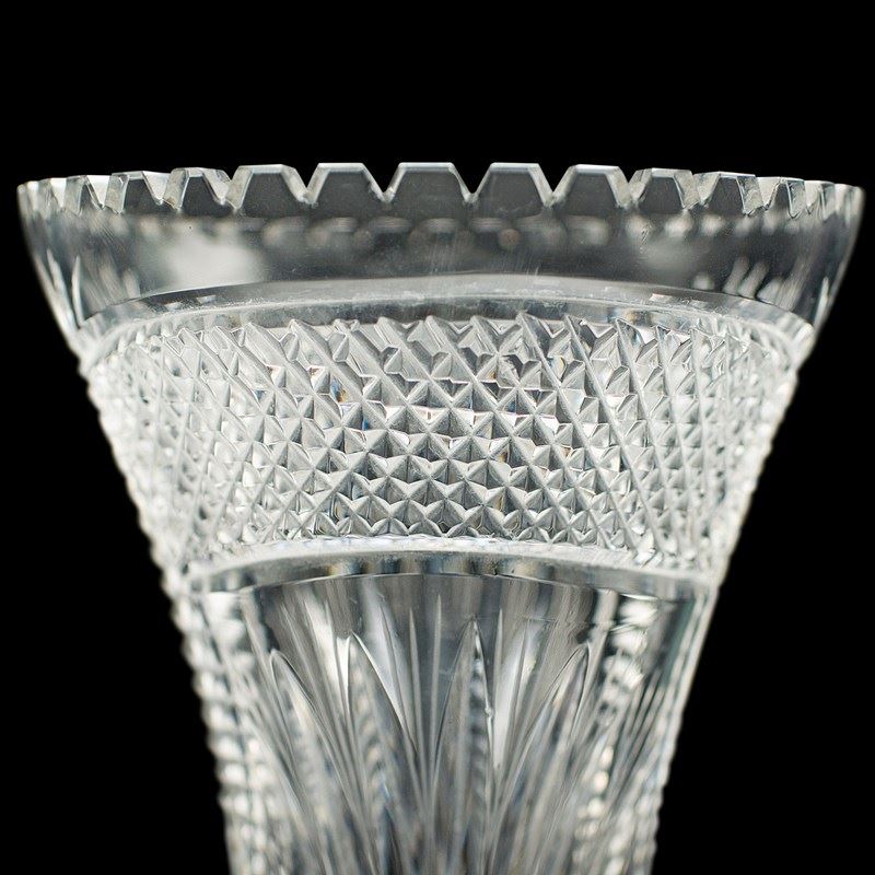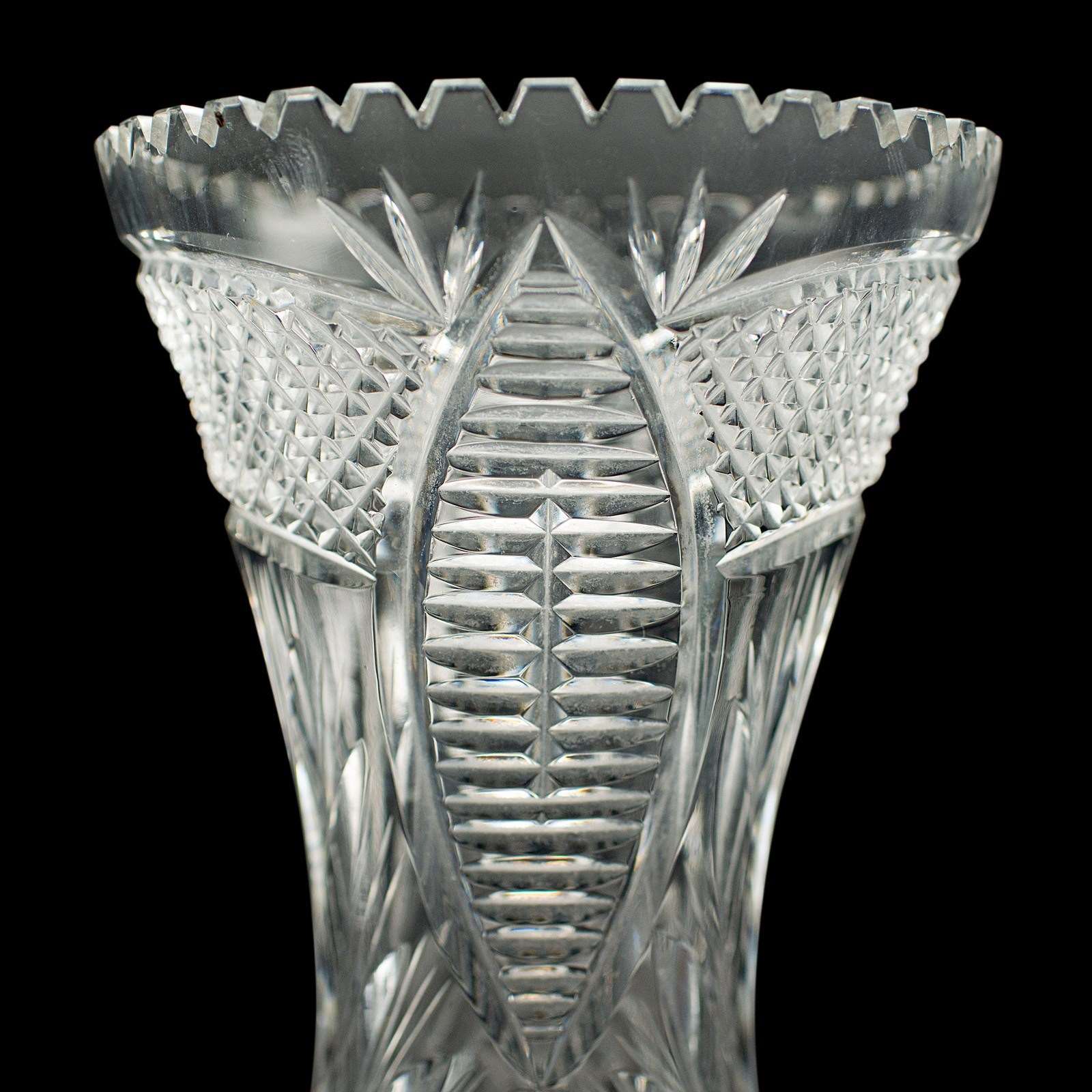 This is a tall vintage crystal flower vase. An English, cut crystal glass decorative trumpet vase, dating to the mid 20th century, circa 1950.