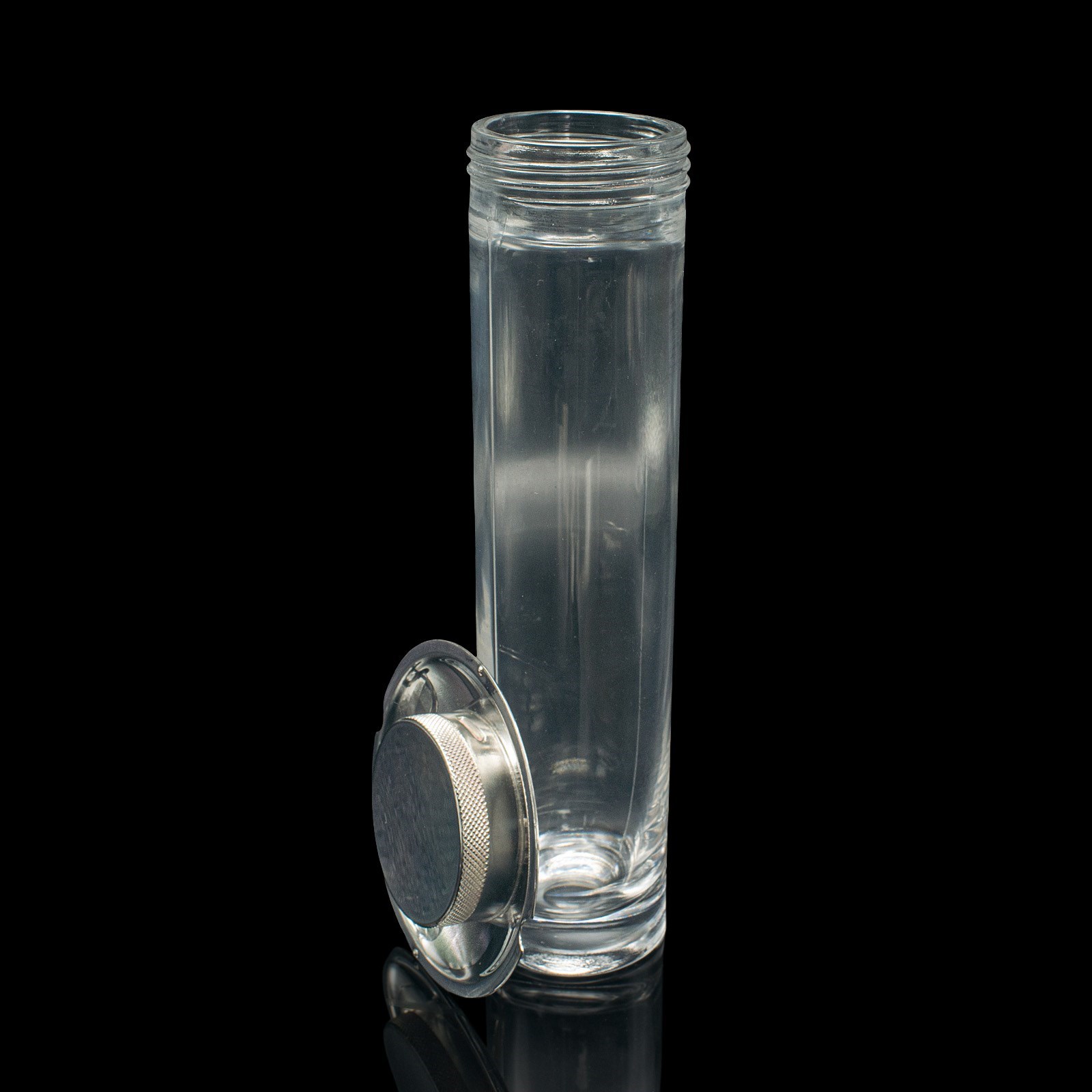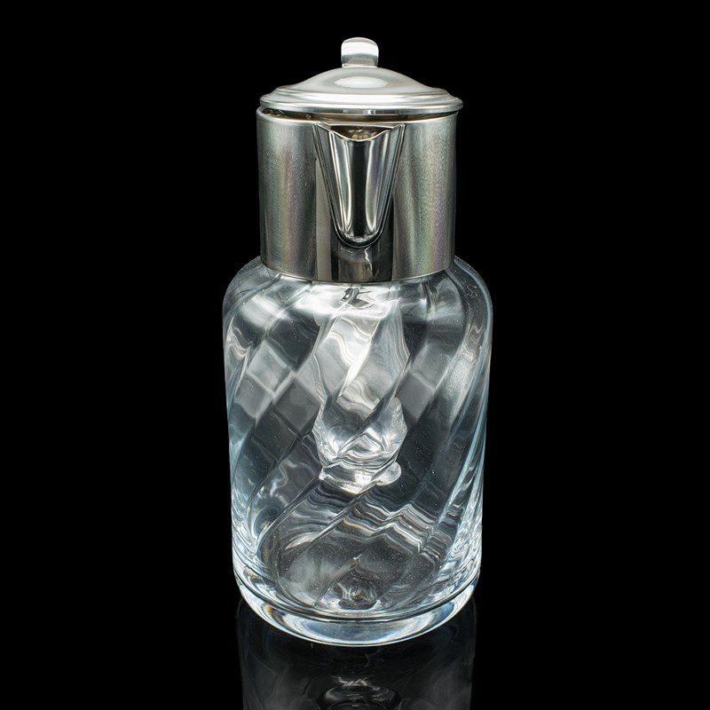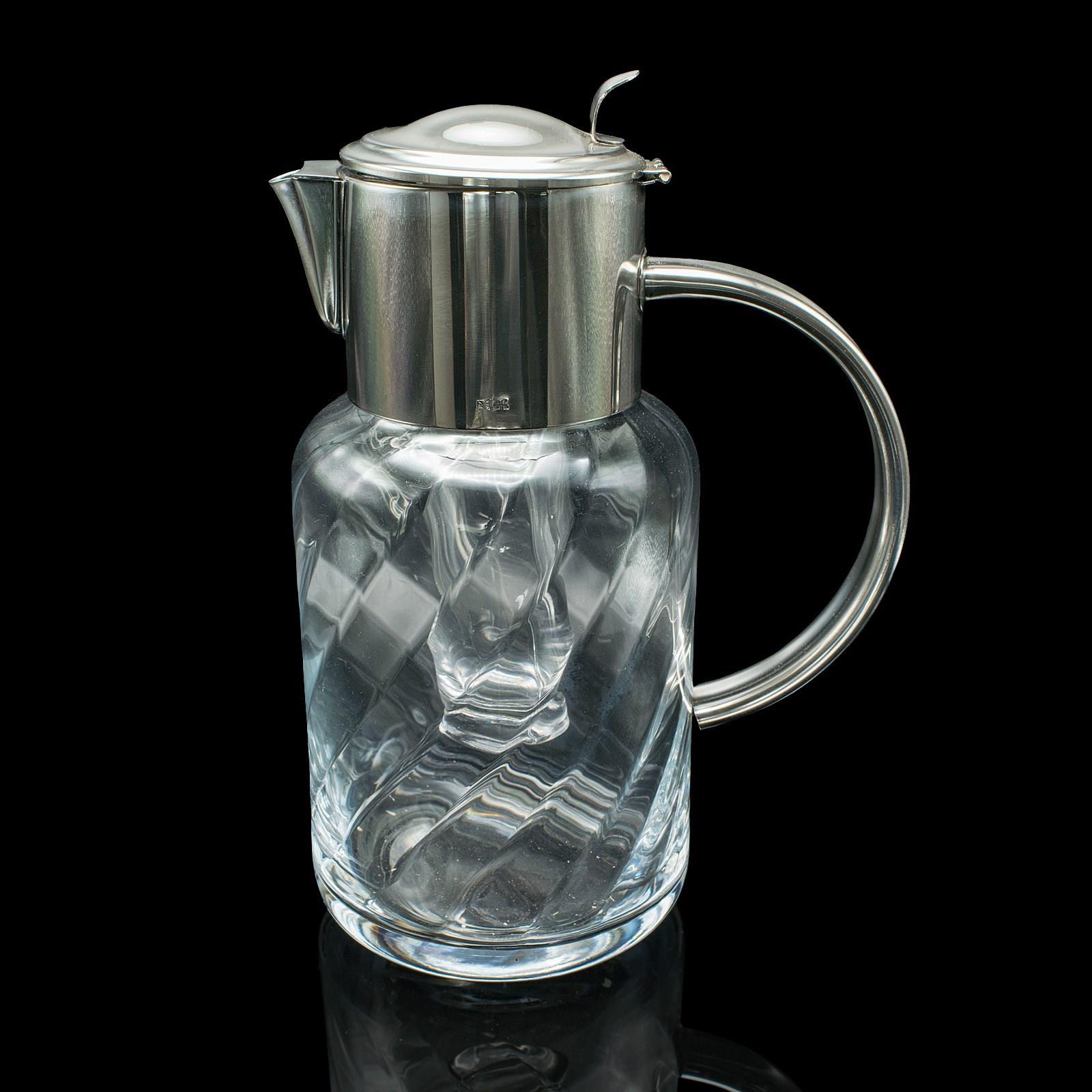 This is a vintage lemonade pitcher. An English, glass and silver plated cordial cooler jug, dating to the mid 20th century, circa 1950.