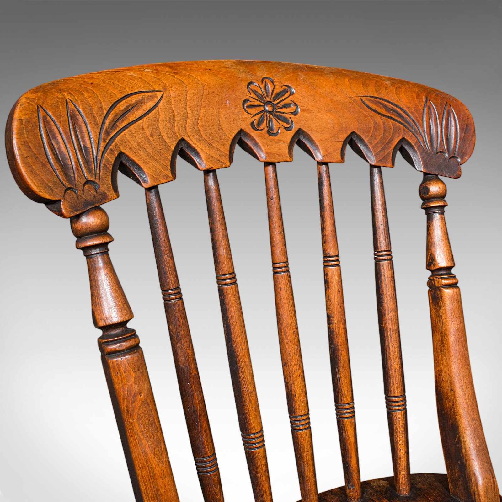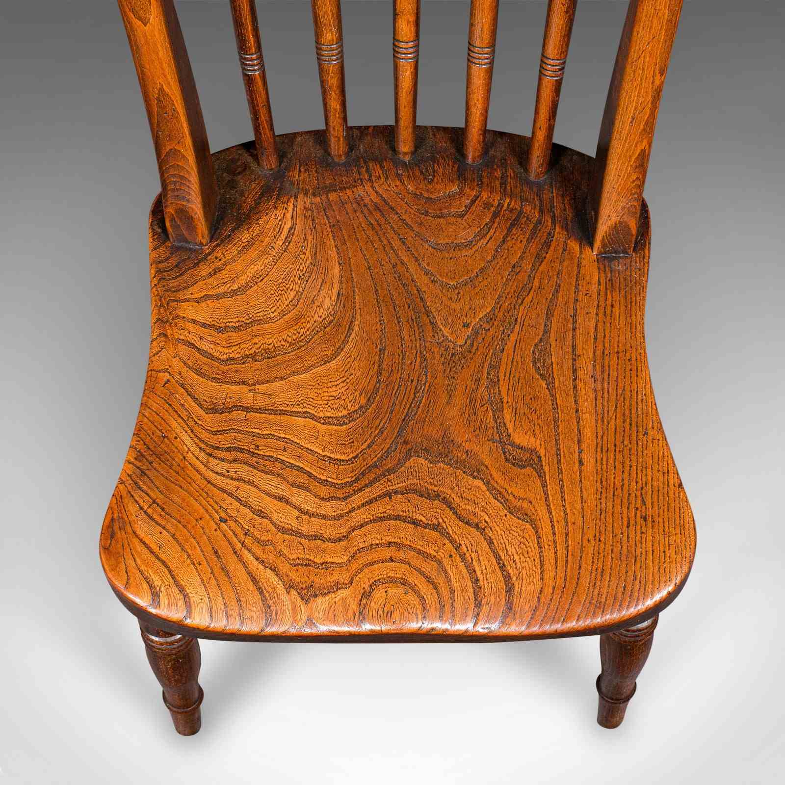 Five turned spindles form the gently angled back rest, supported by a pair of canted side posts