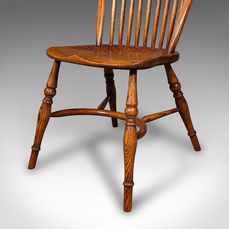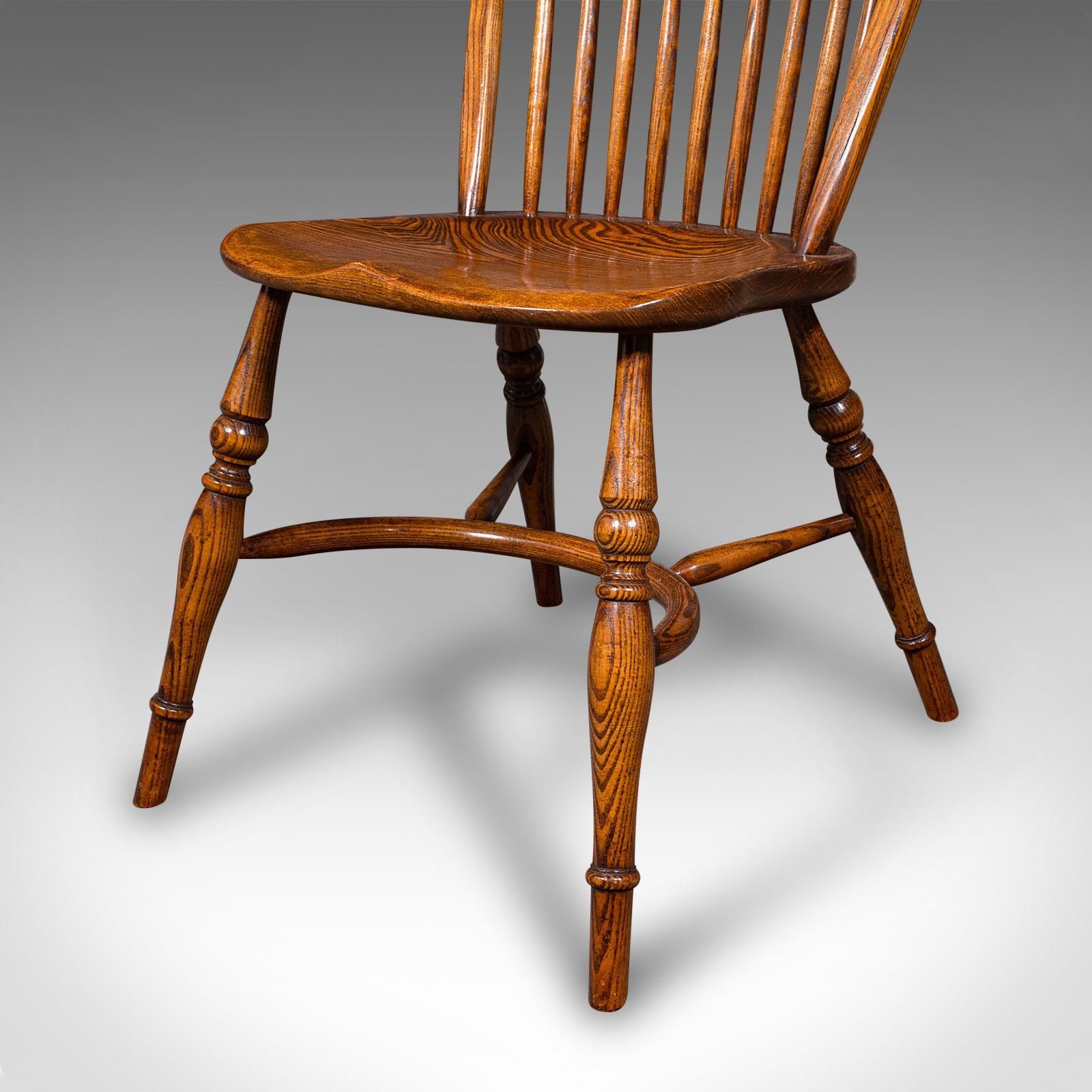 This is a charming trio of vintage country kitchen chairs. An English, ash & elm stick back seat and presented in Victorian revival taste, dating to the late 20th century, circa 1980. Handsome and well-crafted, these chairs exude classic farmhouse character and offer enduring comfort for the traditional dining room or country breakfast setting.