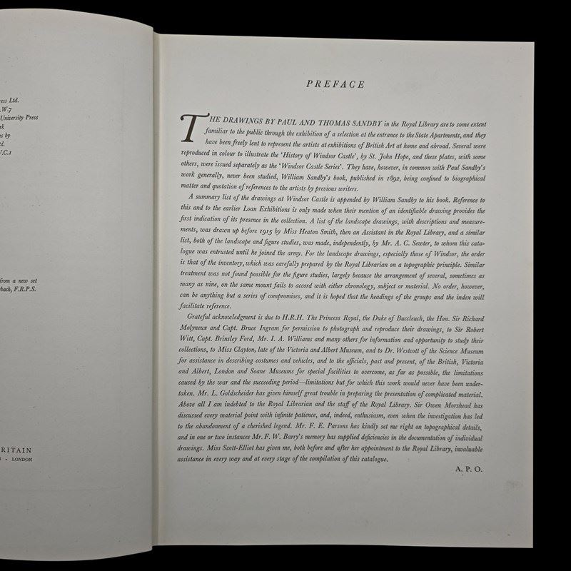 This is a vintage copy of Sandby Drawings at Windsor Castle by Adolph Paul Oppé, a distinguished art history volume, published circa 1950. A comprehensive and richly illustrated catalogue of works by brothers Paul and Thomas Sandby, leading figures in Georgian Britain’s art scene, this book offers exceptional insight into their contributions as landscape painters and founding members of the Royal Academy. Presented in intact, original order with light age markings, this handsome publication includes monochrome and select colour reproductions, carefully curated to showcase the Sandby brothers’ artistry.