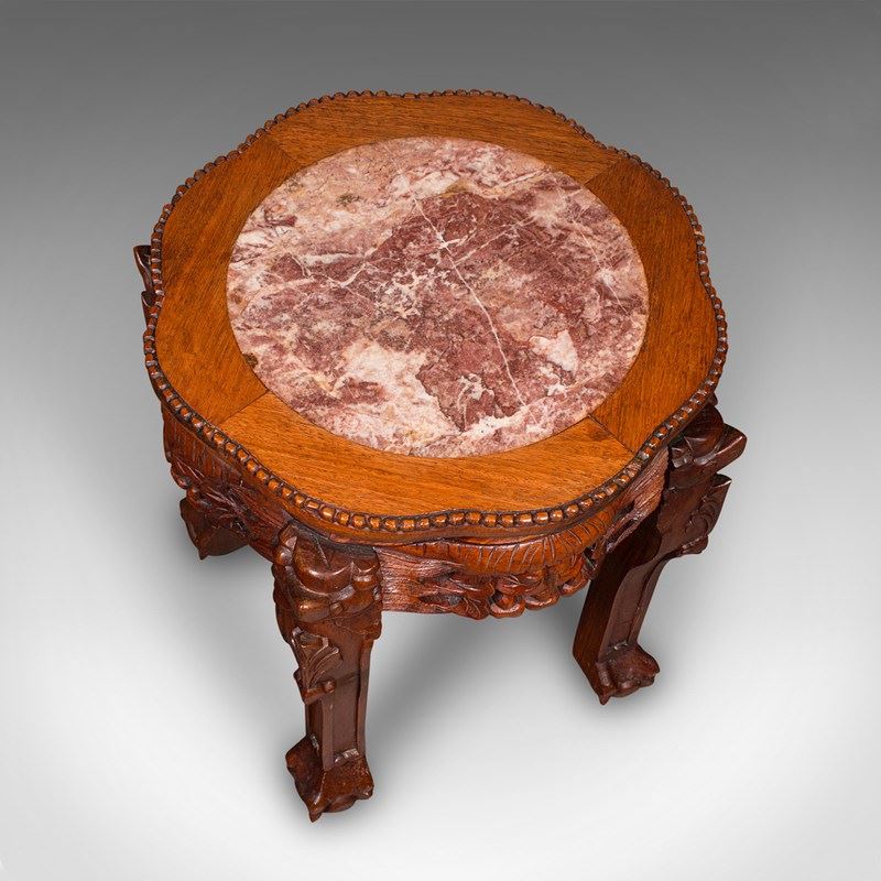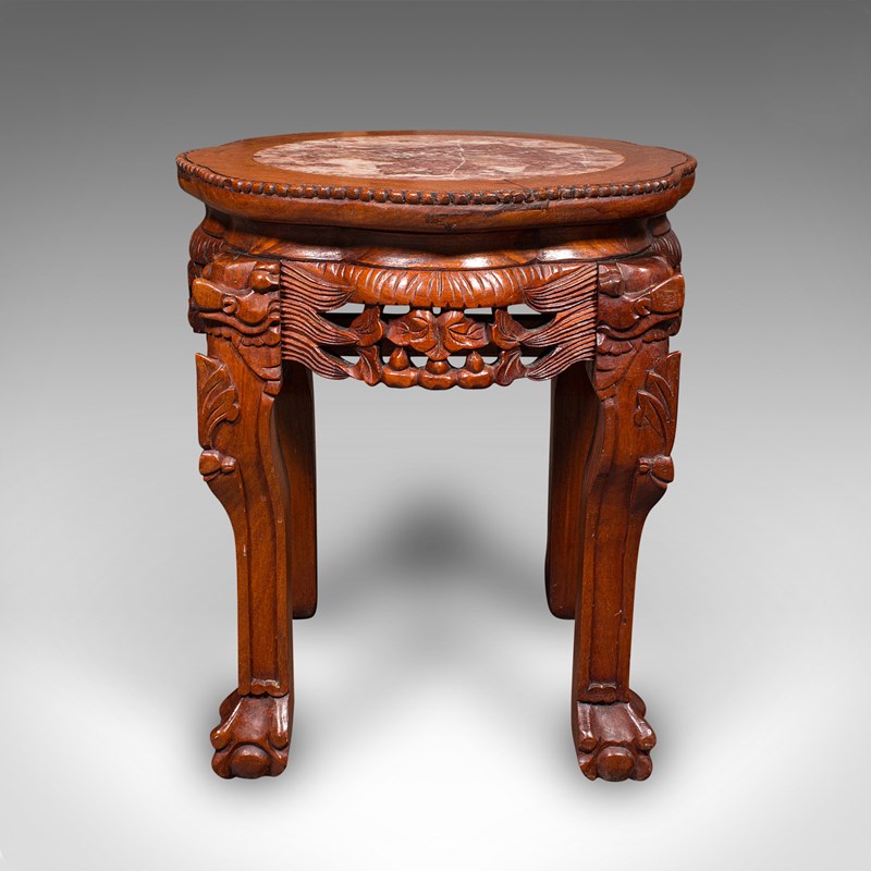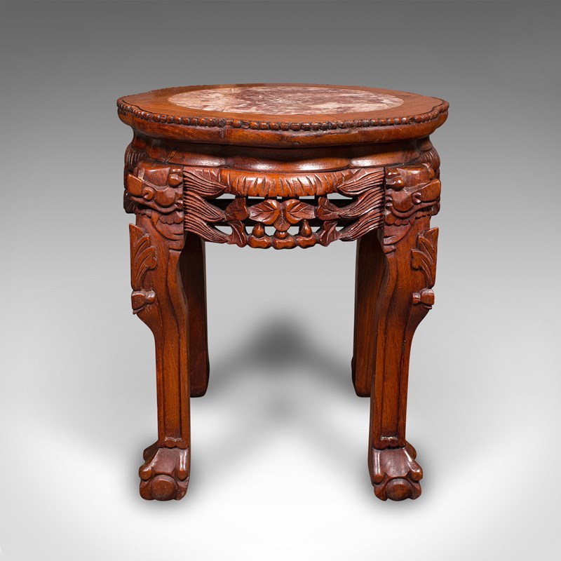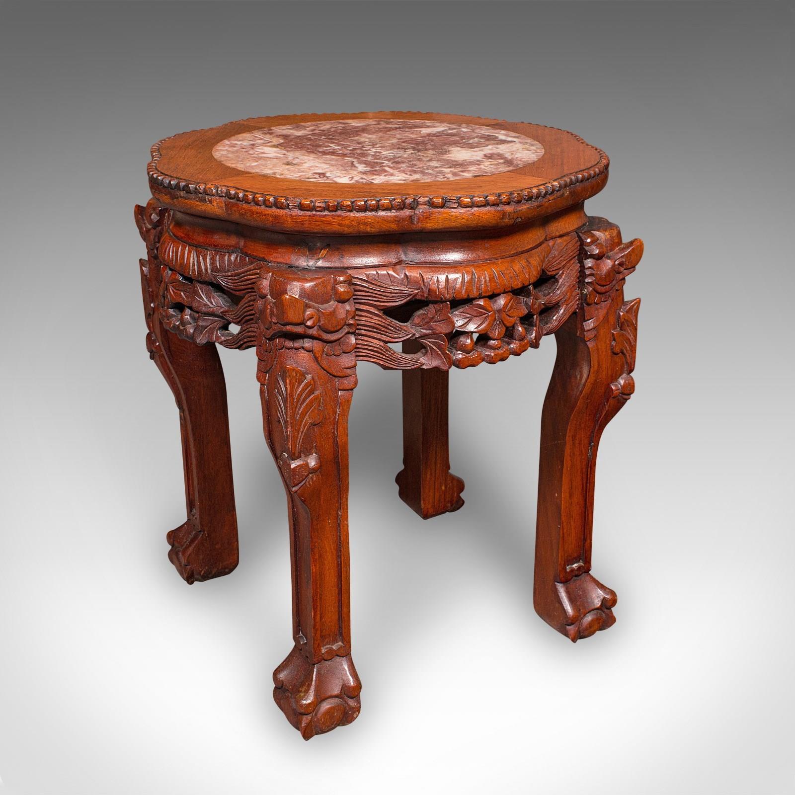 This is a vintage Art Deco lamp stand. An Oriental, carved mahogany wine or side table, dating to the mid 20th century, circa 1940. A visually distinctive occasional table offering wonderful colour and decorative interest.