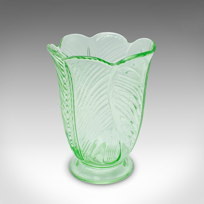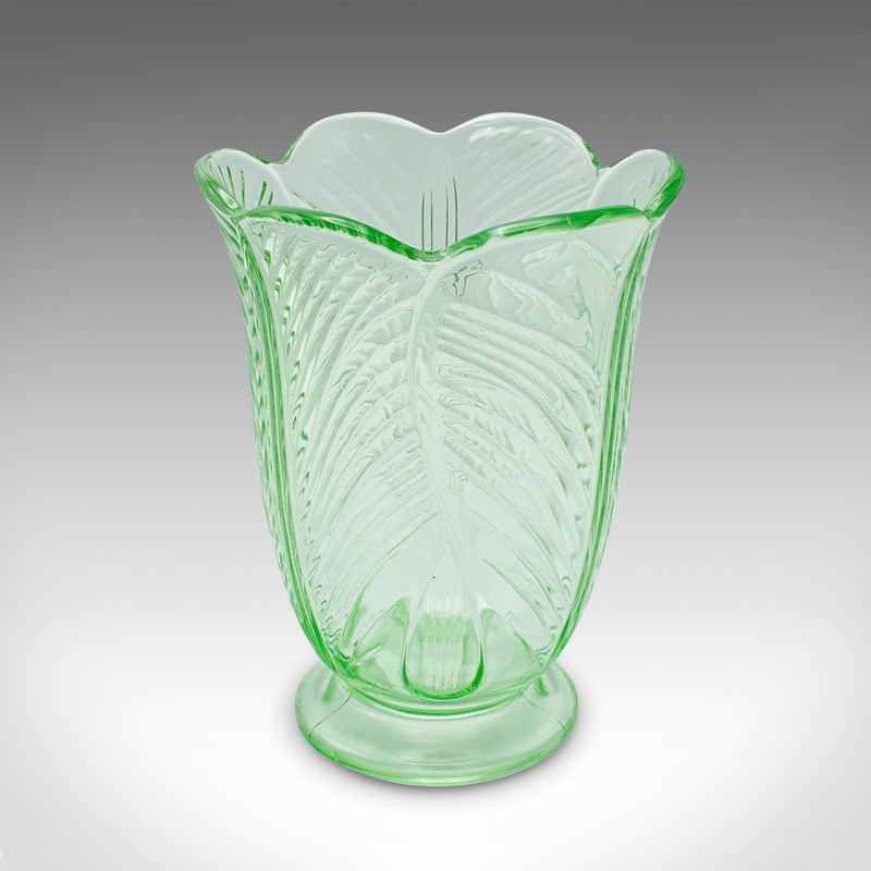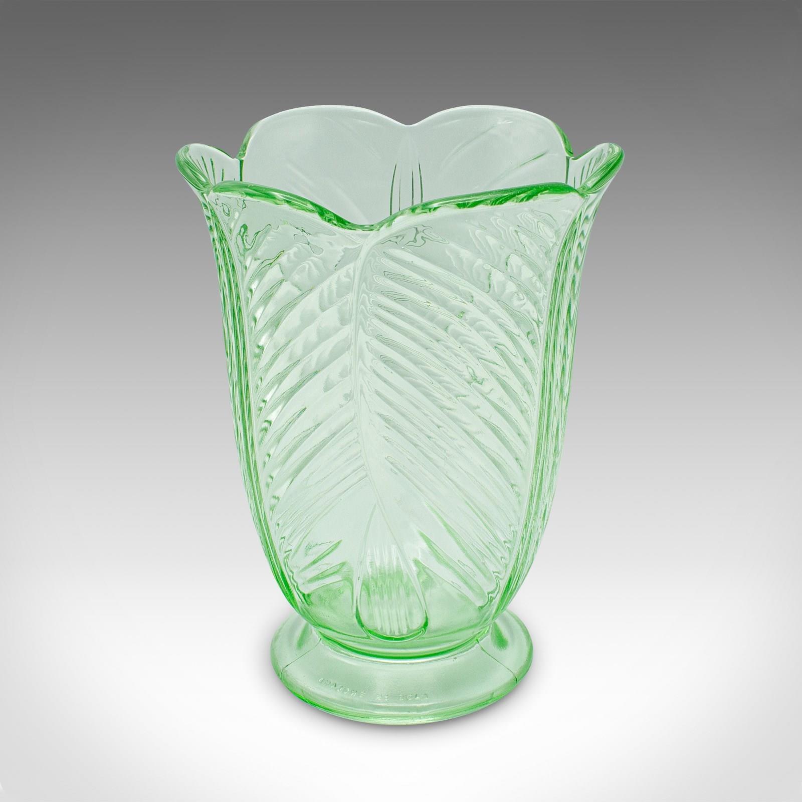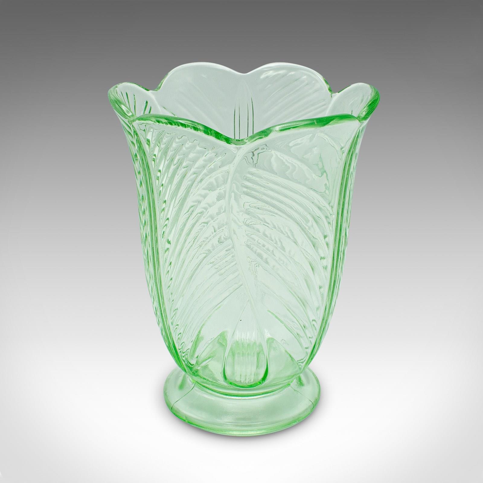 This is a vintage Art Deco vase. An English, tulip motif glass flower pot, dating to the early 20th century, circa 1930.