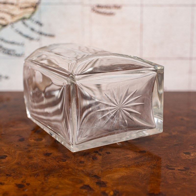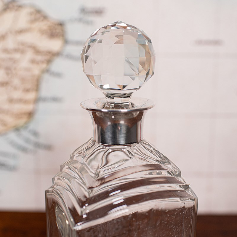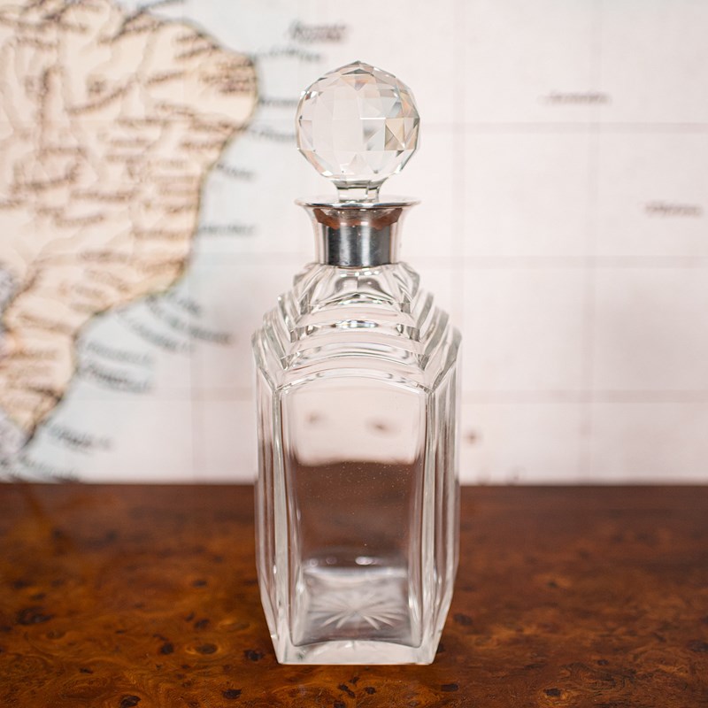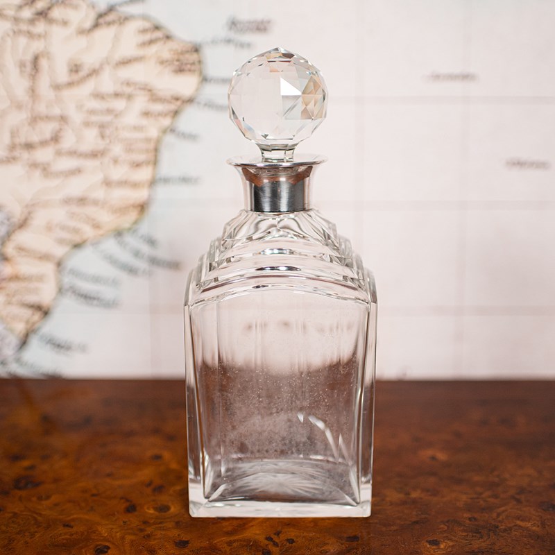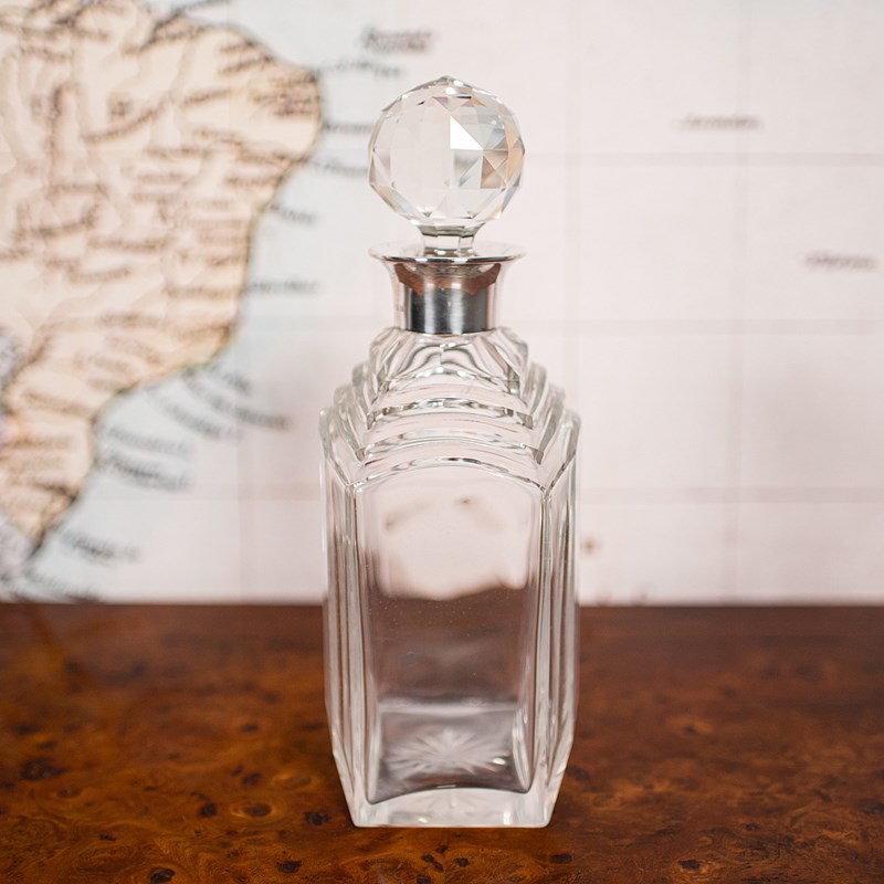 This is a vintage Art Deco whiskey decanter. An English, glass and silver spirit vessel, hallmarked in Birmingham, circa 1930.