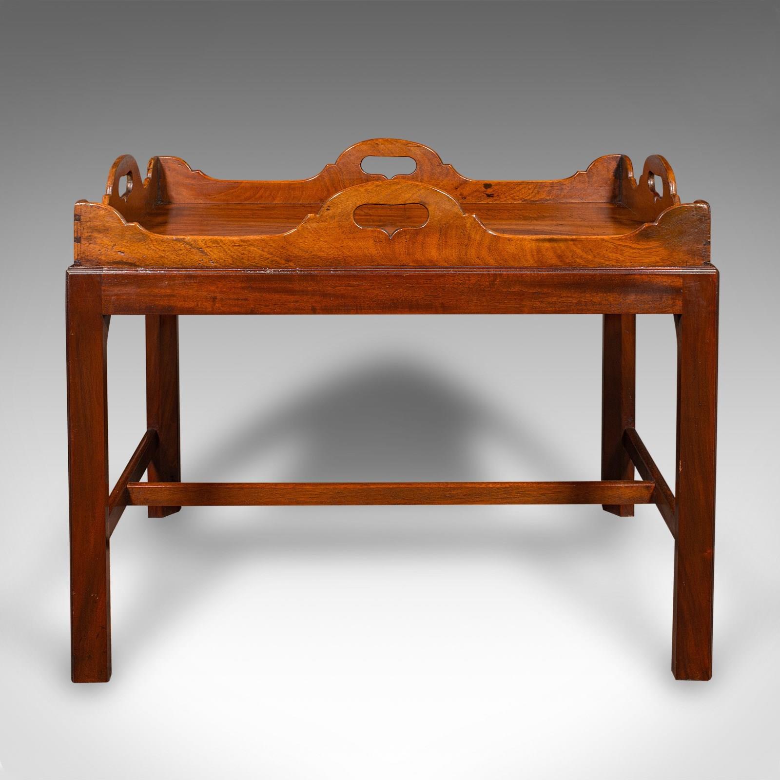 This is a vintage butler's serving table. An English, mahogany afternoon tea tray on stand in Georgian revival taste, dating to the Art Deco period, circa 1930.