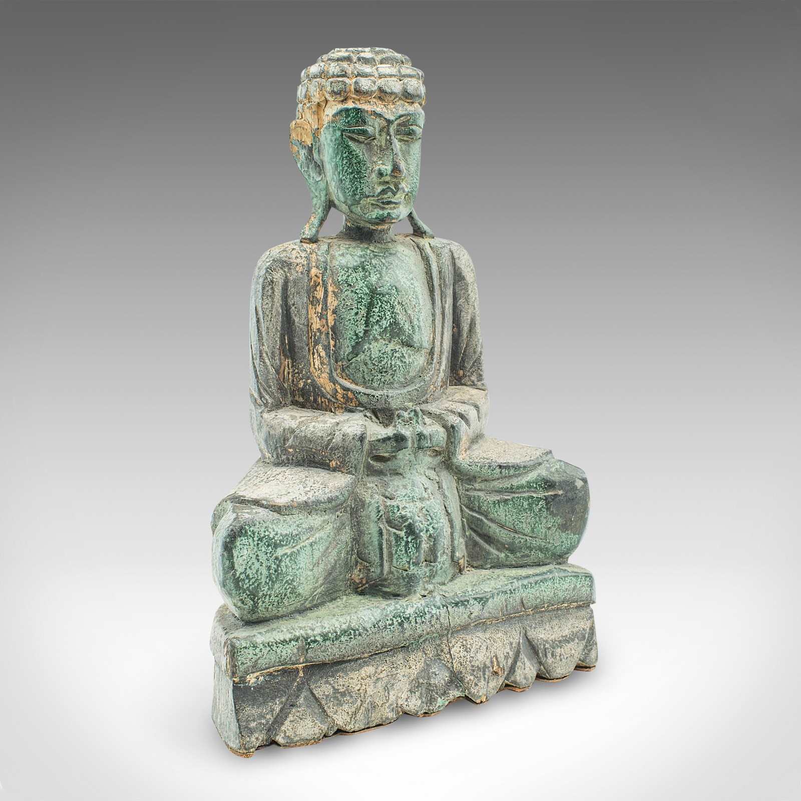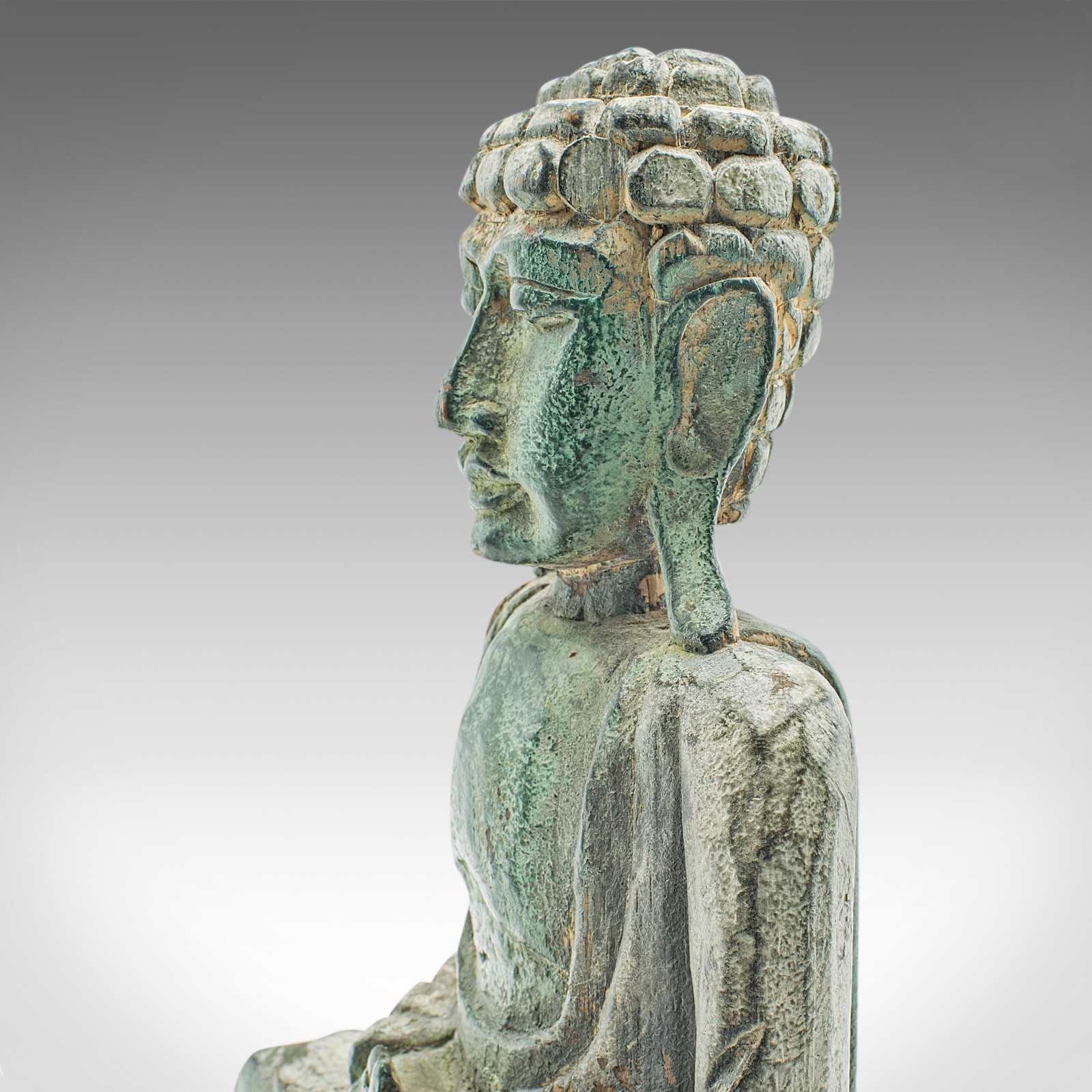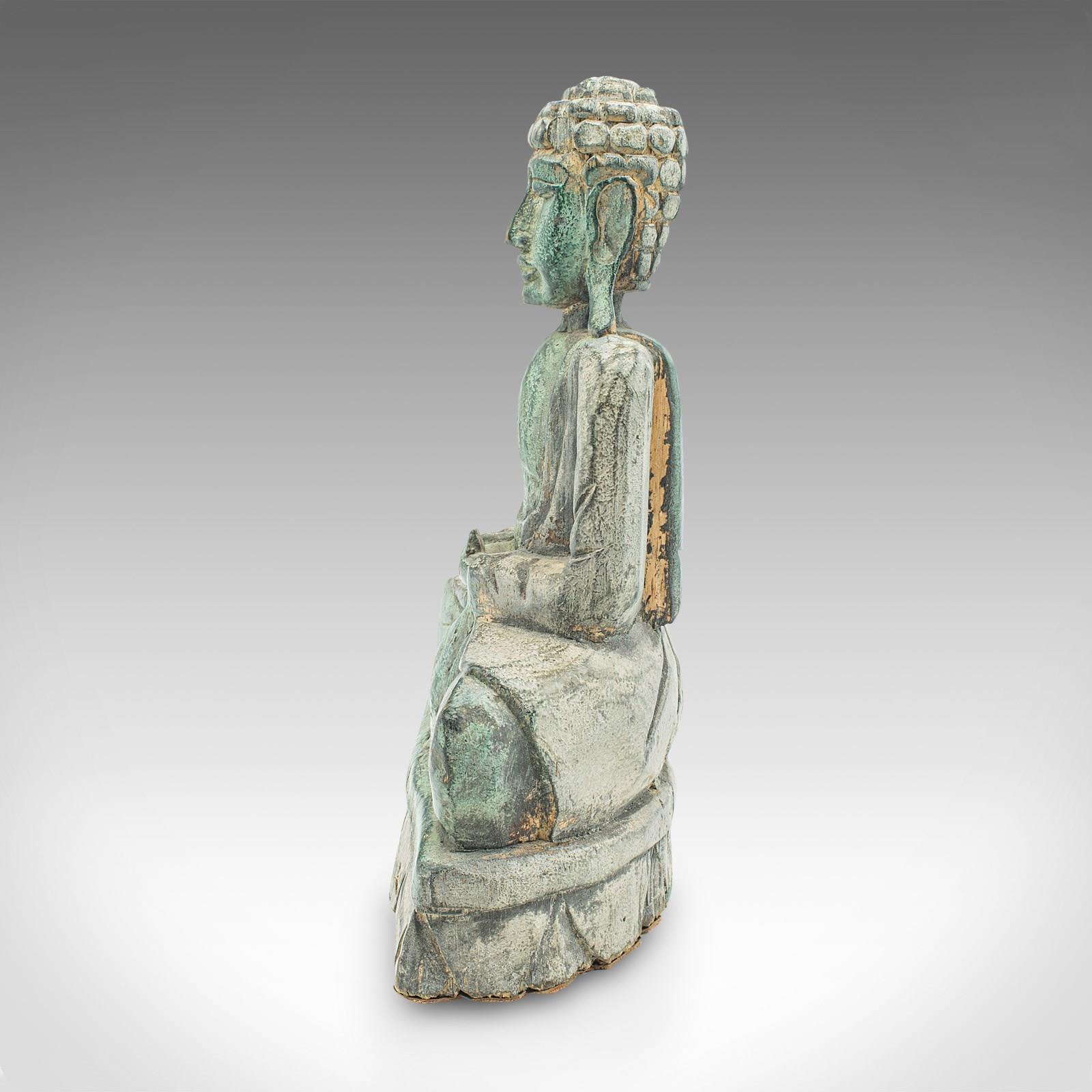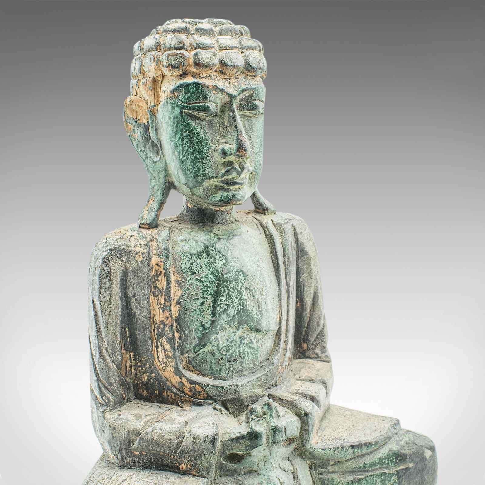 This is a vintage carved deity. An Oriental, bronzed pine Buddha figure, dating to the Art Deco period, circa 1930.