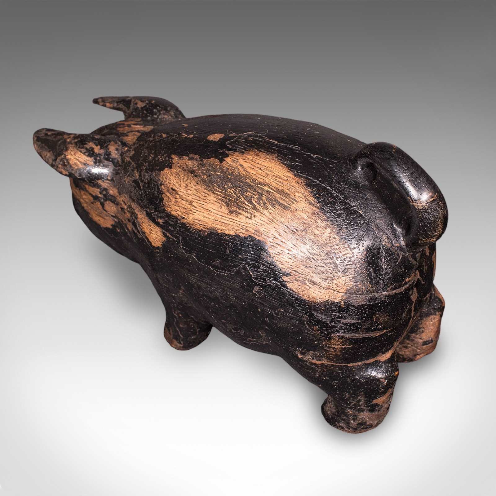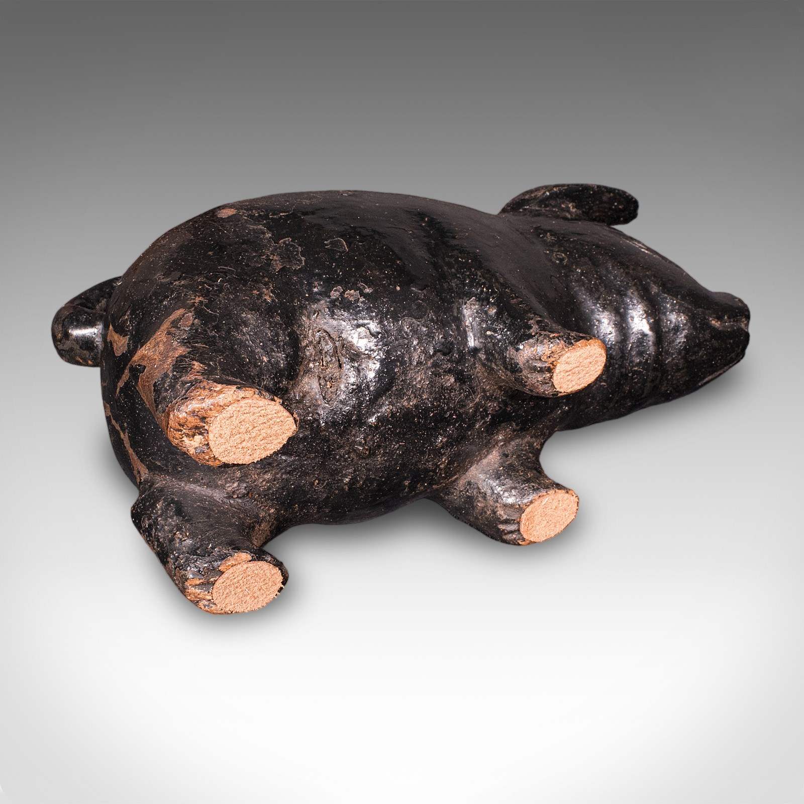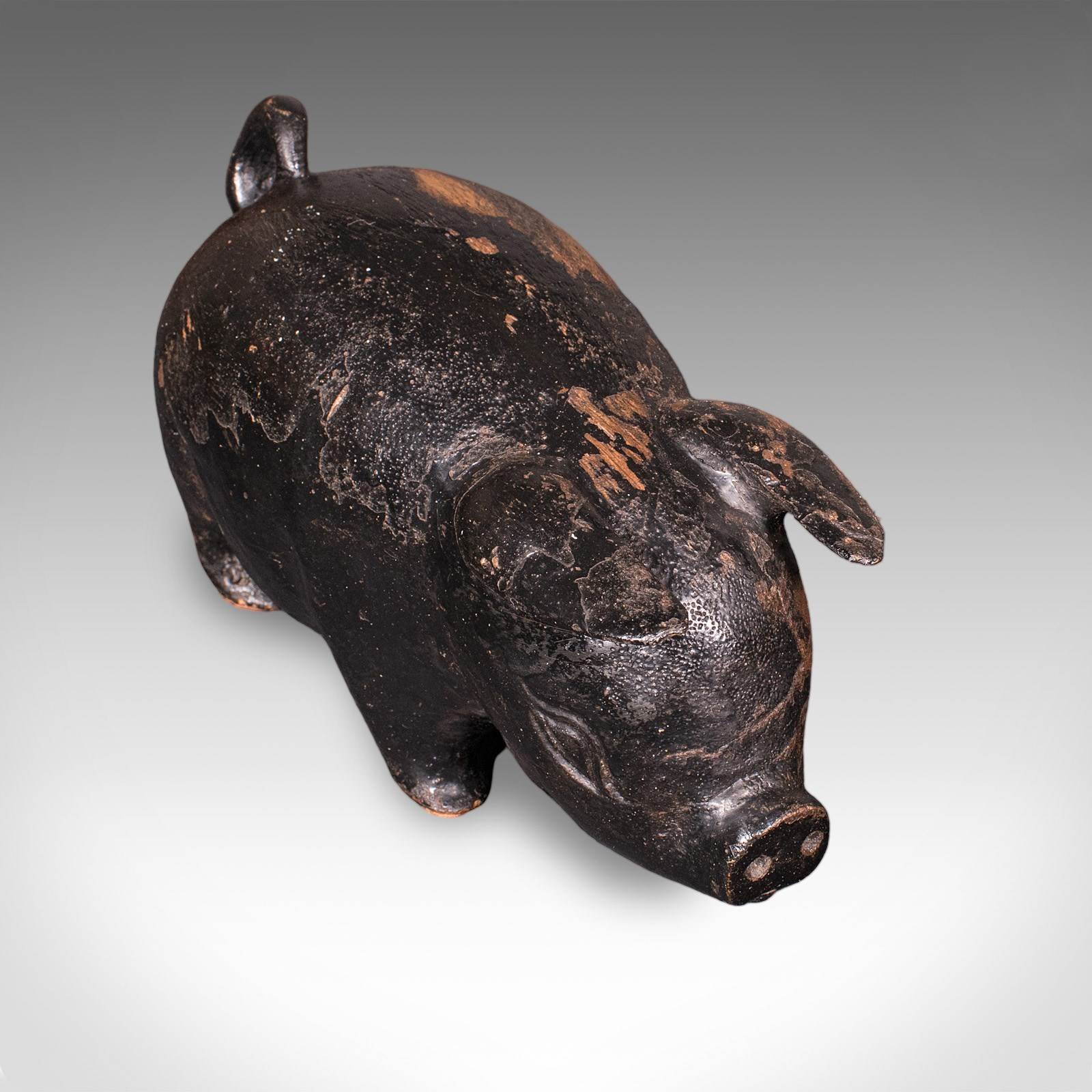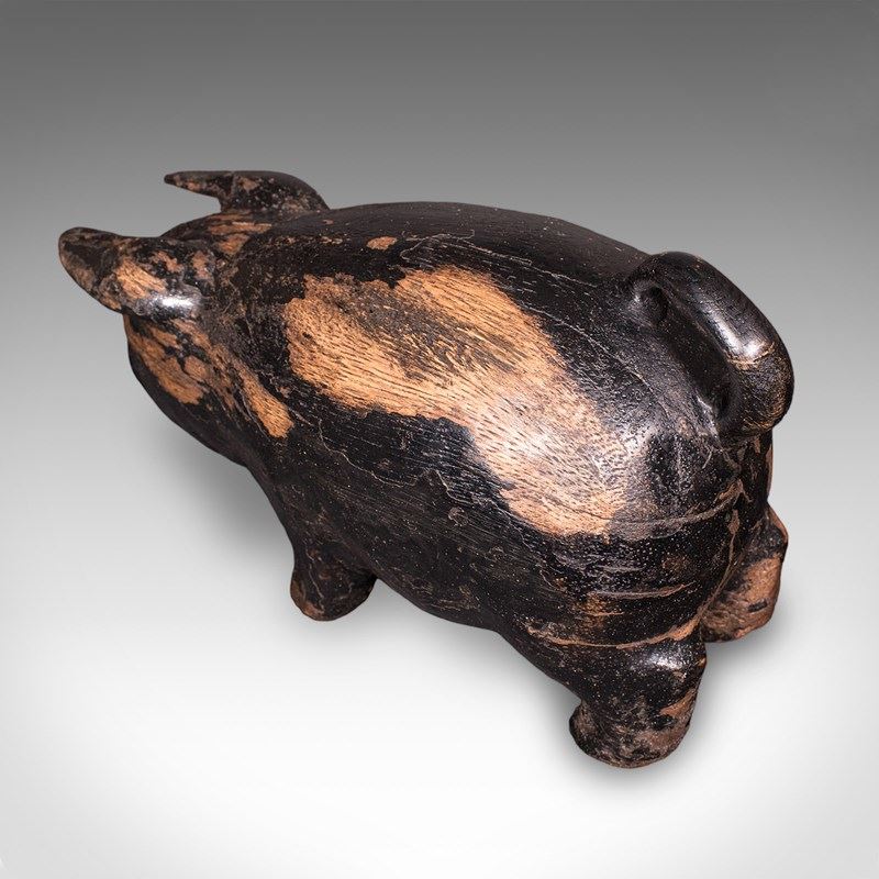 This is a vintage carved piglet figure. An English, ebonised treen in farmyard animal form, dating to the mid 20th century, circa 1950. A charming decorative study, offering rustic character and appealing mid-century naive craftsmanship.