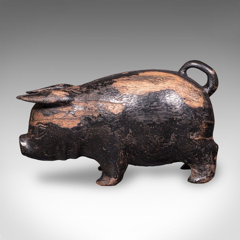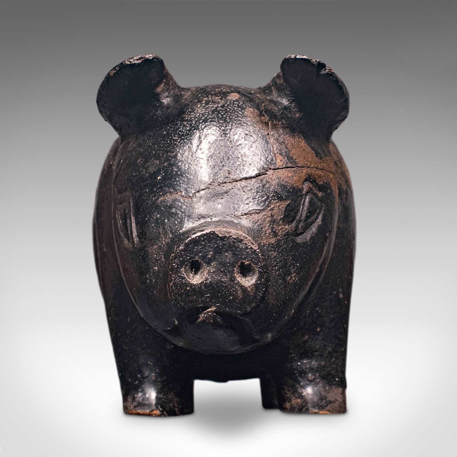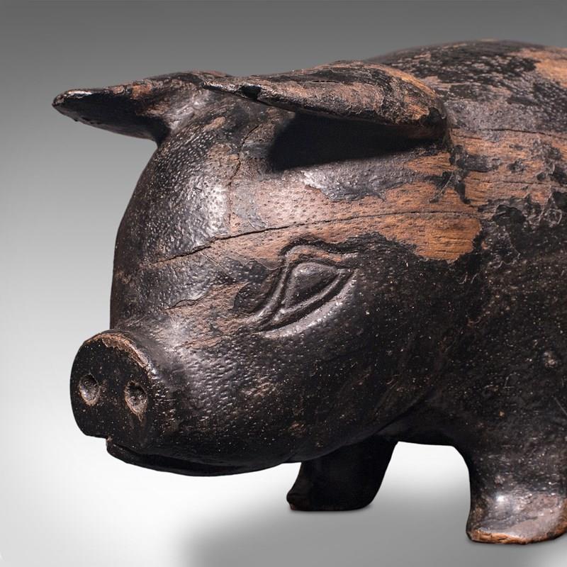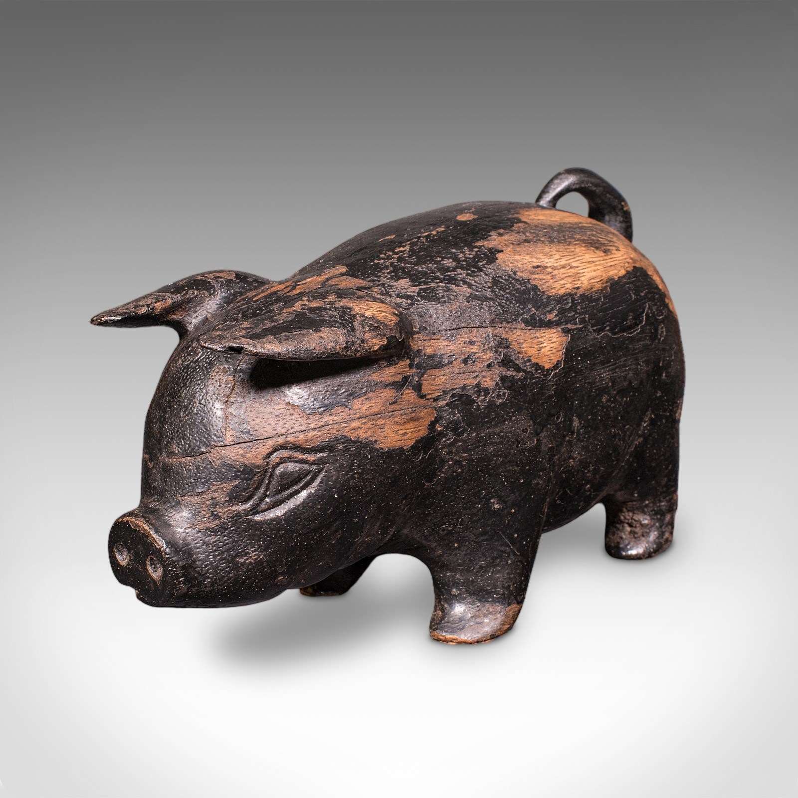 This is a vintage carved piglet figure. An English, ebonised treen in farmyard animal form, dating to the mid 20th century, circa 1950. A charming decorative study, offering rustic character and appealing mid-century naive craftsmanship.