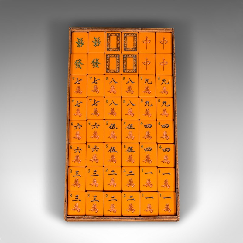 This is a fascinating vintage cased Mahjong set, with a distinctive colour for the counters. Wonderful antique carry case adds appeal to the whole. Delivered ready to enjoy.