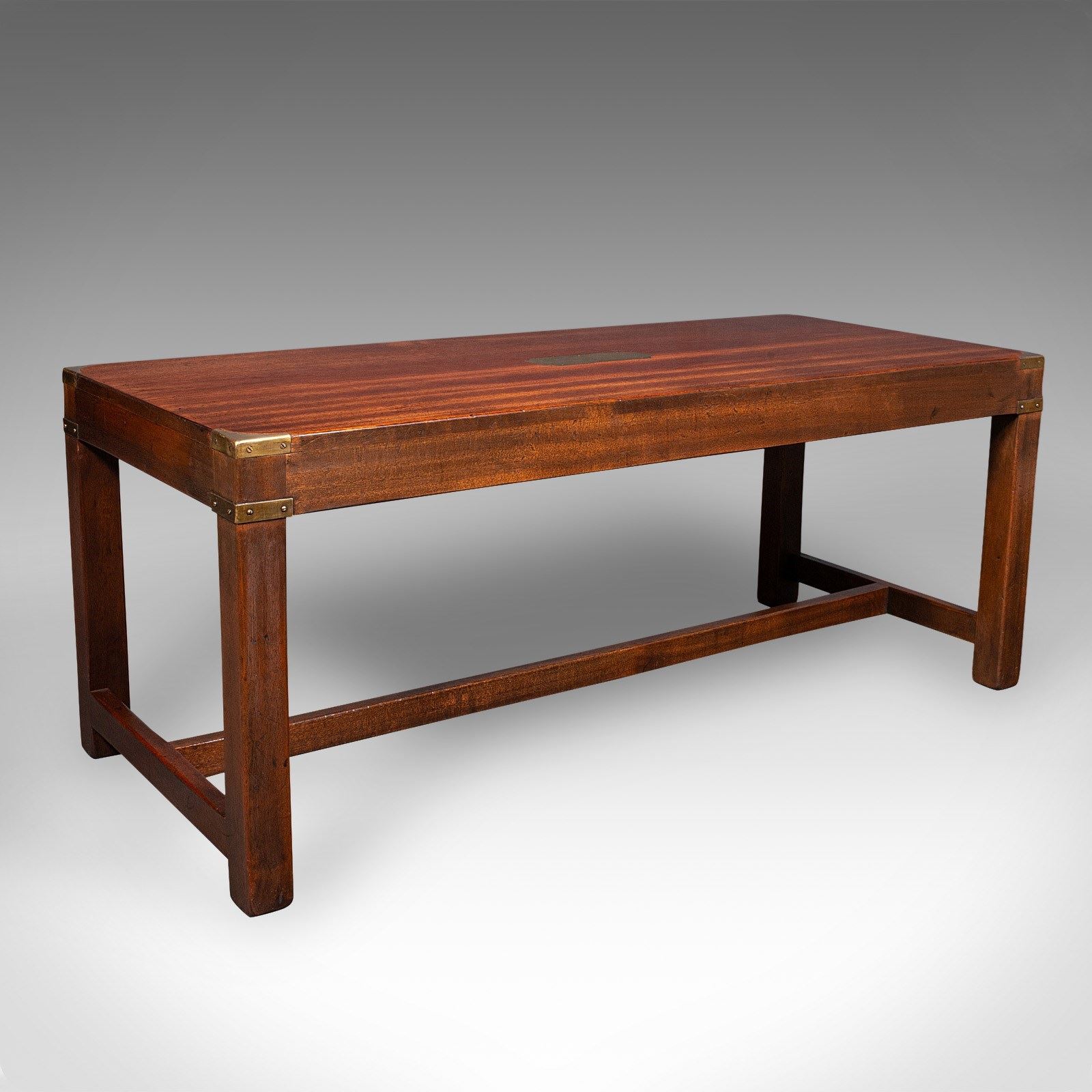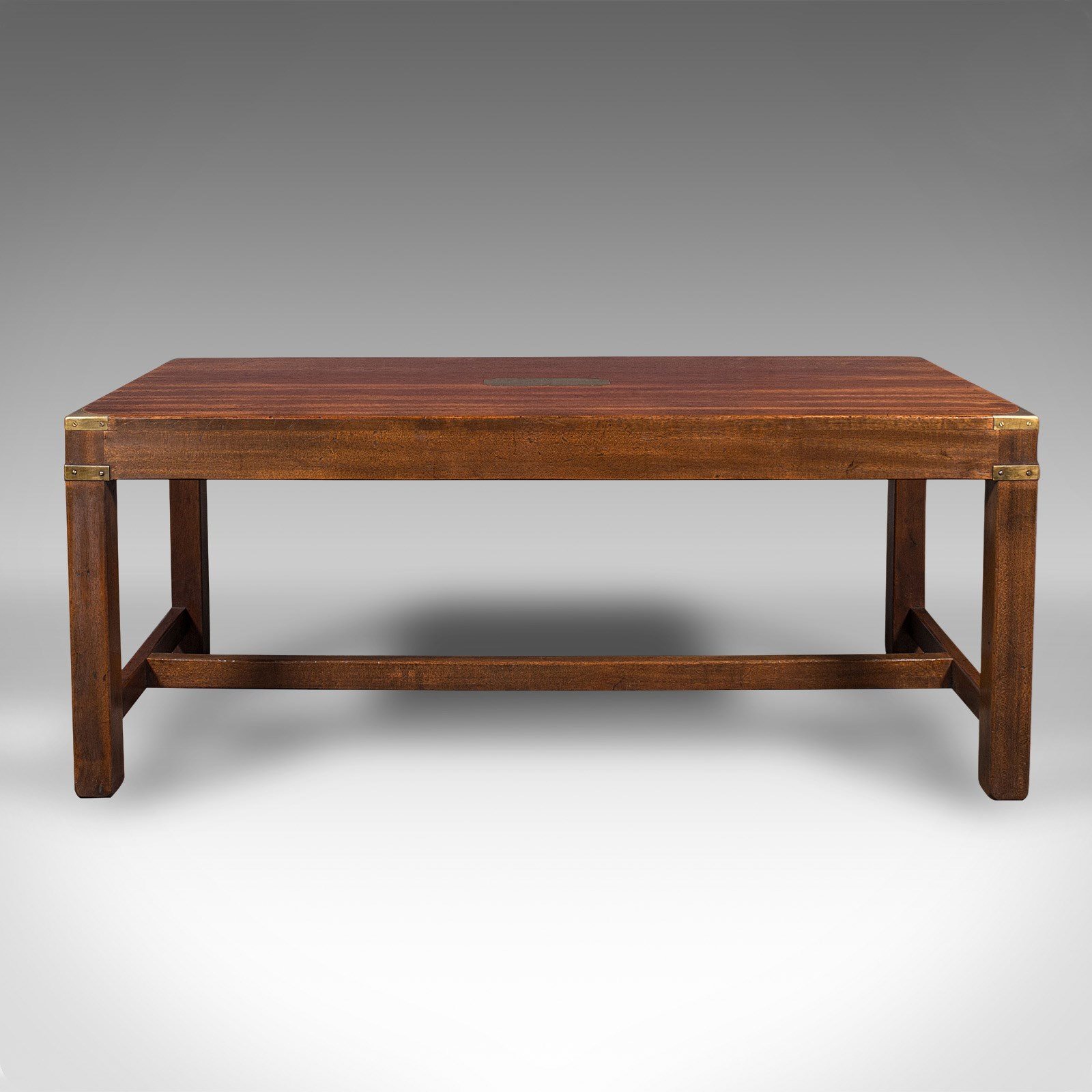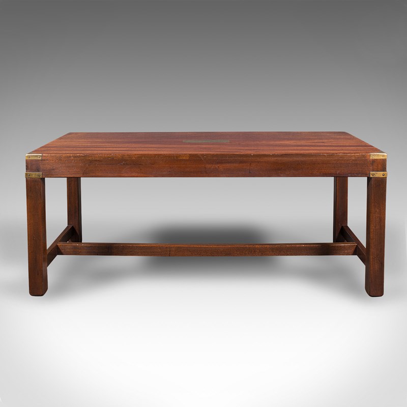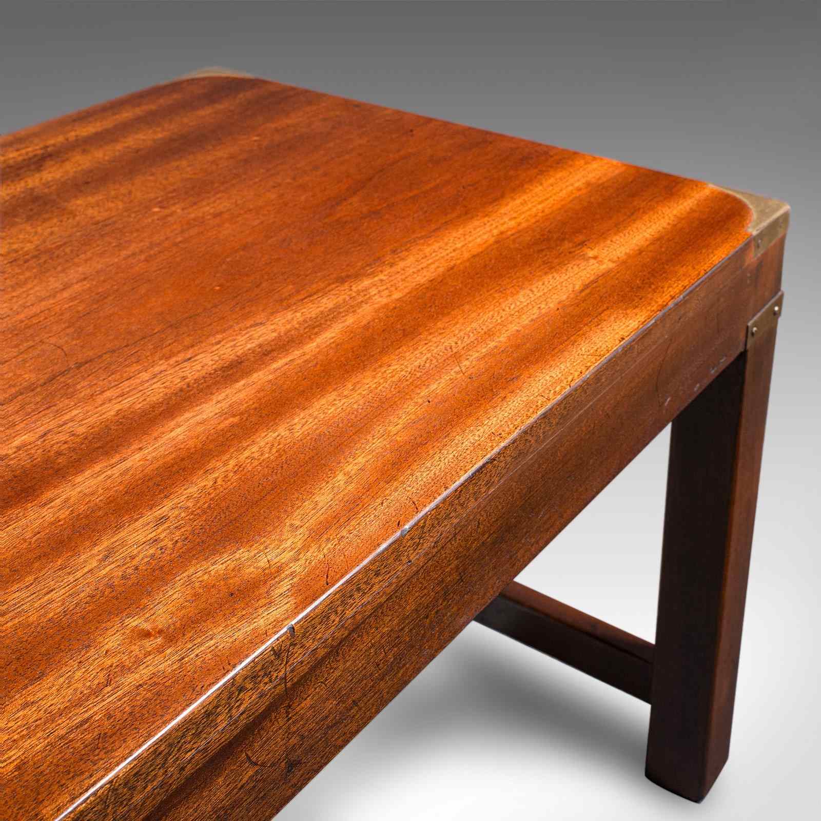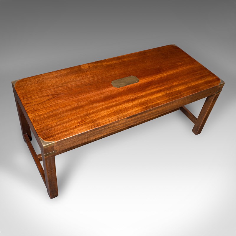 This is a vintage coffee table. An English, mahogany and brass low table in campaign taste, dating to the Art Deco period, circa 1930. With confident proportions and refined detailing, this table offers an attractive centrepiece for the lounge or drawing room.