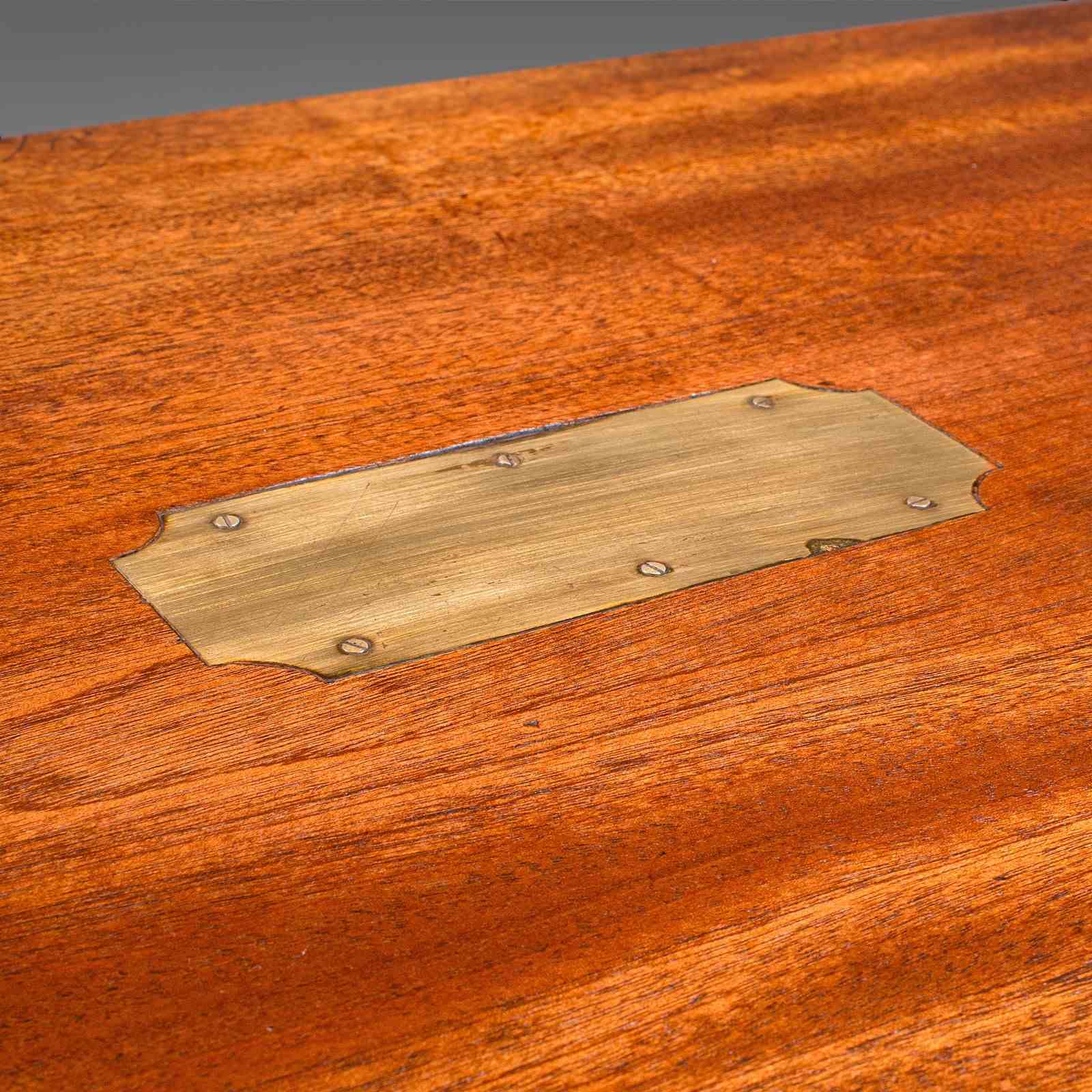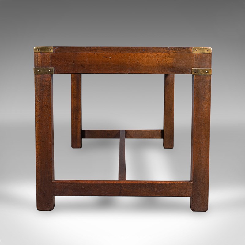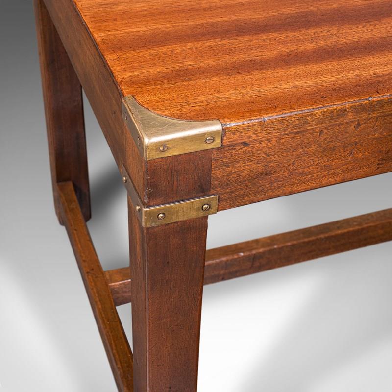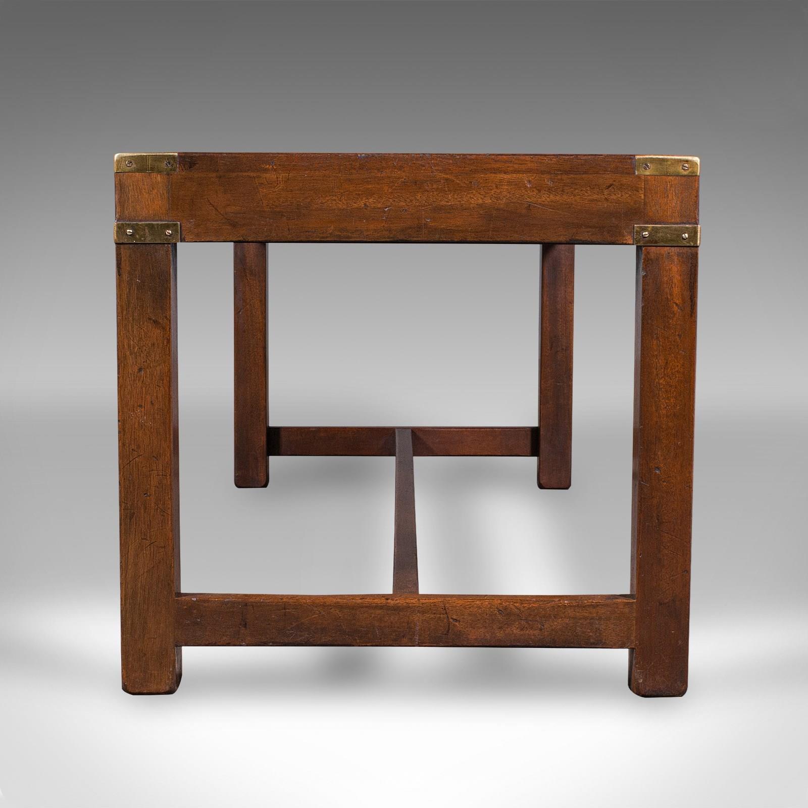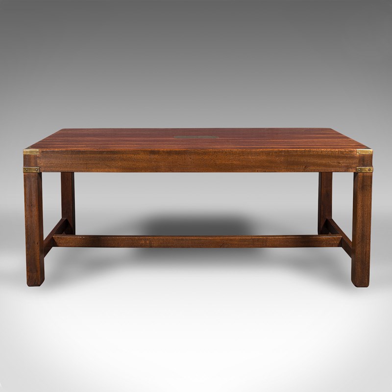 This is a vintage coffee table. An English, mahogany and brass low table in campaign taste, dating to the Art Deco period, circa 1930. With confident proportions and refined detailing, this table offers an attractive centrepiece for the lounge or drawing room.