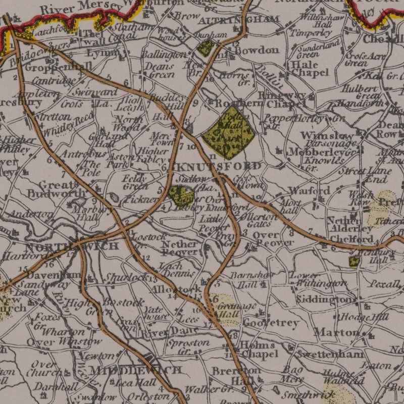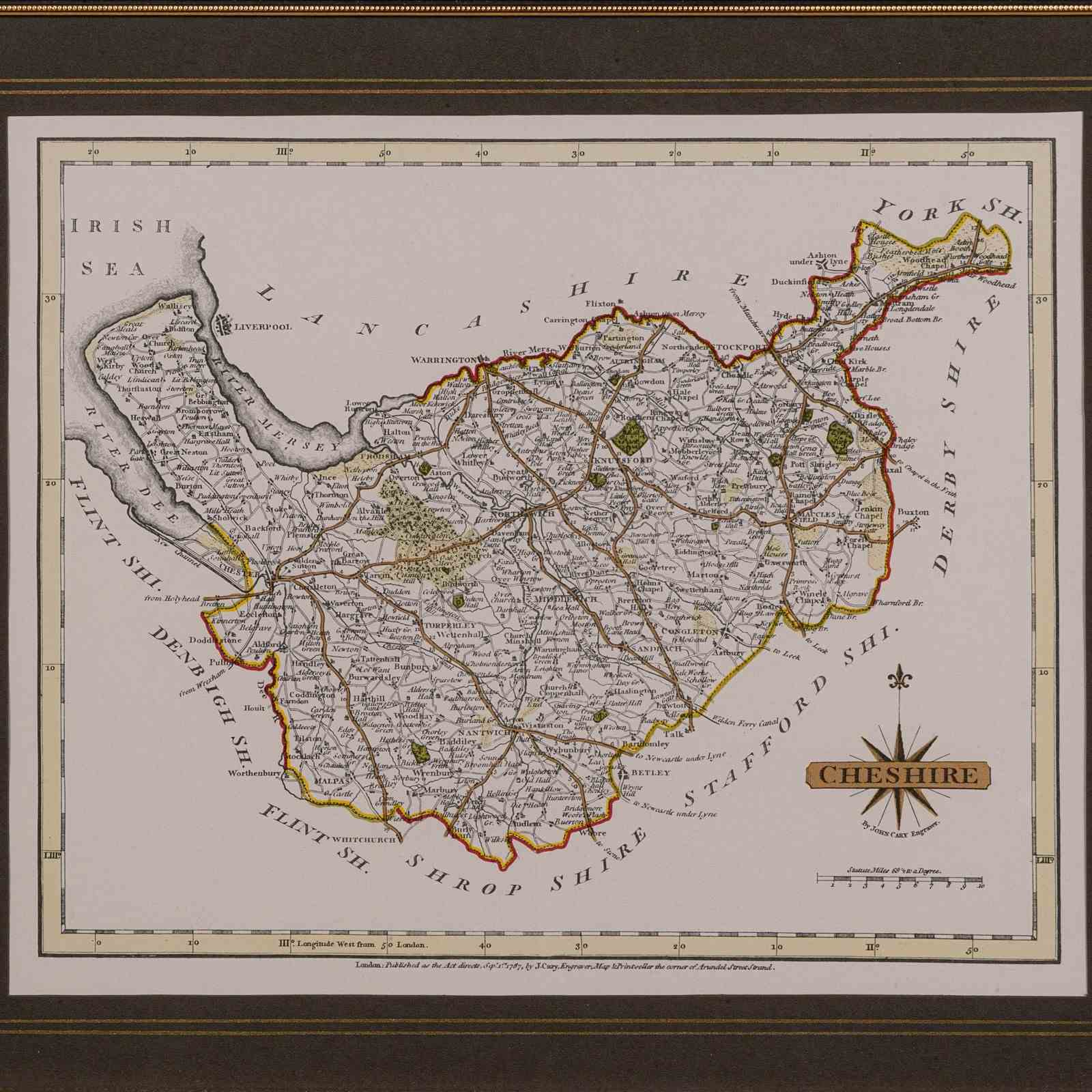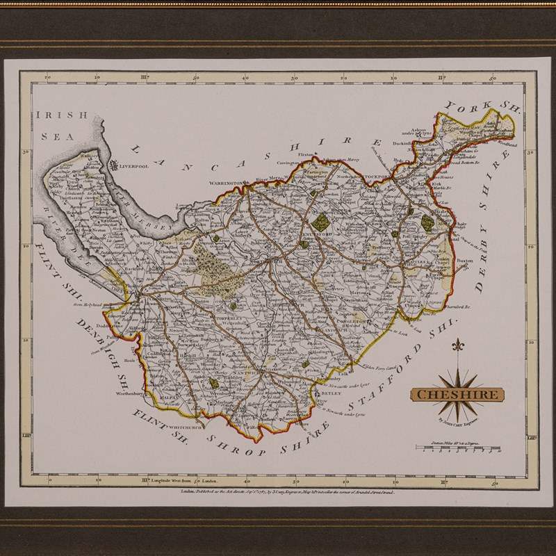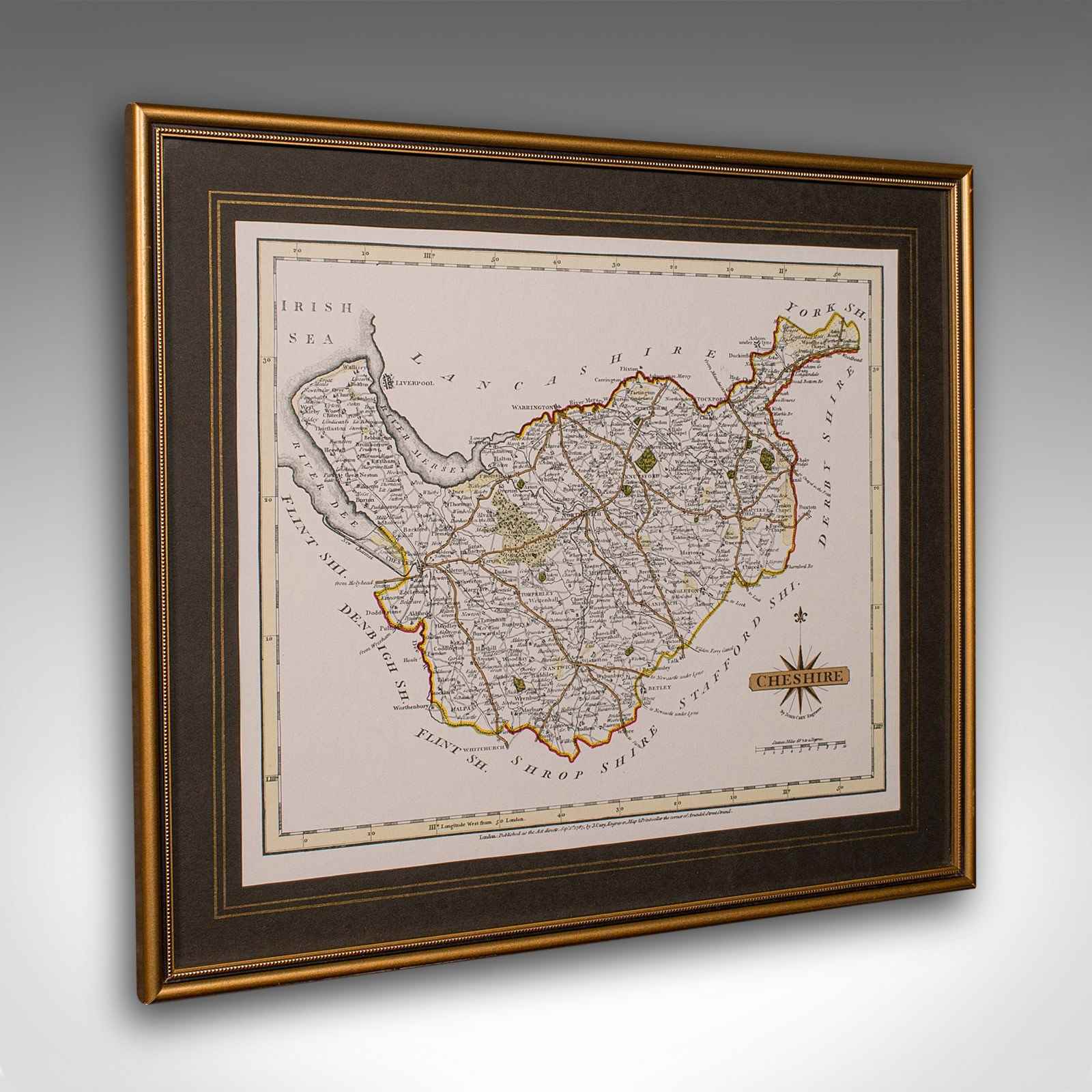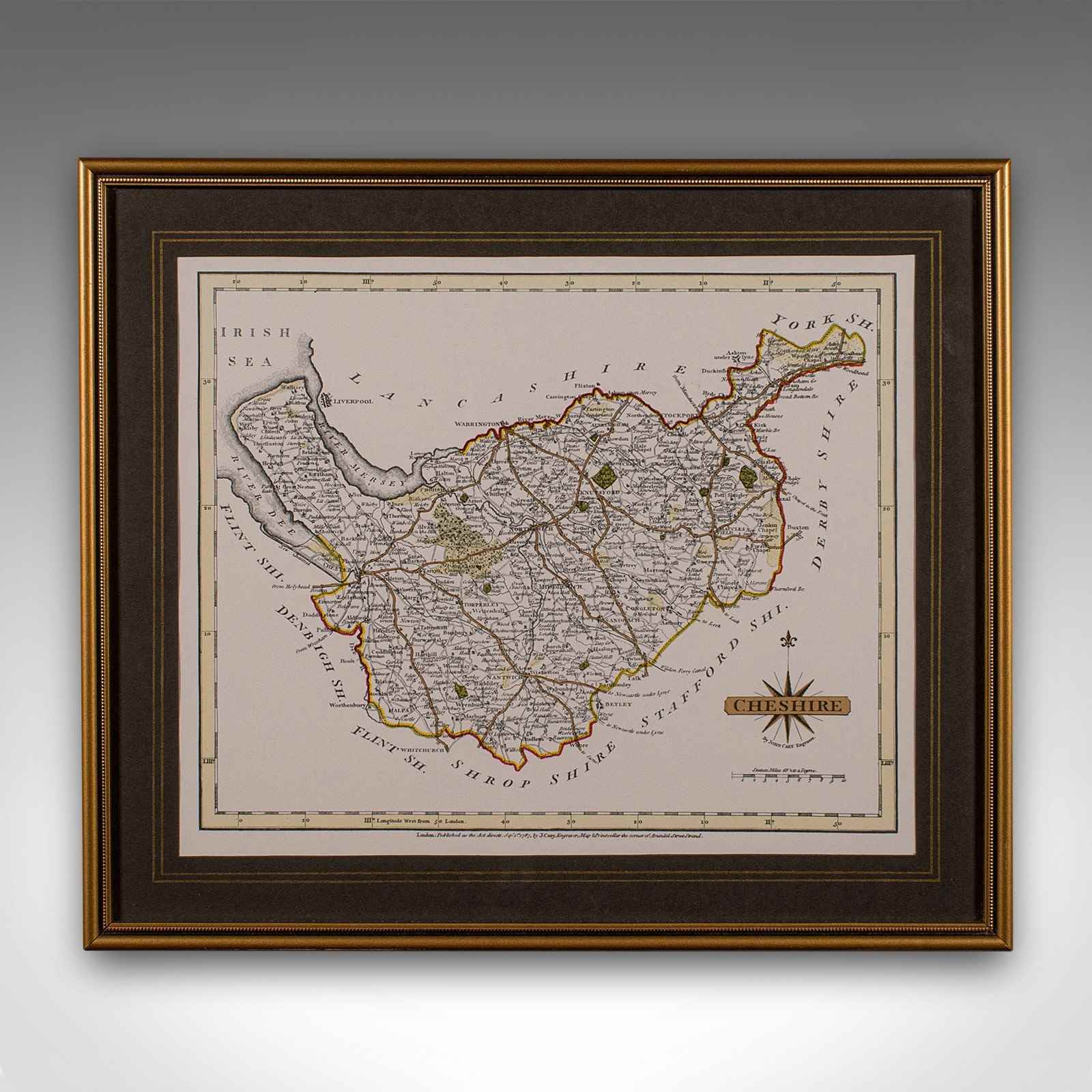 This is a vintage Cheshire map, a fine reproduction of John Cary’s late 18th century cartography, and presented within a smart glazed frame.