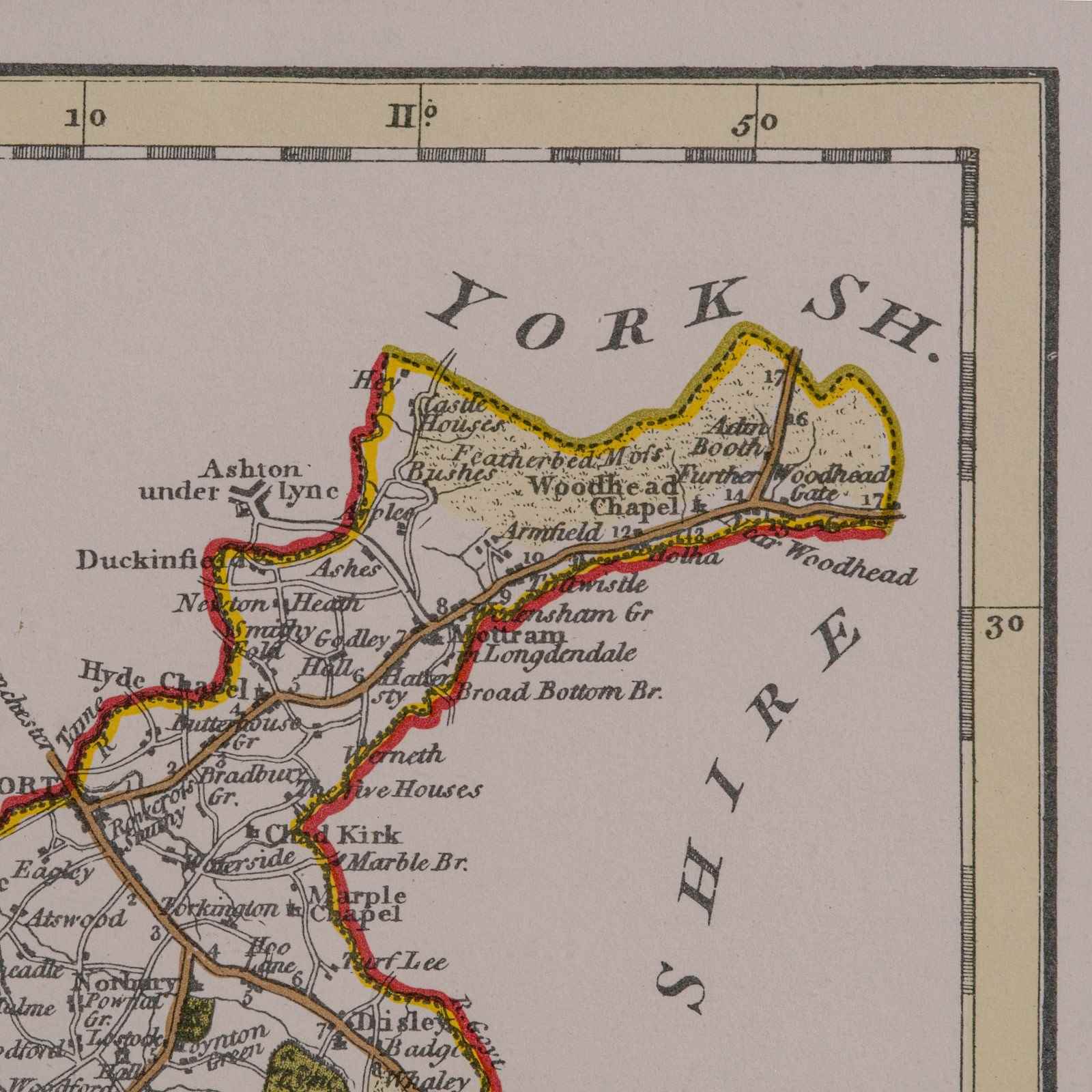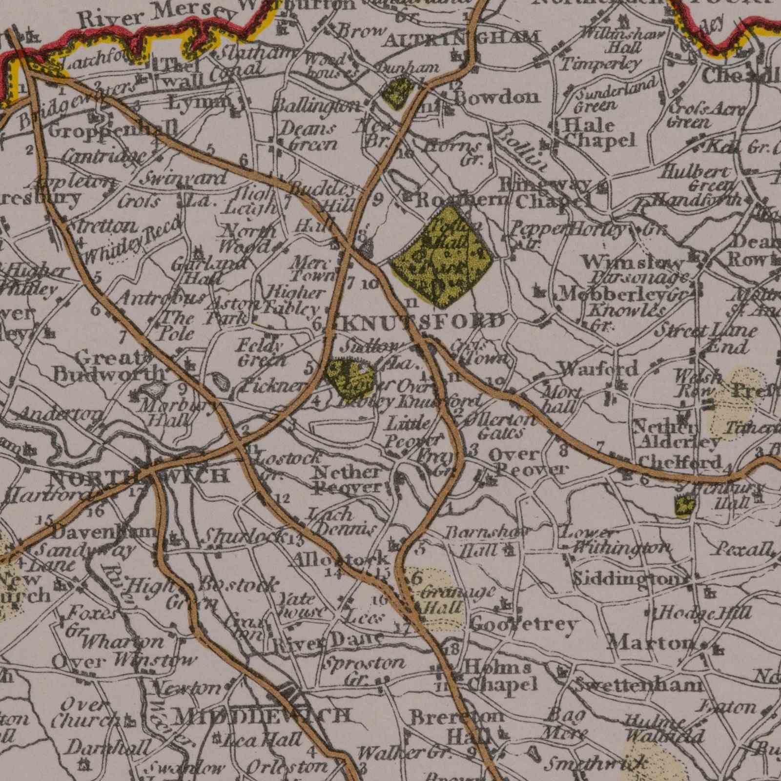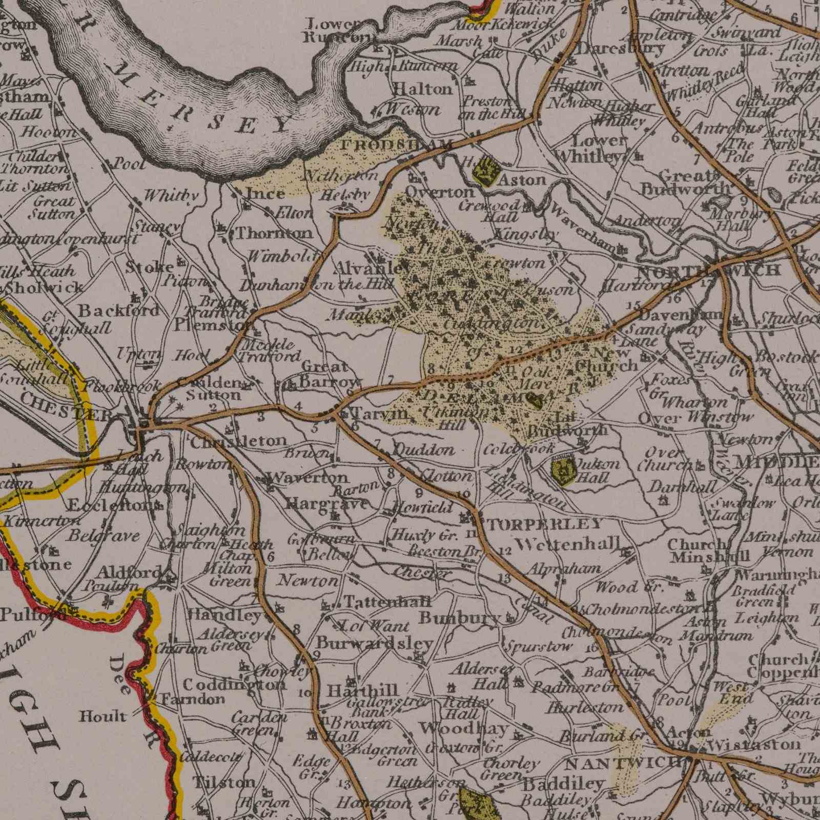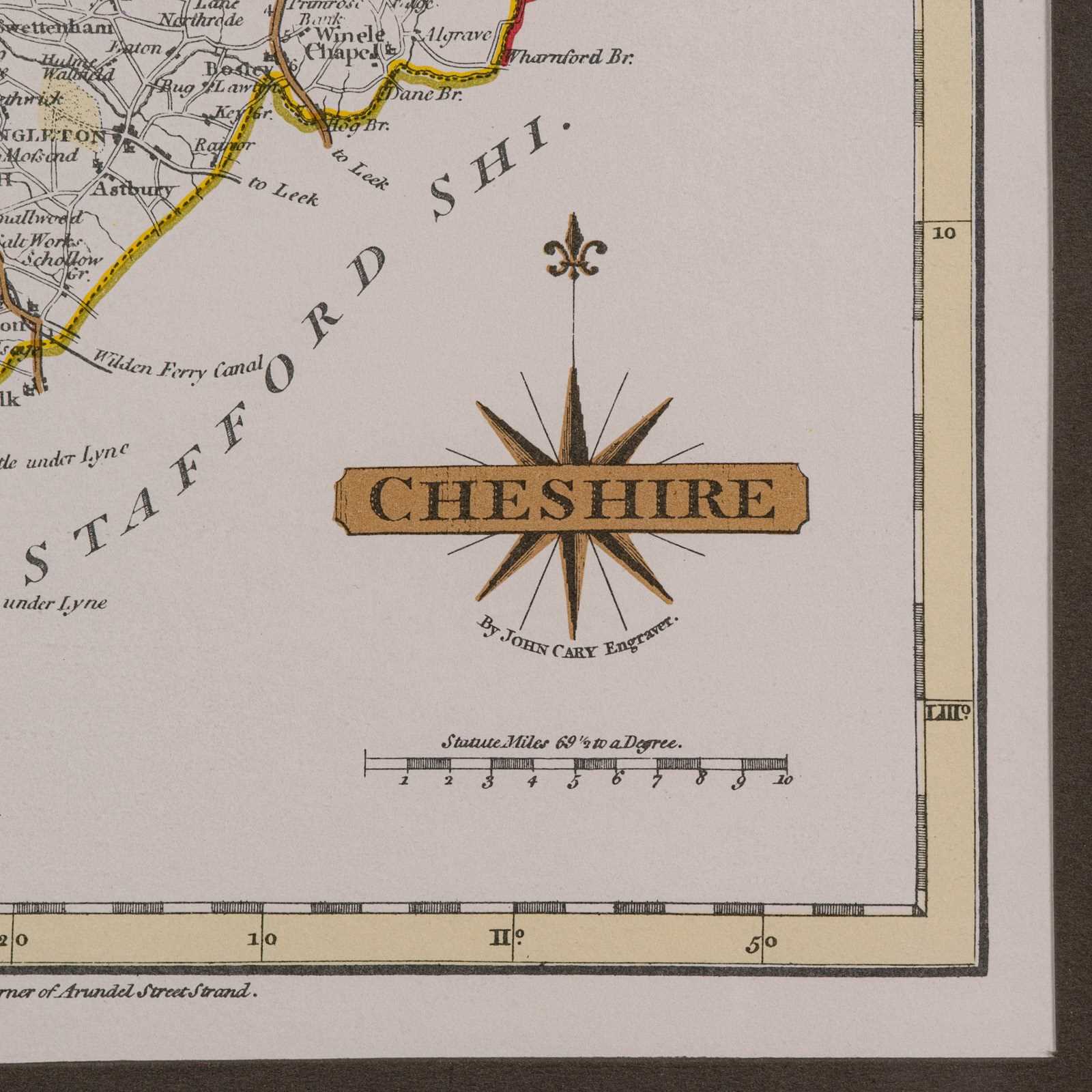 This is a vintage Cheshire map, a fine reproduction of John Cary’s late 18th century cartography, and presented within a smart glazed frame.
