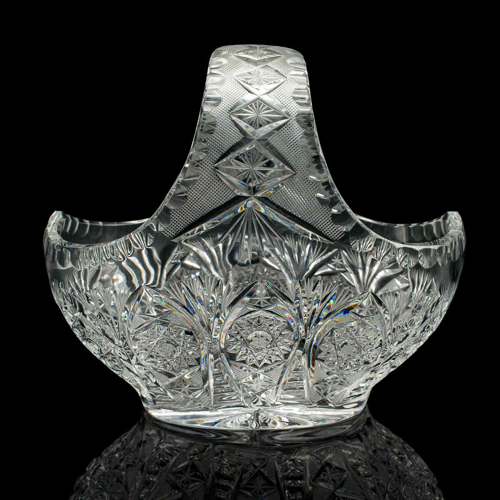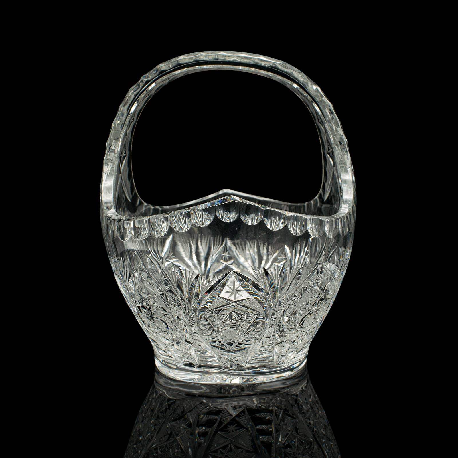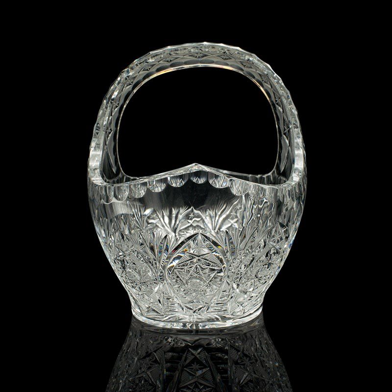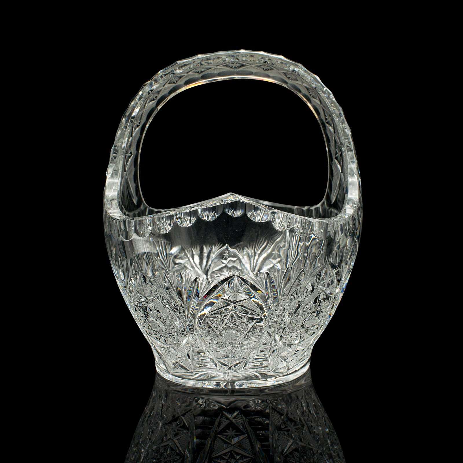 This is a vintage crystal fruit trug. An English, cut crystal glass decorative basket, dating to the mid 20th century, circa 1950.