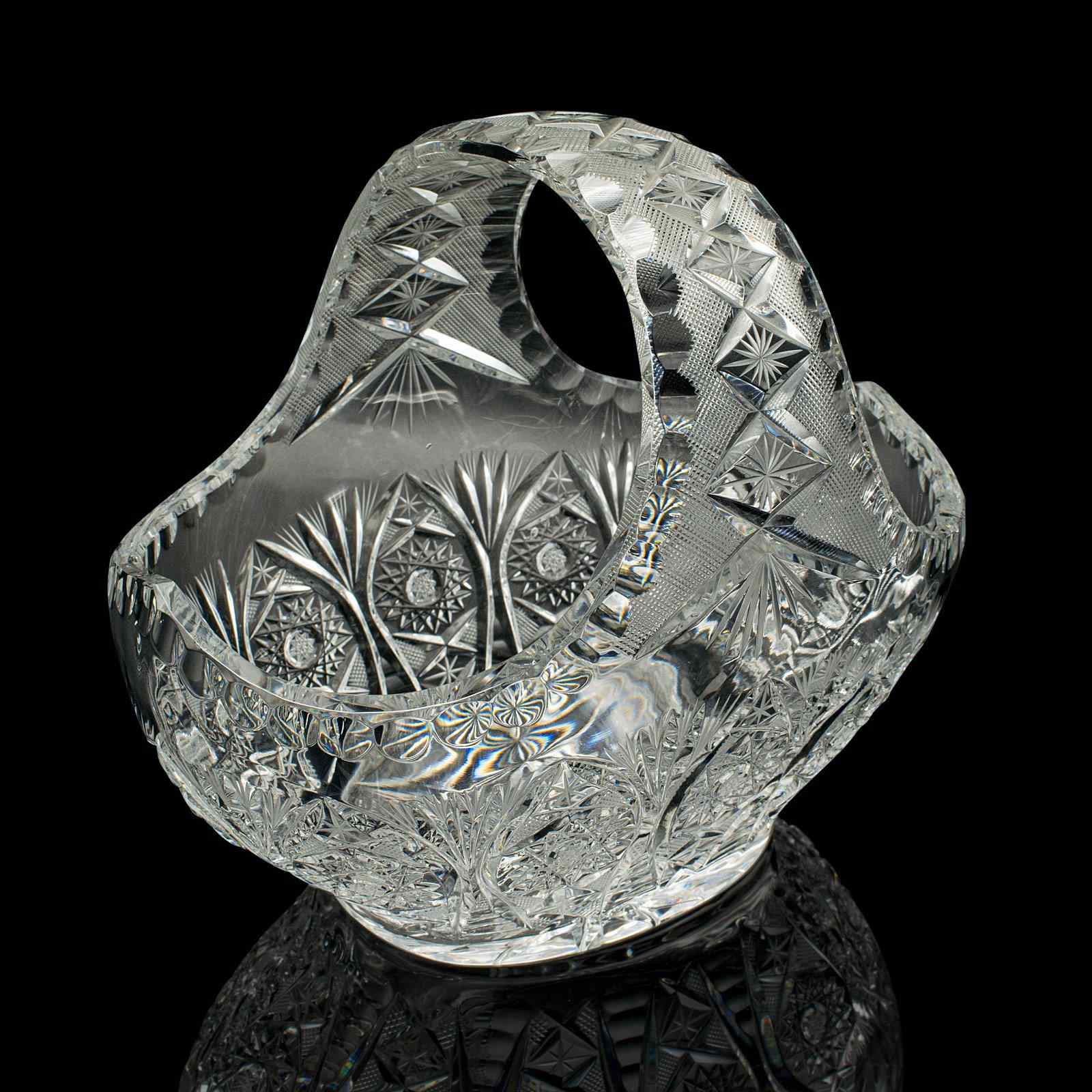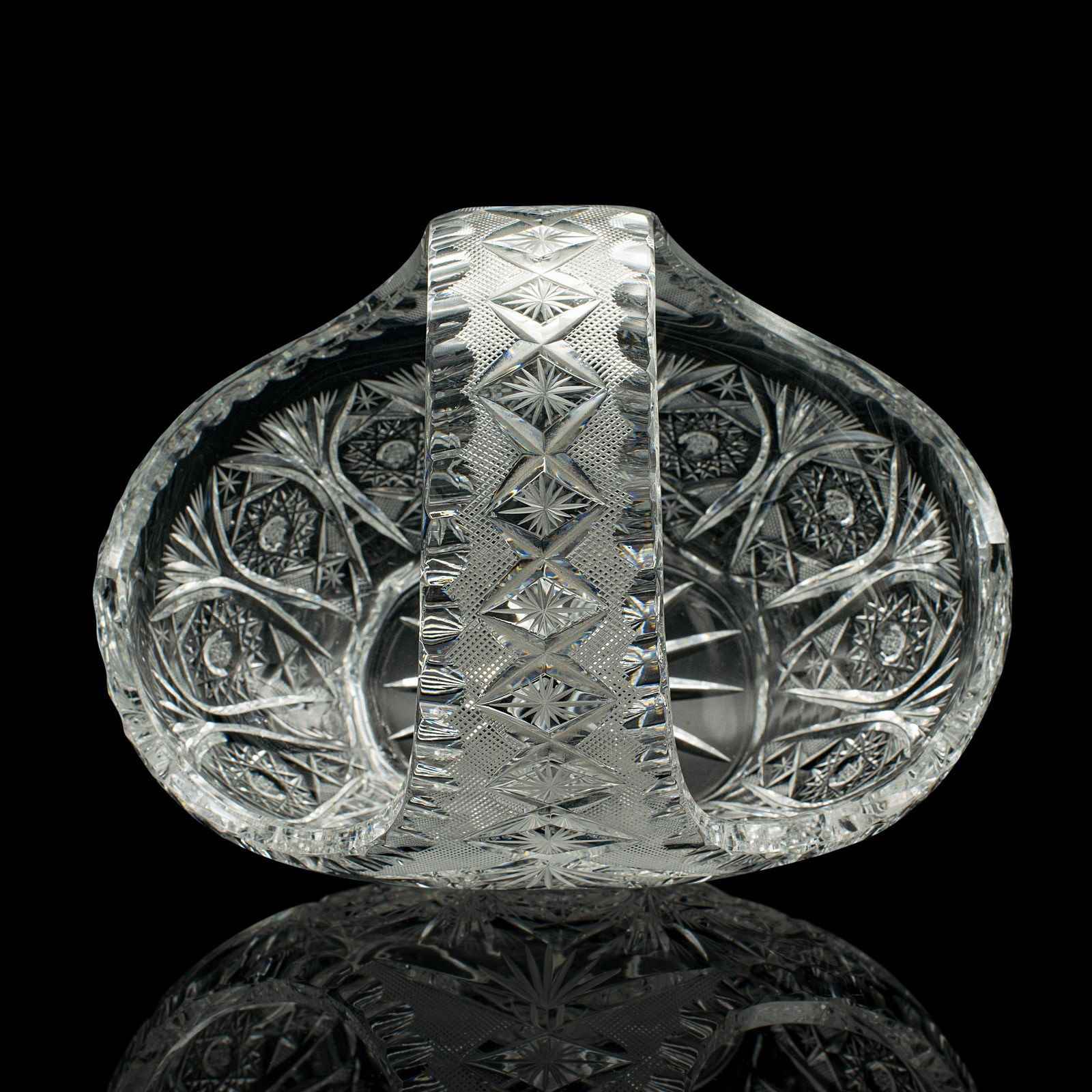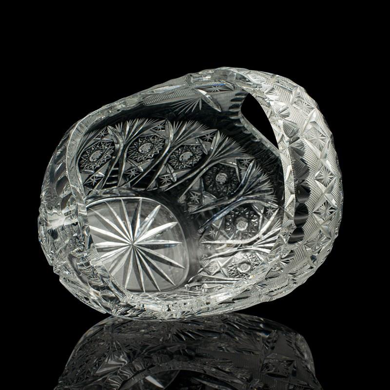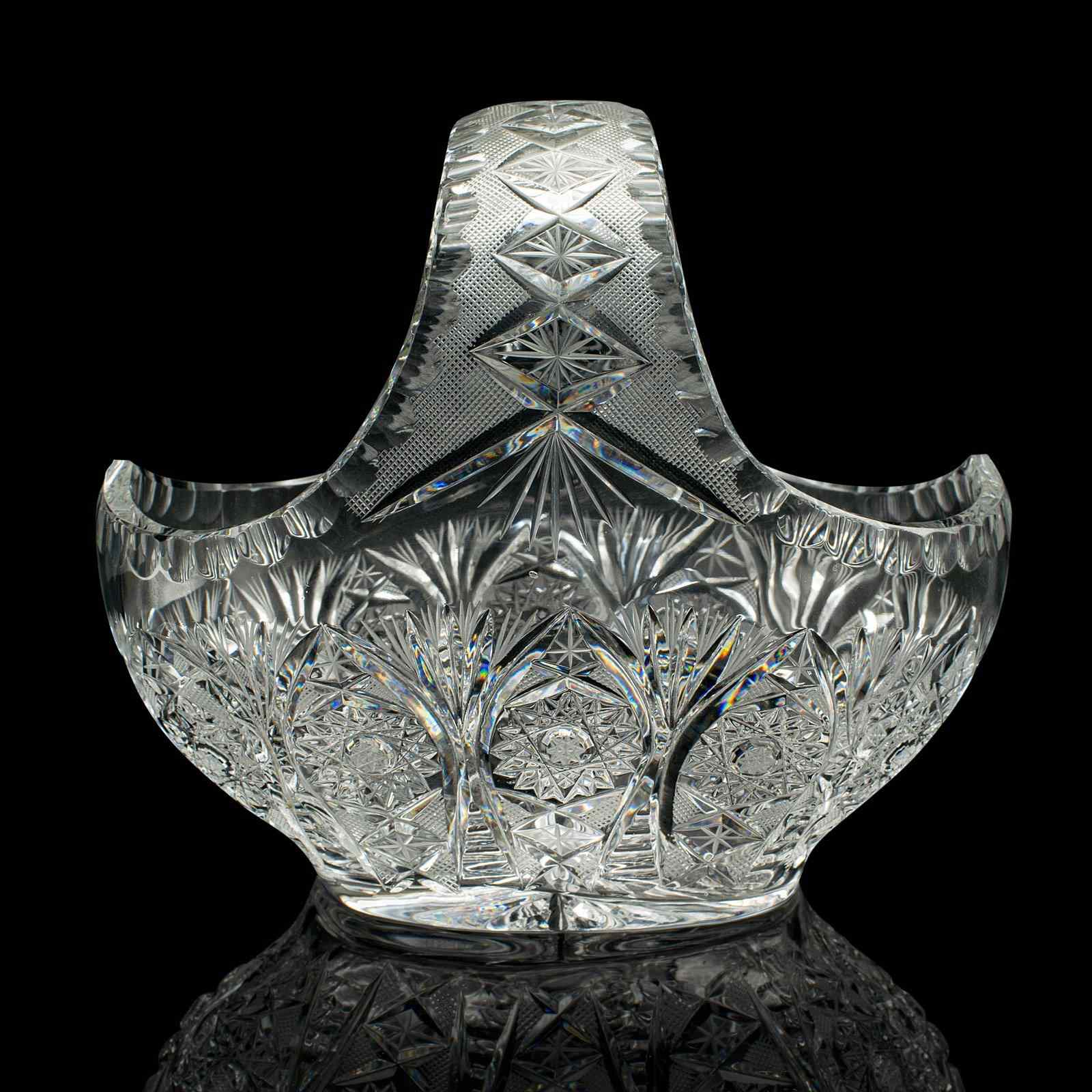 This is a vintage crystal fruit trug. An English, cut crystal glass decorative basket, dating to the mid 20th century, circa 1950.