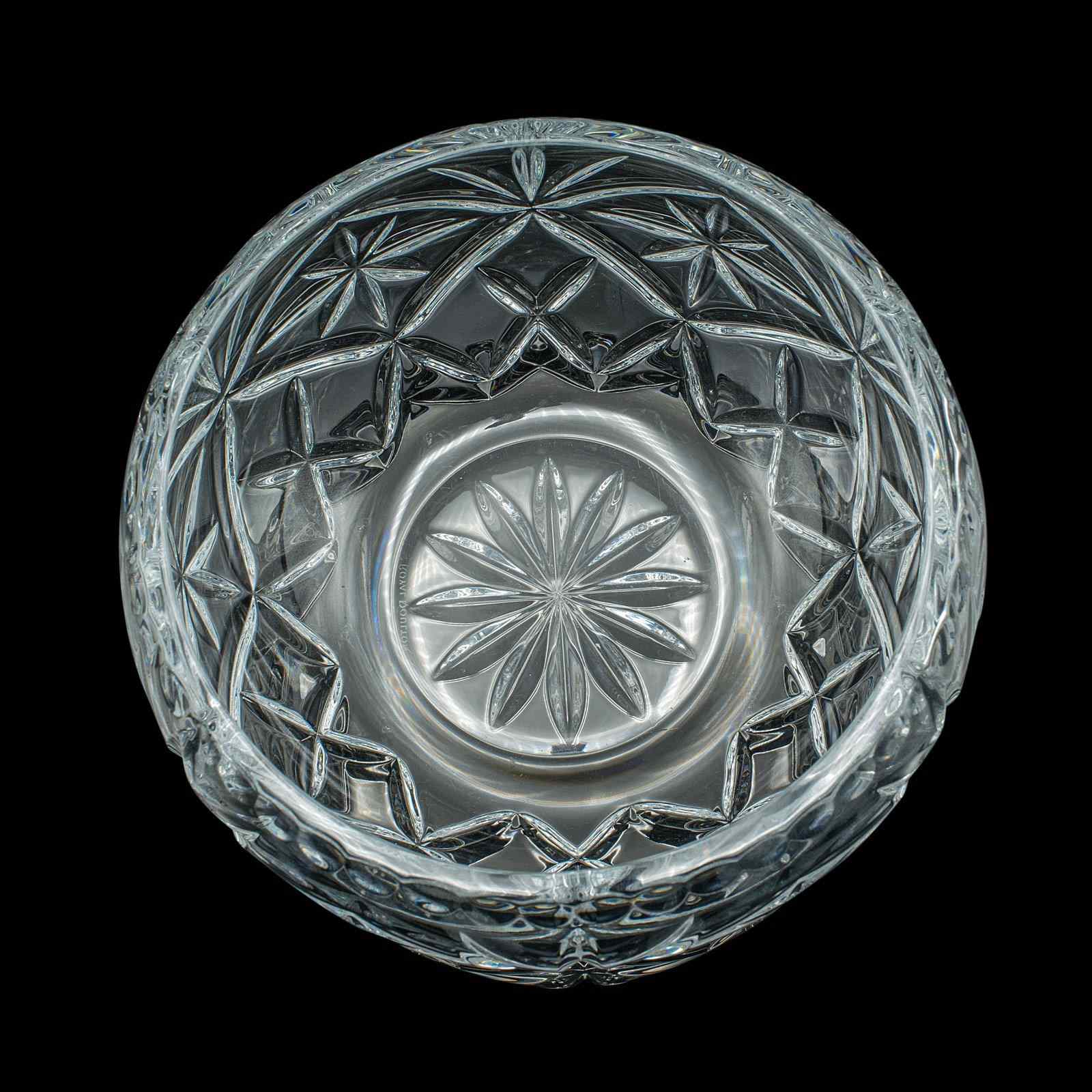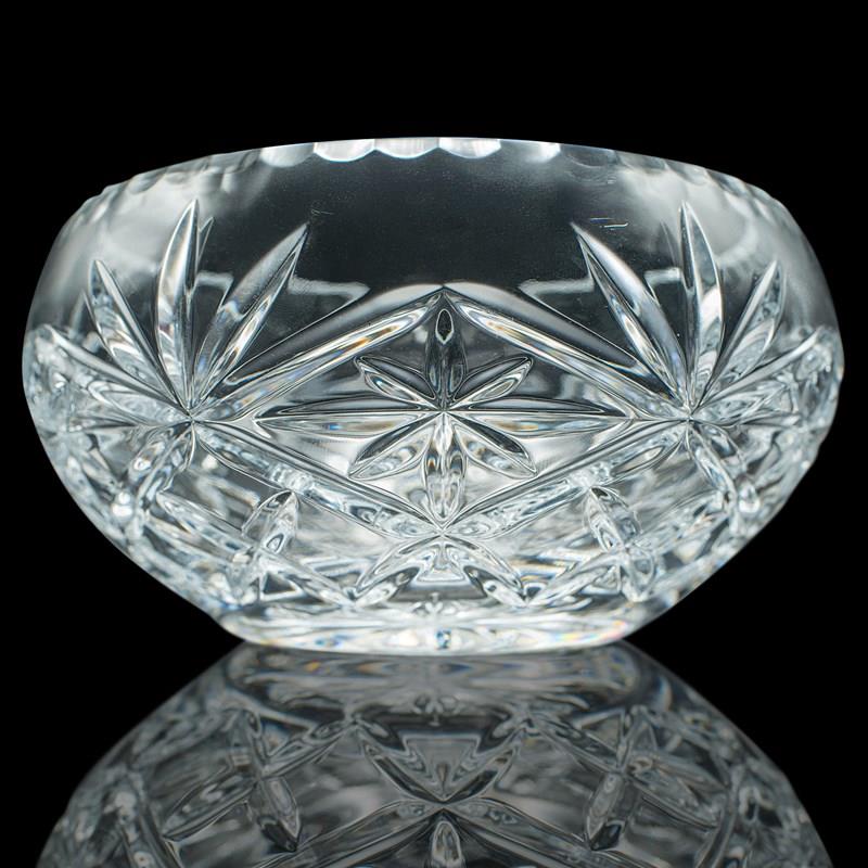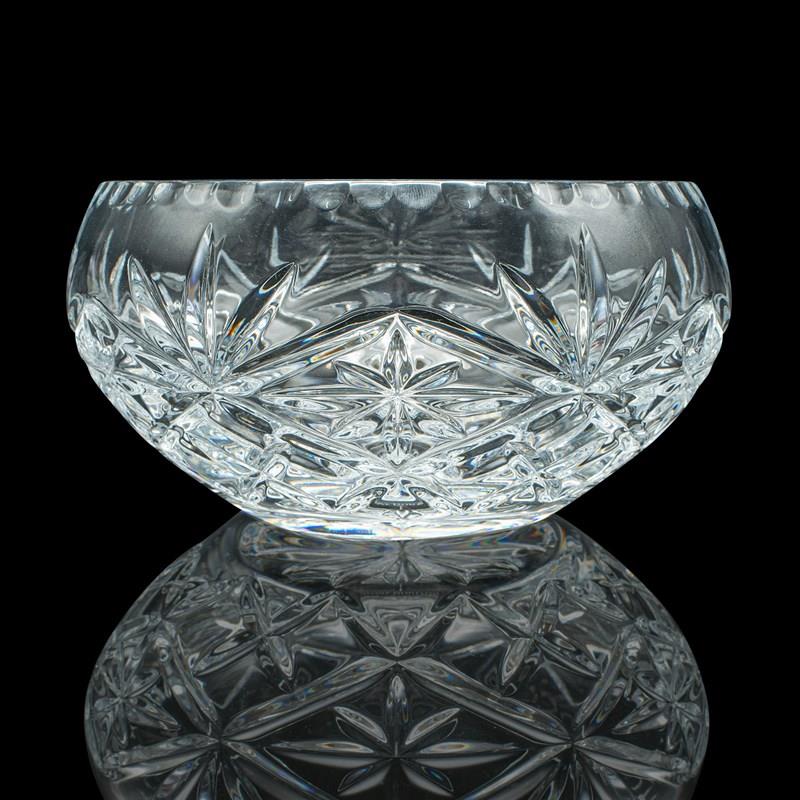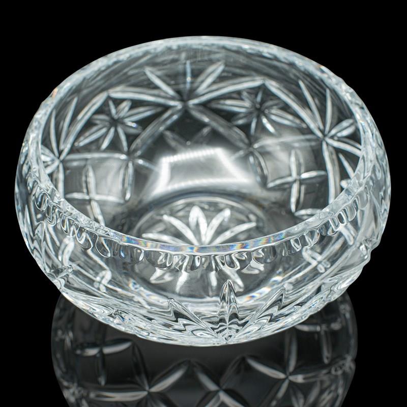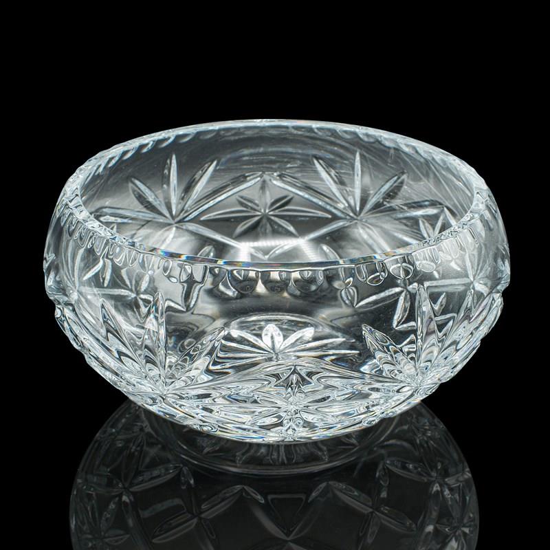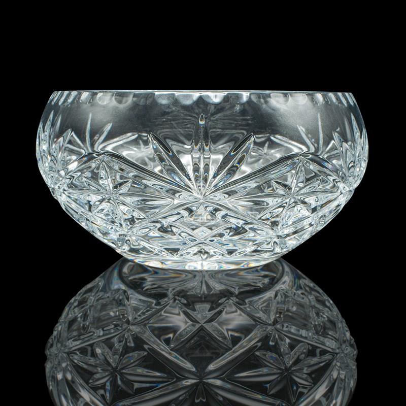 This is a vintage decorative fruit bowl. An English, cut crystal glass serving dish, dating to the late 20th century, circa 1990.