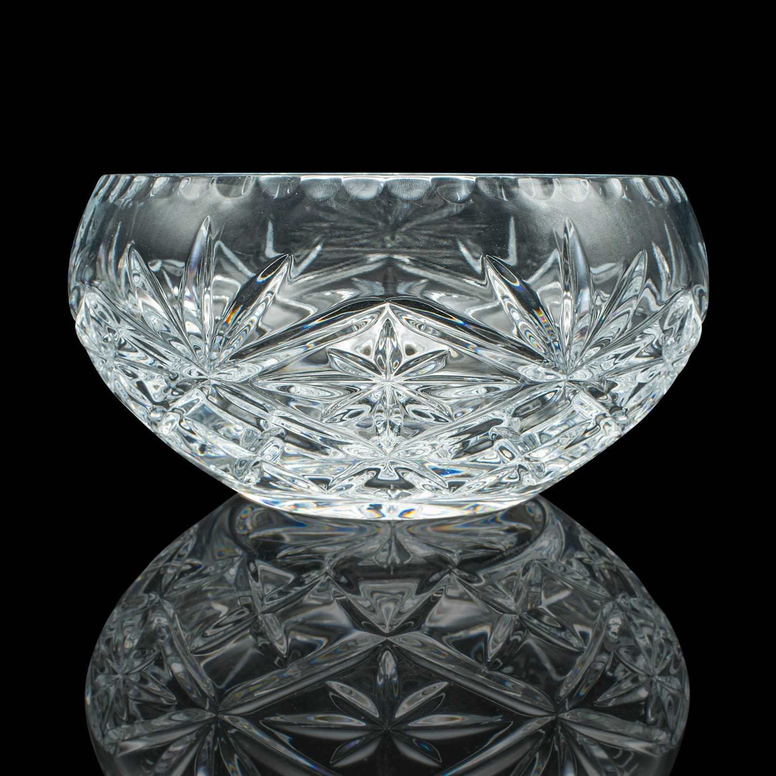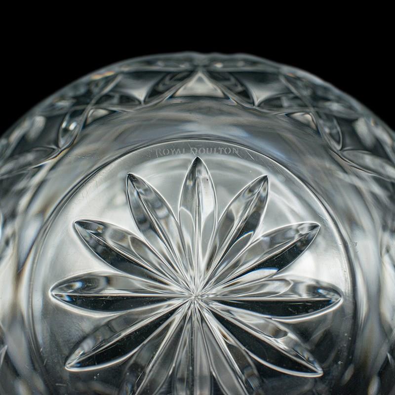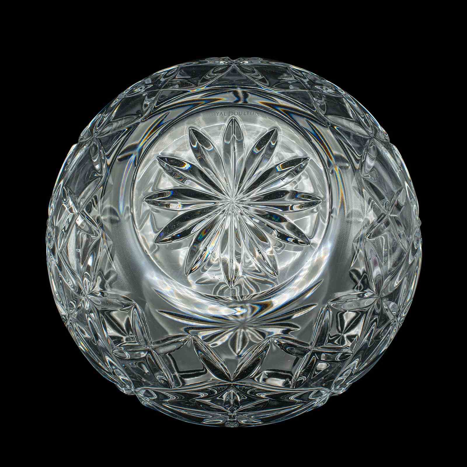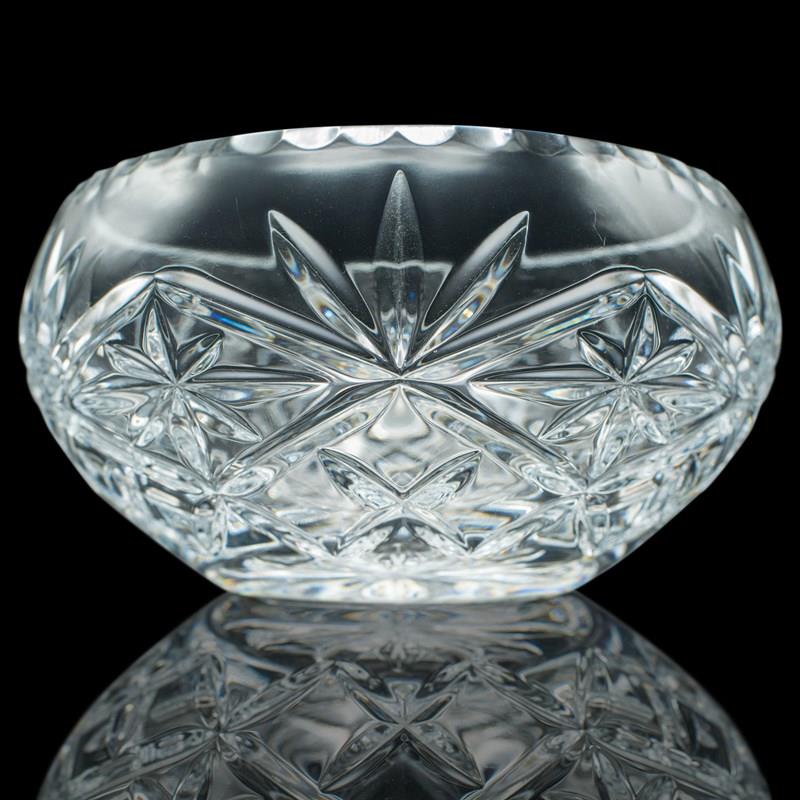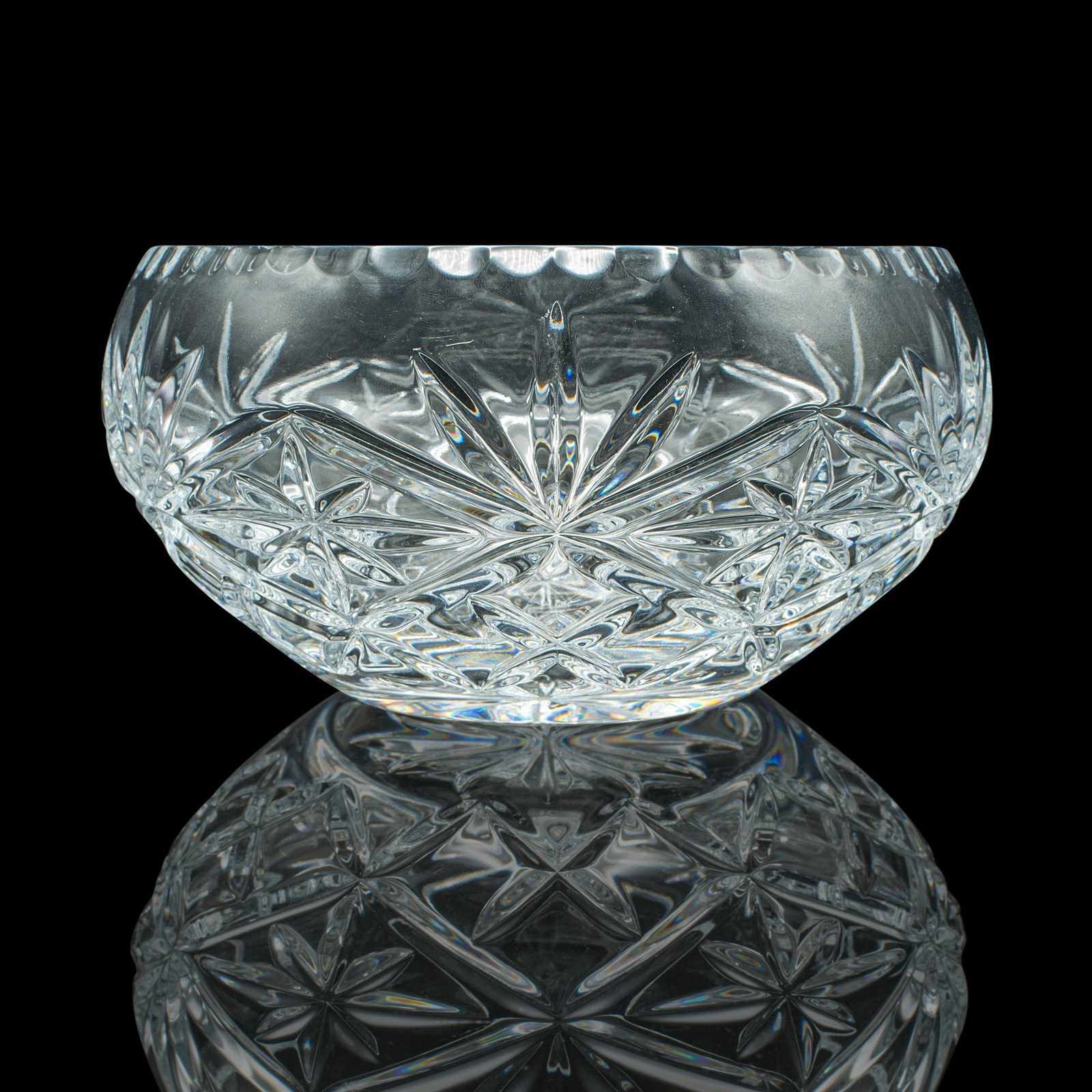 This is a vintage decorative fruit bowl. An English, cut crystal glass serving dish, dating to the late 20th century, circa 1990.