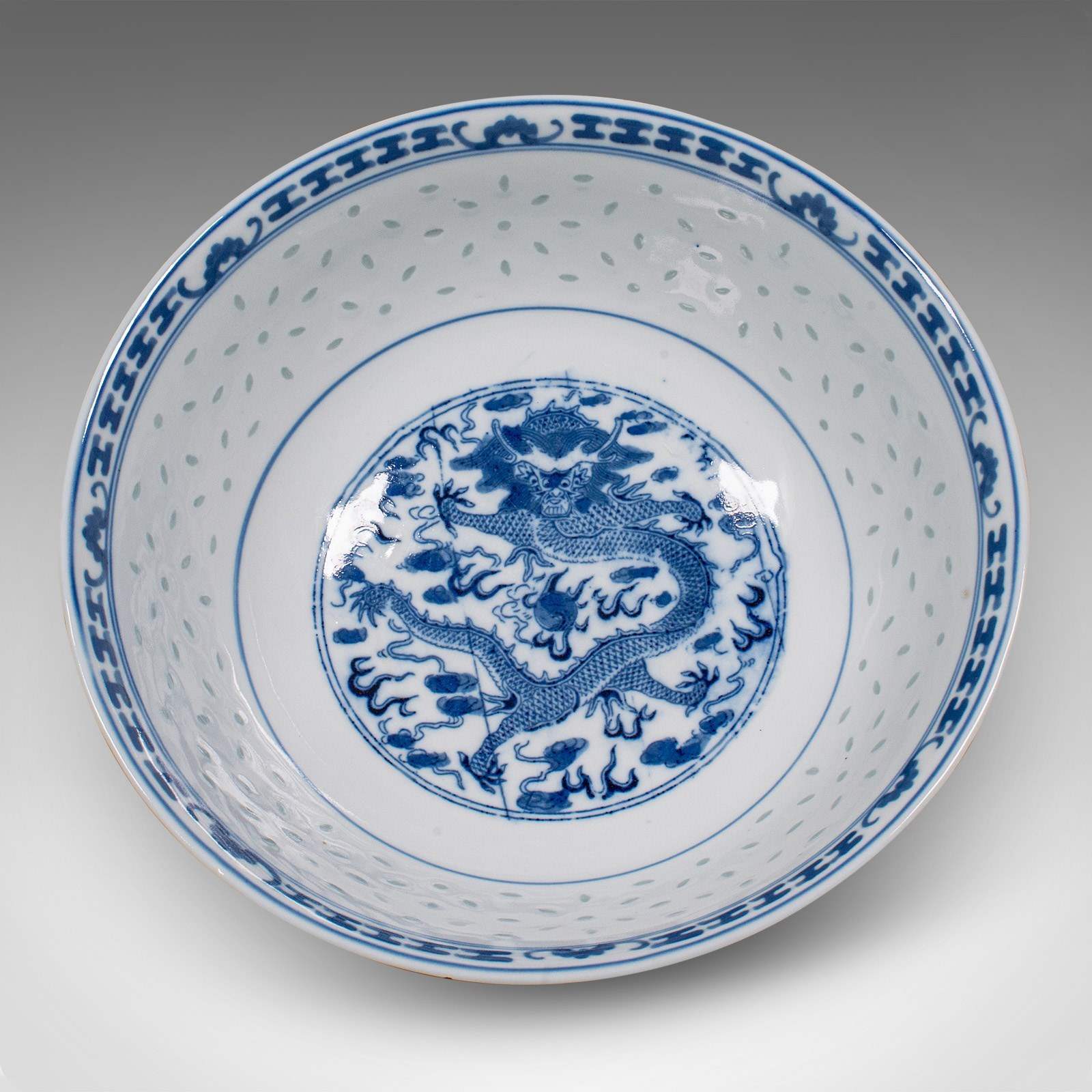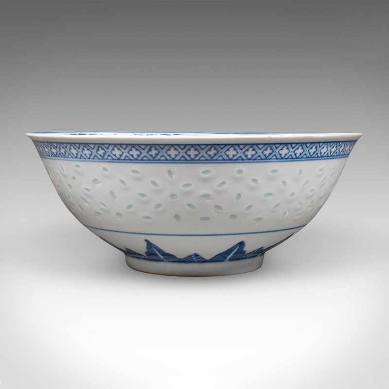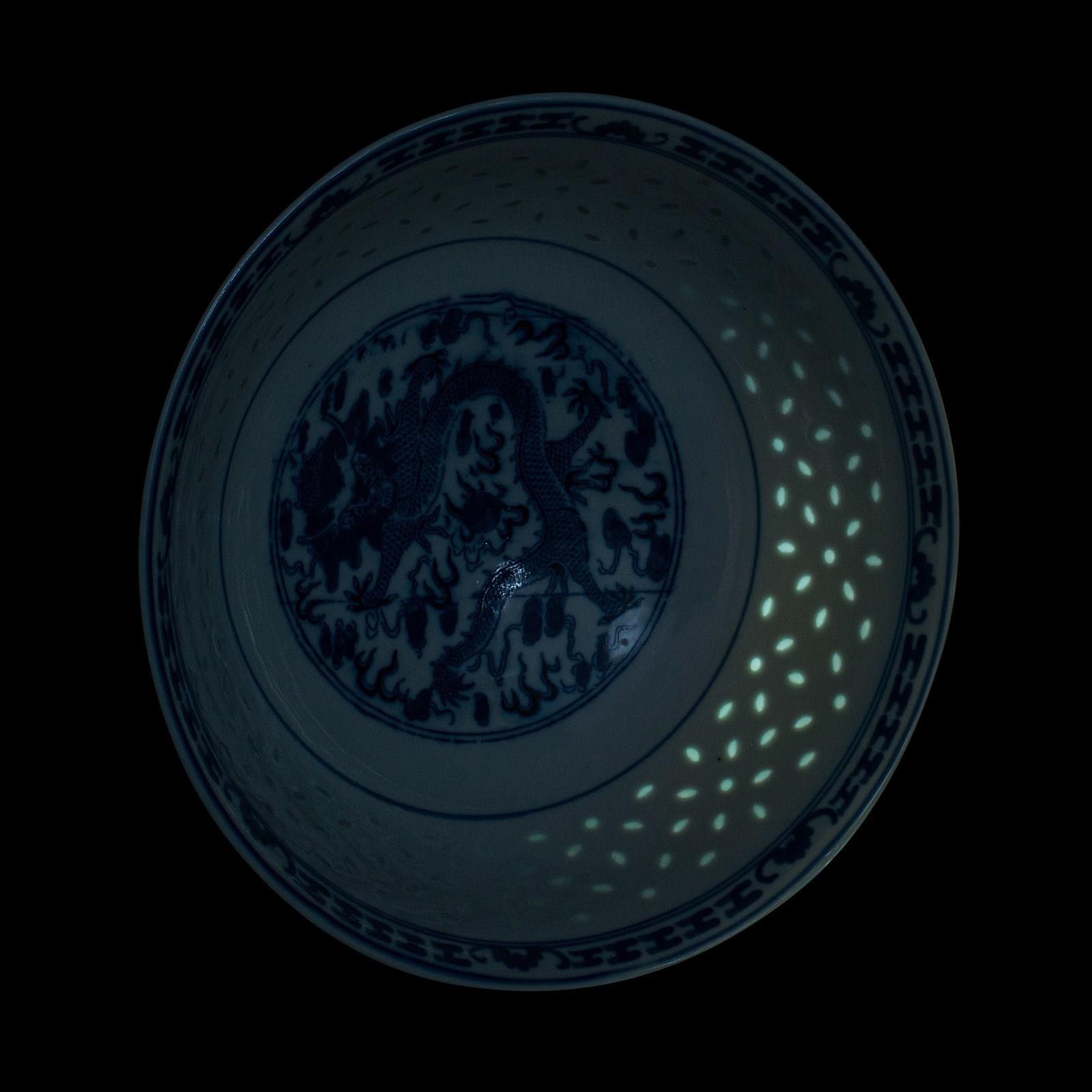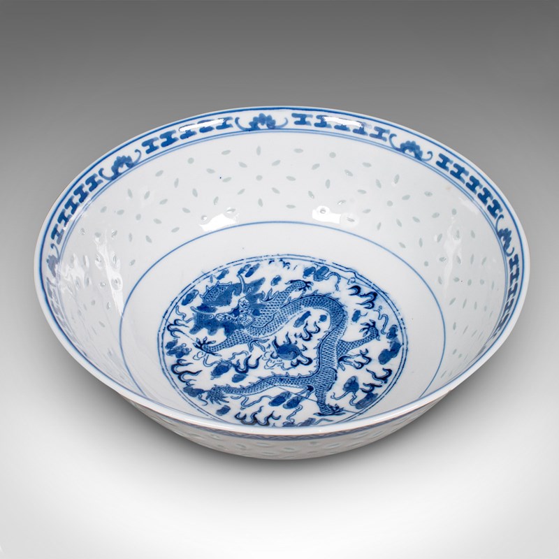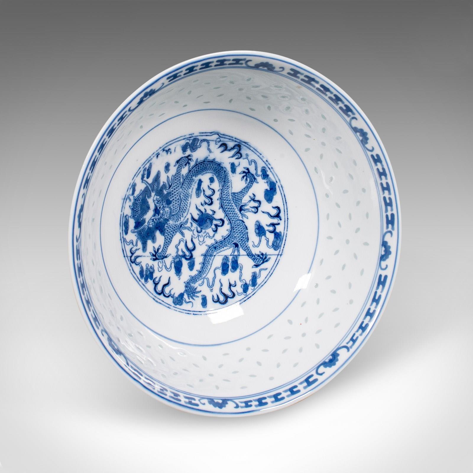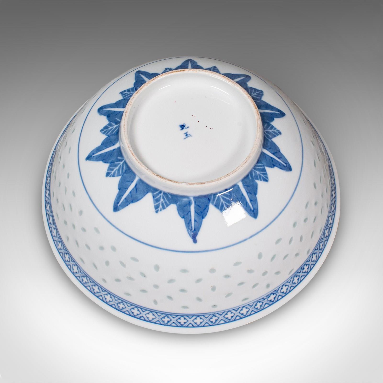 This is a vintage display bowl. An Oriental, ceramic decorative serving dish, dating to the Art Deco period, circa 1930. A charming example of early 20th century craftsmanship, showcasing traditional blue on white artistry and refined translucence.
