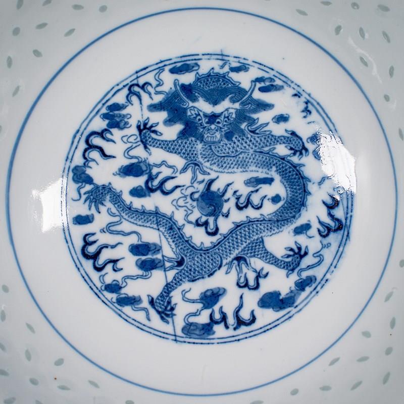 Central dragon motif with expressive, classic Oriental detail in classic blue and white palette