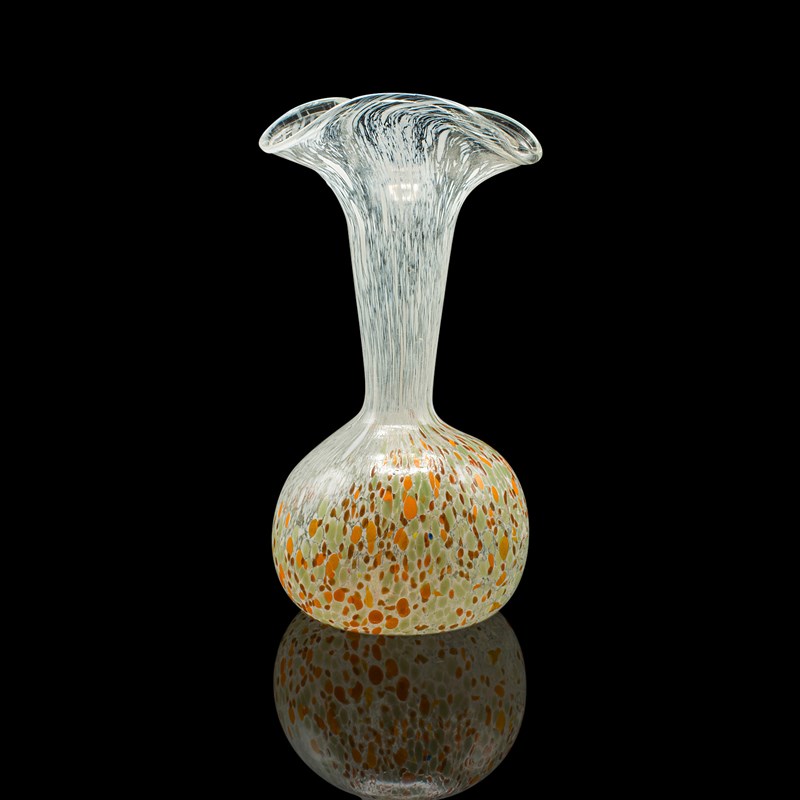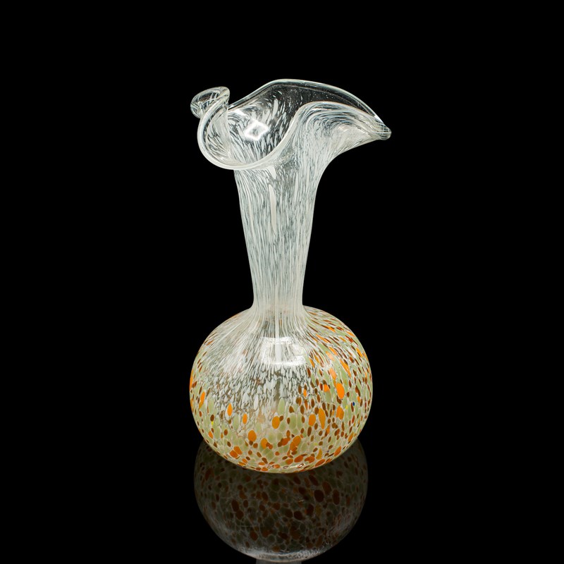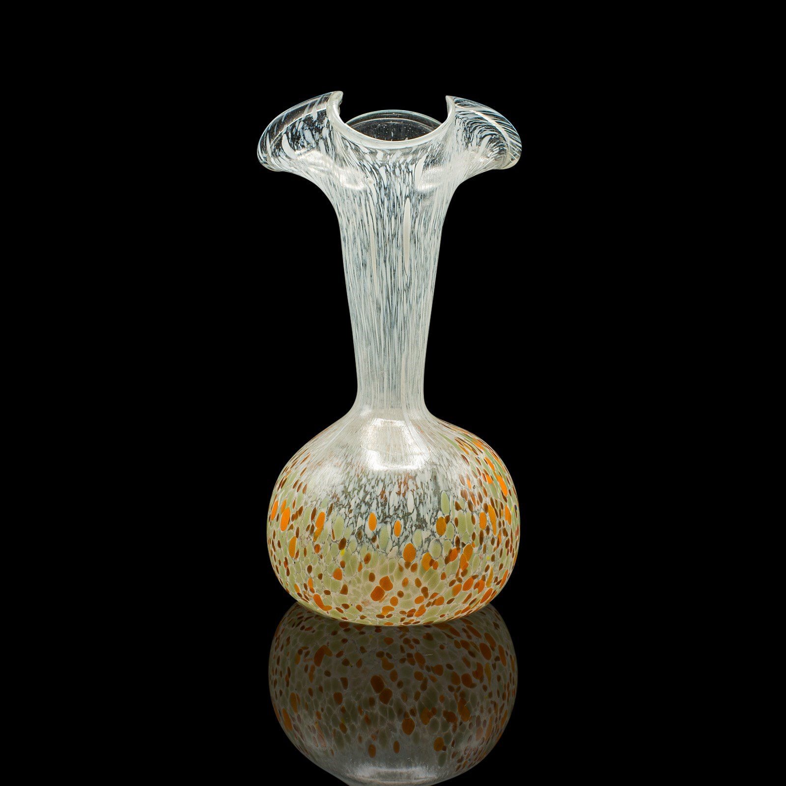 This vintage Continental glass vase presents a vivid decorative statement, offering a collectible and stylish accent for the display cabinet, mantel, or tabletop.